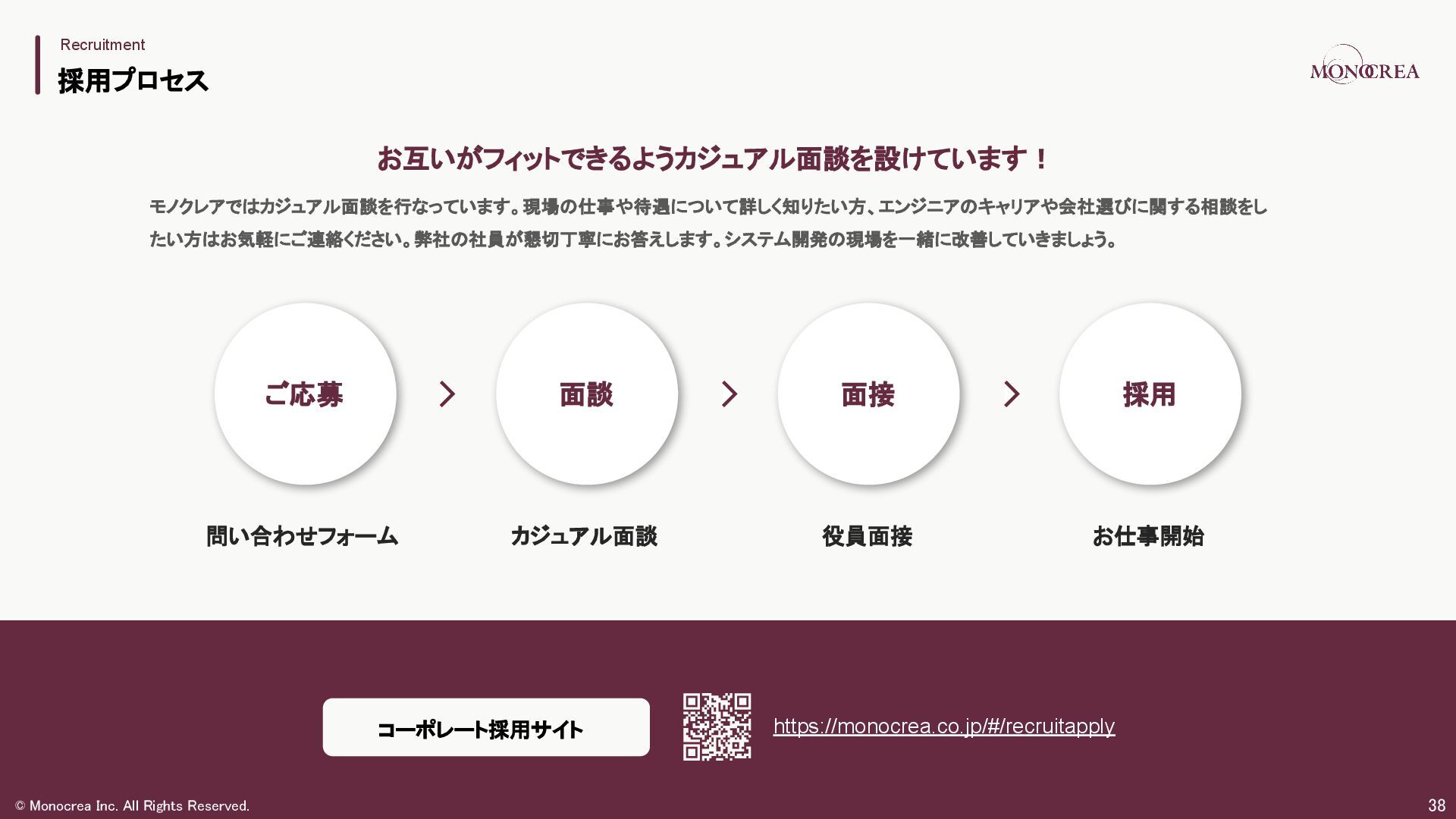 【所在地】 〒101-0031 東京都千代田区東神田 1-2-10 泰岳ビル 4F 【代表】 代表取締役 桑原雄一 【設立】 2010年8月5日 【資本金】 13,000,000円 【従業員数】 44名 (2025年12月現在) 【事業内容】 システム開発の技術支援・コンサルティング・プロトタイプ開発 ◆アプリケーションアーキテクチャ設計・構築 ◆技術検証・ PoC ◆開発プロセスの導入 ◆テスト自動化 ◆CI/CDの導入 ◆OSSプロジェクト「 Project Au Lait」の運営・プロダクト開発 会社概要 About Company