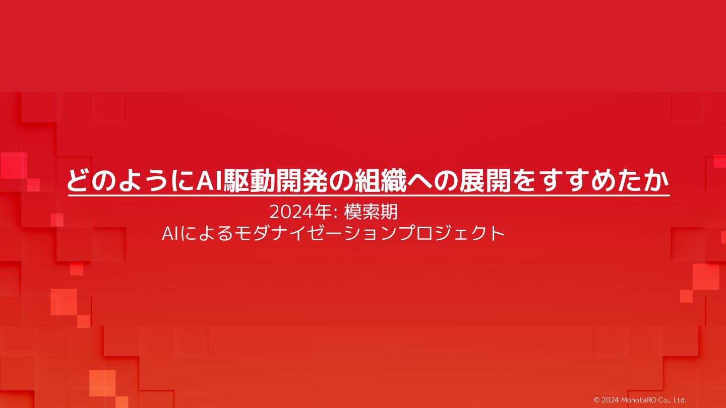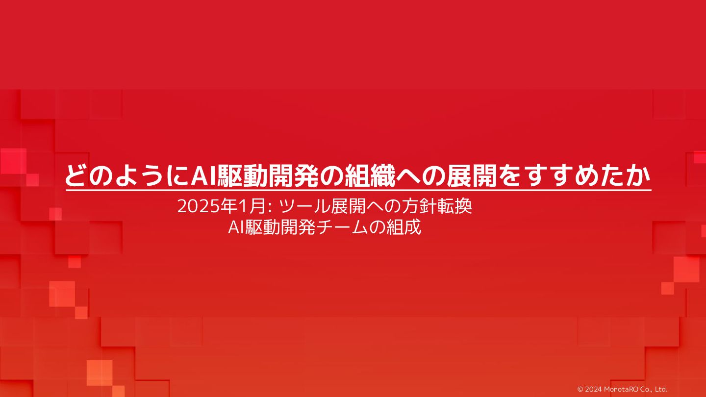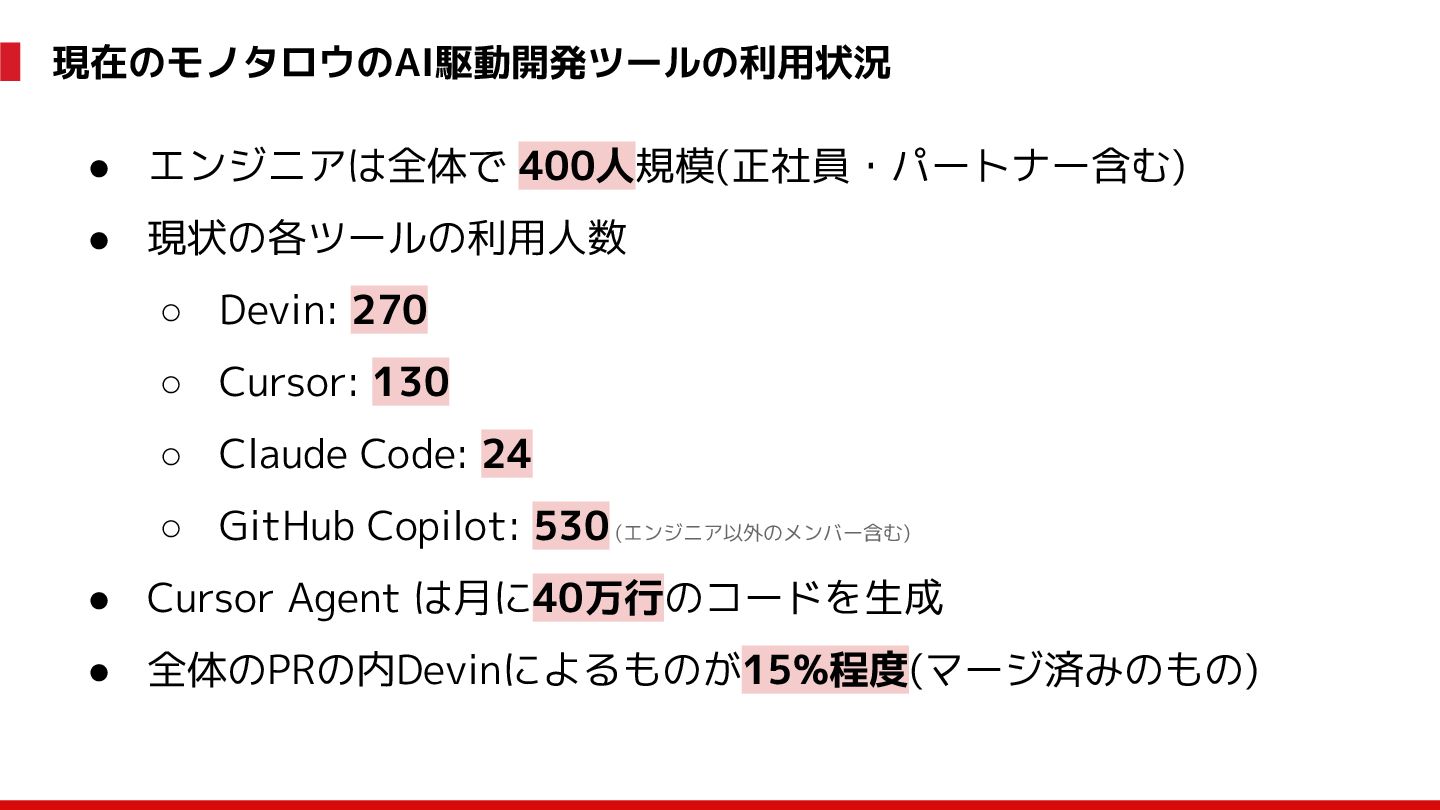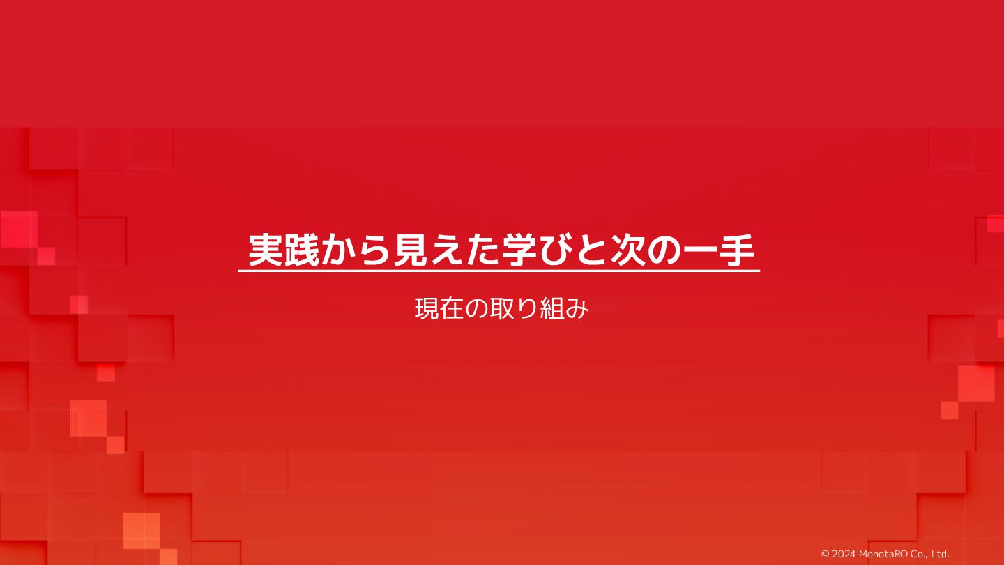 本セッションでは、私たちモノタロウが「何を目的に置き、どう判断し、どんな施策を打ってきたのか」という実践の道のりを共有。200名以上の開発者と試行錯誤する中で見出した、個々の“熱量”を一過性のブームで終わらせず、組織の“文化”へと昇華させるための具体的な取り組みと、その背景にある思想を解説します。