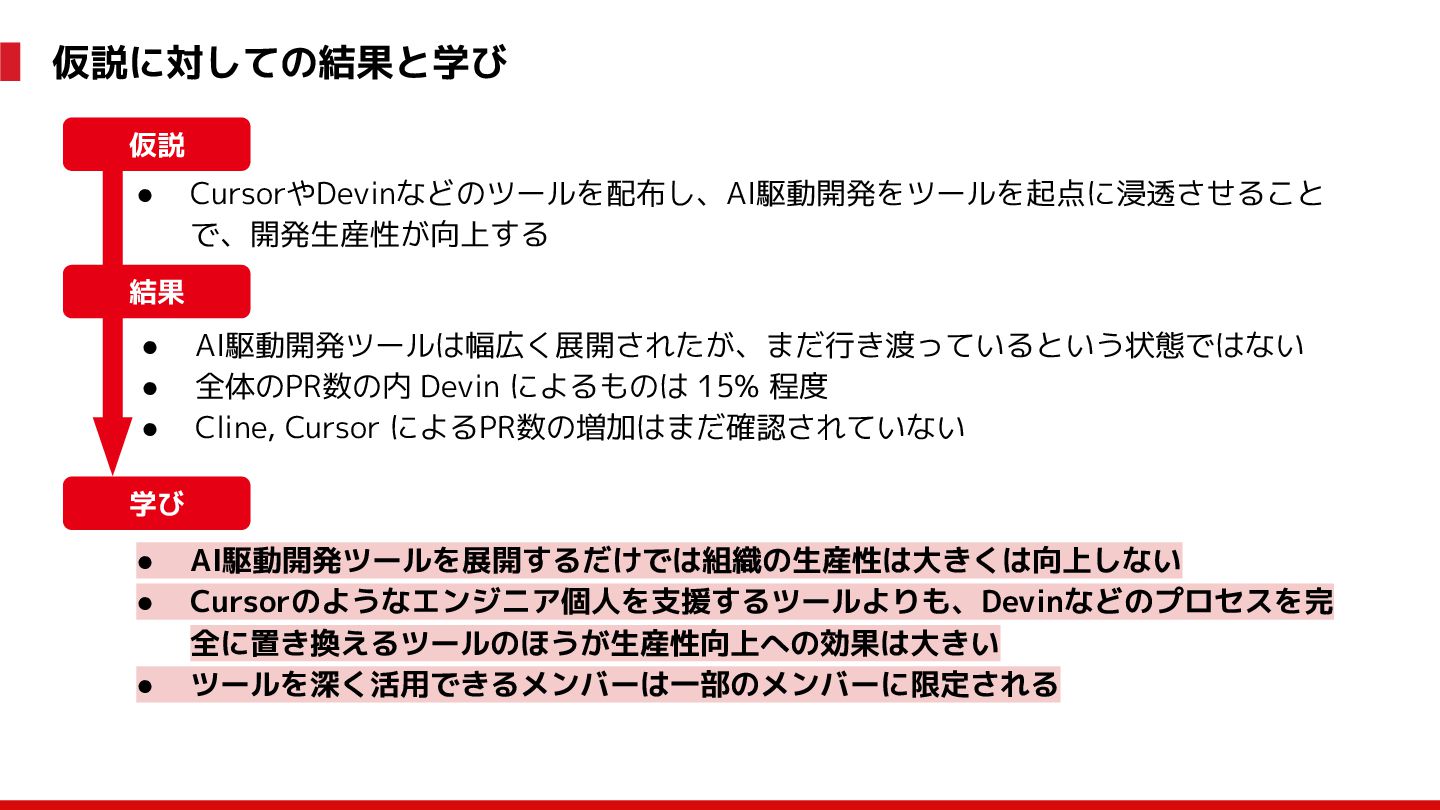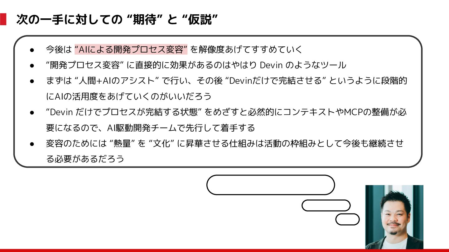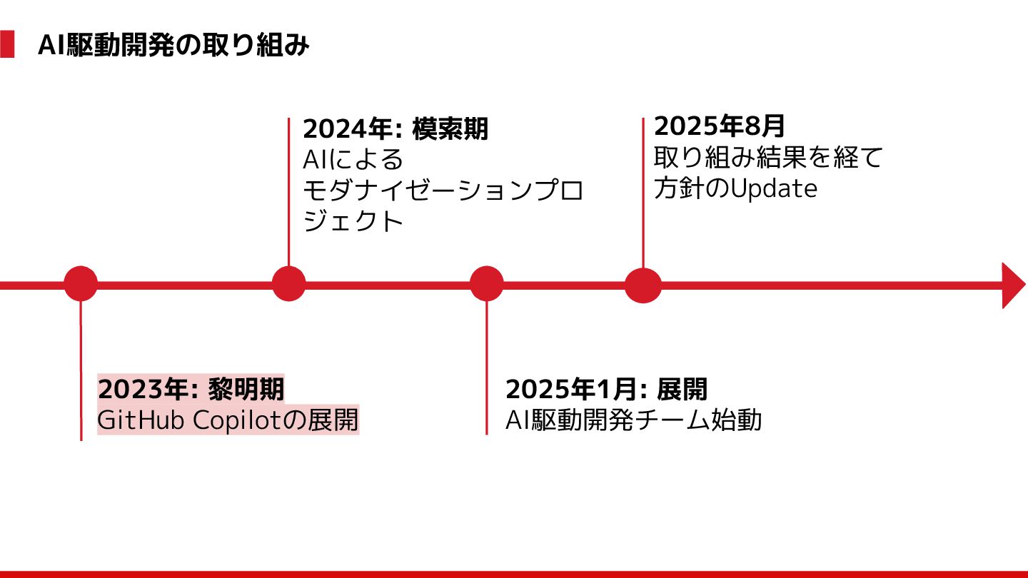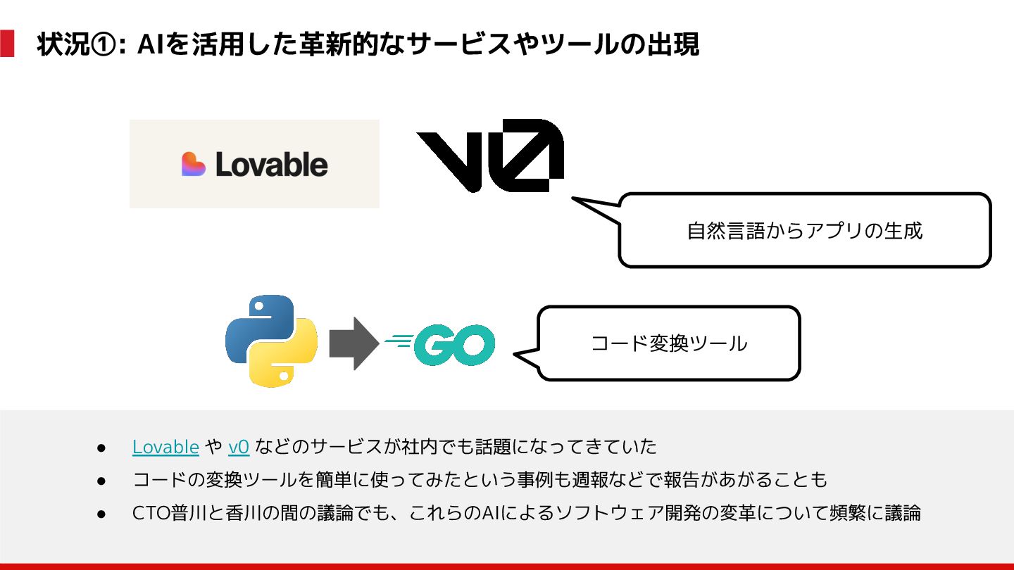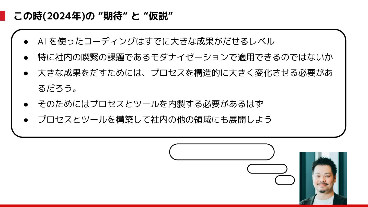 本セッションでは、私たちモノタロウが「何を目的に置き、どう判断し、どんな施策を打ってきたのか」という実践の道のりを共有。200名以上の開発者と試行錯誤する中で見出した、個々の“熱量”を一過性のブームで終わらせず、組織の“文化”へと昇華させるための具体的な取り組みと、その背景にある思想を解説します。