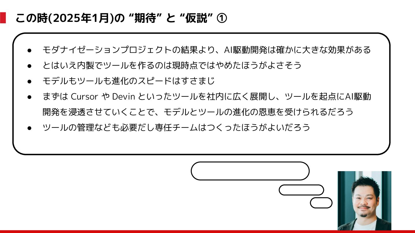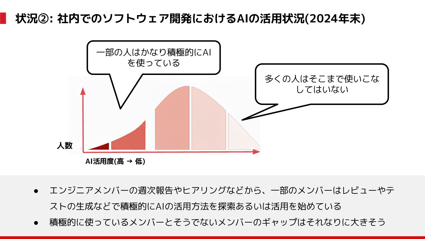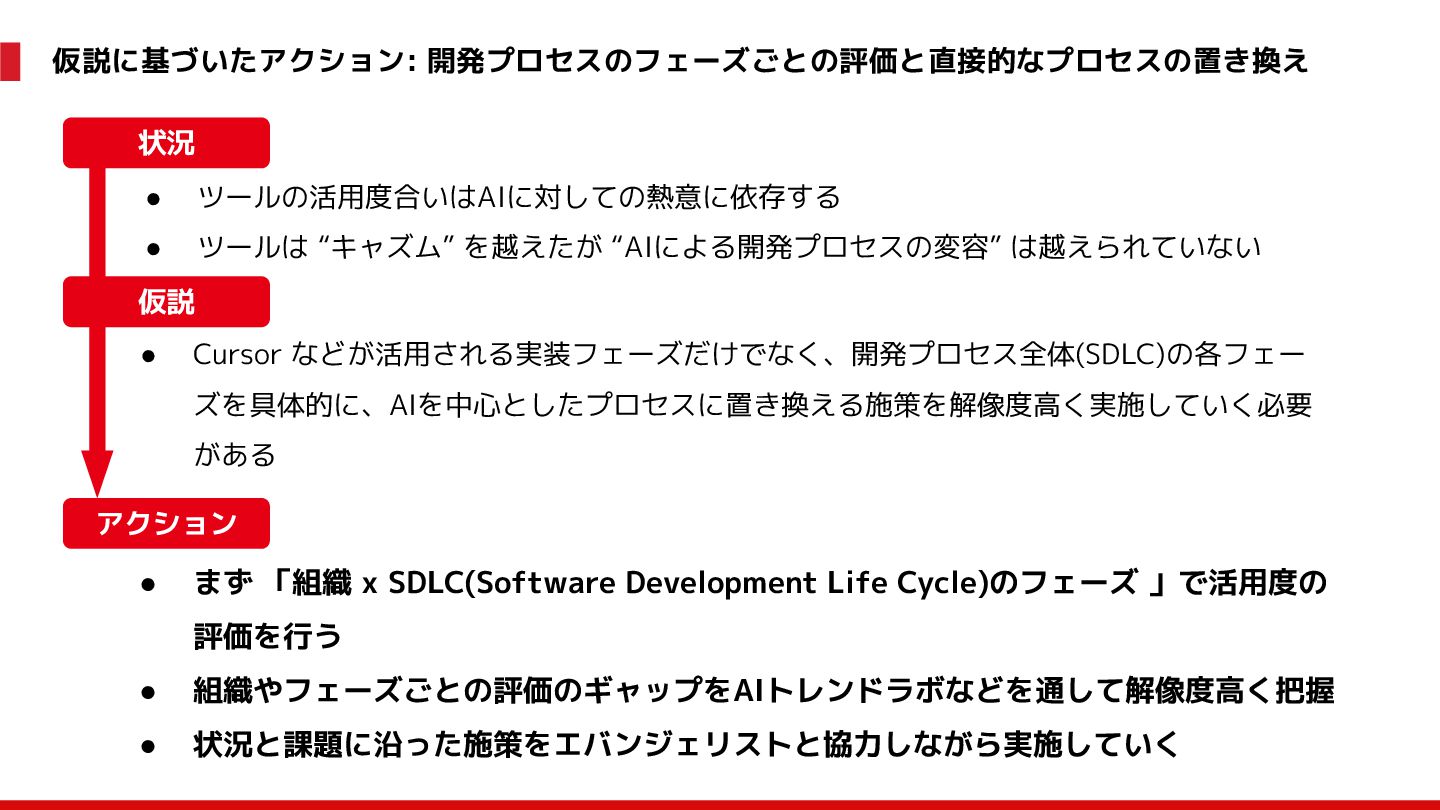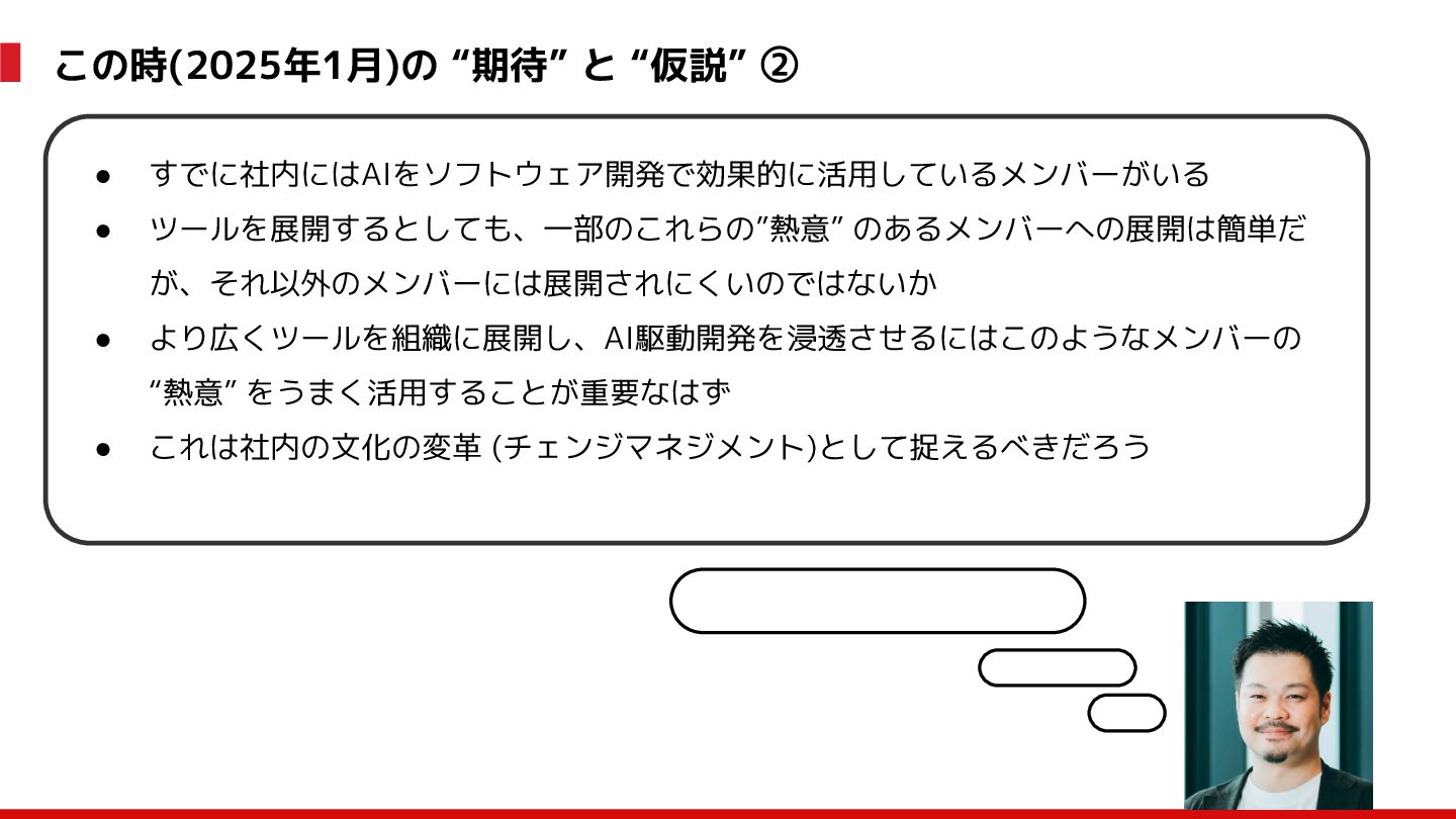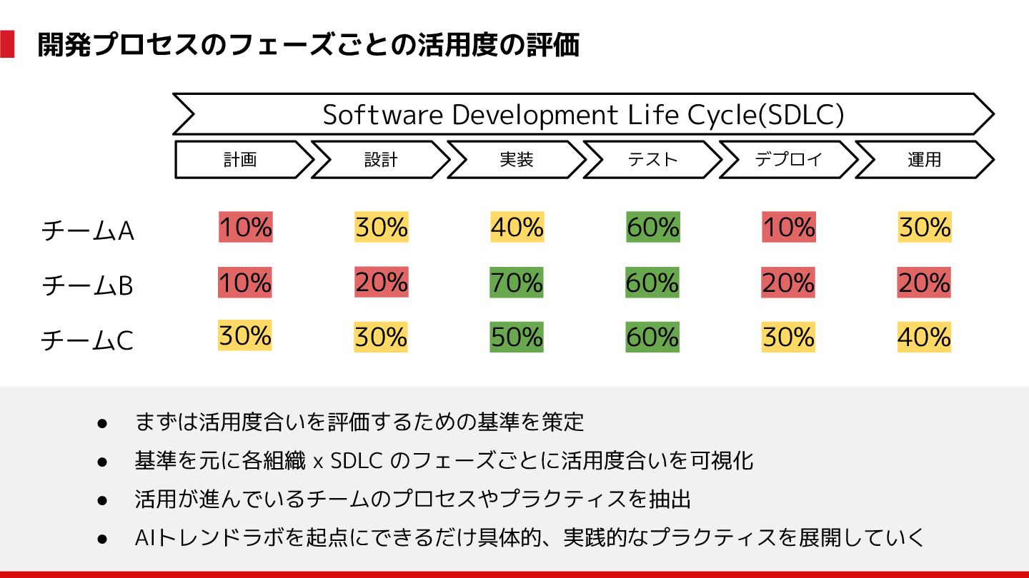 AIの活用を組織で進めていく中で、専任チームは作るべきか、どのツールから検証すべきか、何を評価指標にするかなど、様々な判断や選択を迫られます。