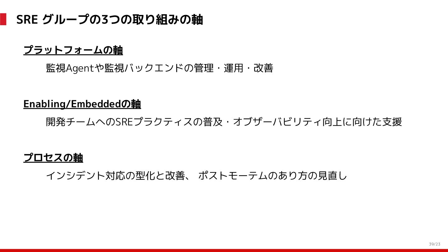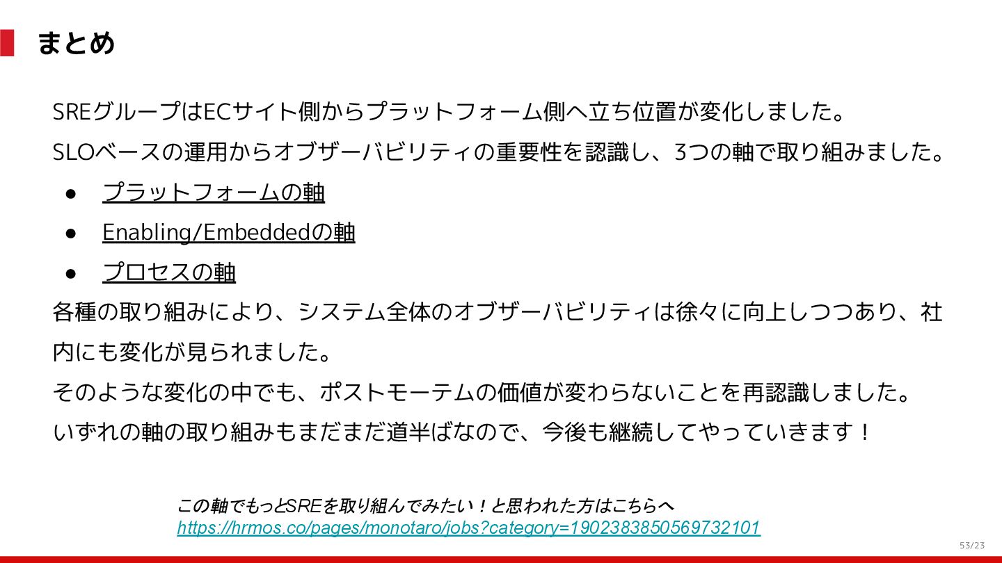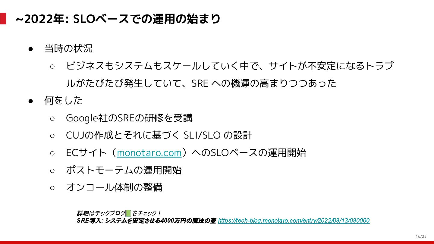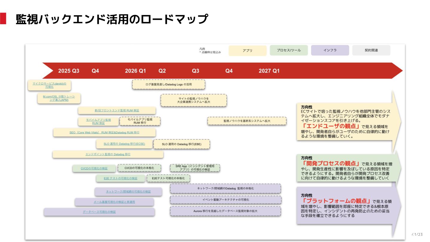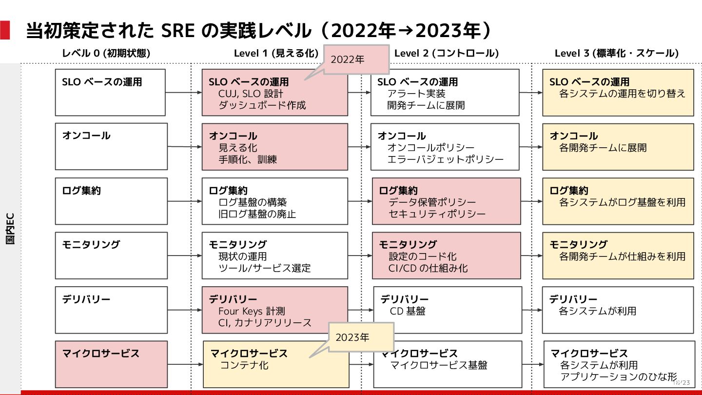 (見える化) Level 2 (コントロール) Level 3 (標準化・スケール) 国内EC SLO ベースの運用 オンコール 見える化 手順化、訓練 SLO ベースの運用 CUJ, SLO 設計 ダッシュボード作成 SLO ベースの運用 アラート実装 開発チームに展開 オンコール オンコールポリシー エラーバジェットポリシー SLO ベースの運用 各システムの運用を切り替え ログ集約 ログ基盤の構築 旧ログ基盤の廃止 ログ集約 データ保管ポリシー セキュリティポリシー ログ集約 各システムがログ基盤を利用 オンコール 各開発チームに展開 モニタリング 現状の運用 ツール/サービス選定 モニタリング 設定のコード化 CI/CD の仕組み化 モニタリング 各開発チームが仕組みを利用 デリバリー Four Keys 計測 CI, カナリアリリース デリバリー オンコール デリバリー CD 基盤 デリバリー 各システムが利用 マイクロサービス マイクロサービス コンテナ化 マイクロサービス マイクロサービス基盤 ログ集約 モニタリング マイクロサービス 各システムが利用 アプリケーションのひな形 2022年 2023年