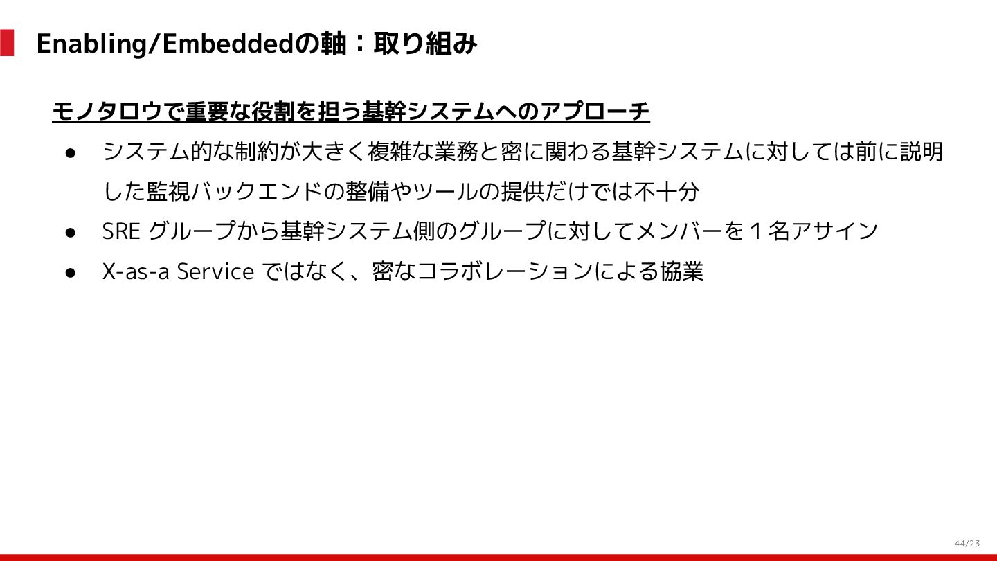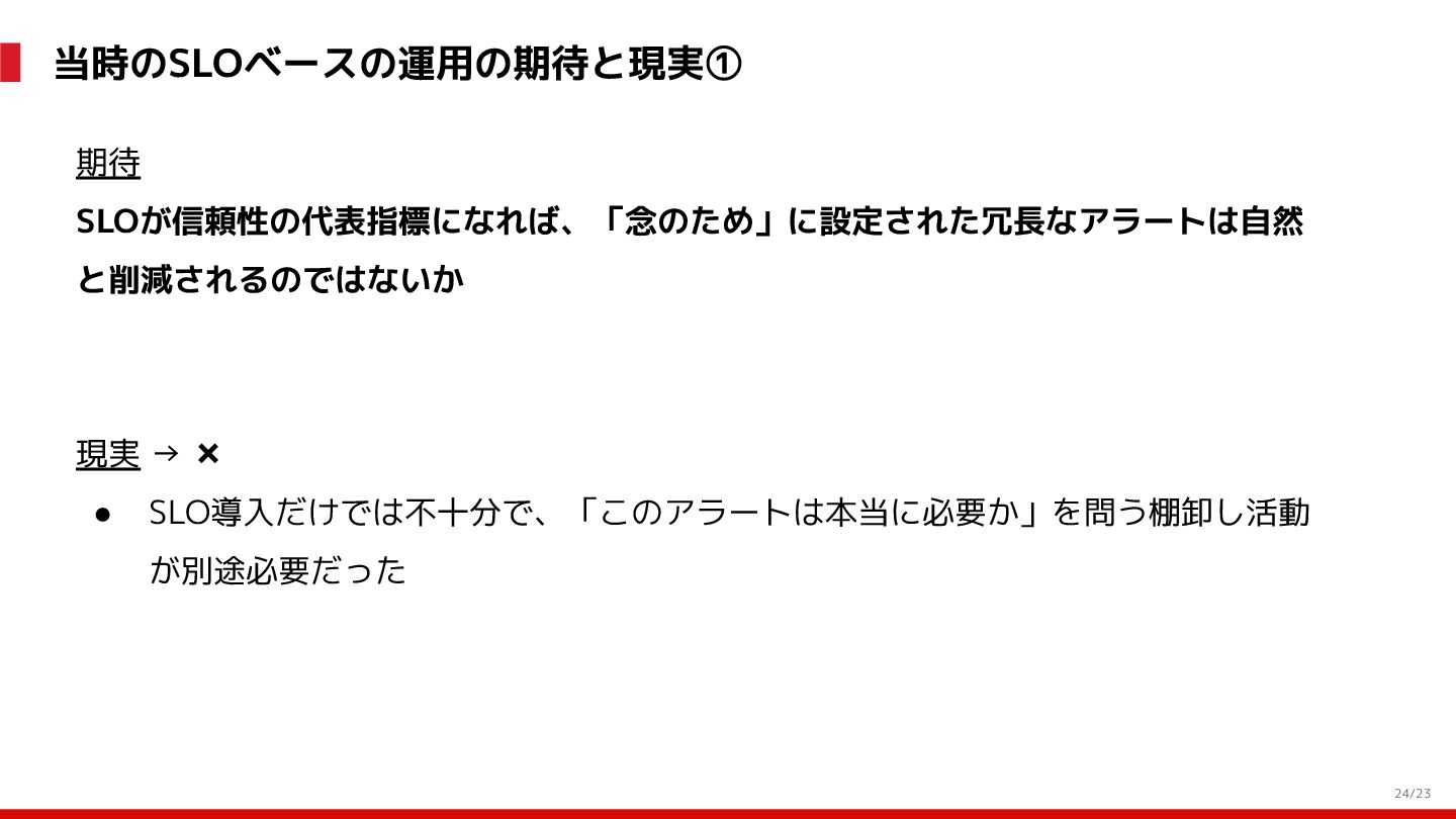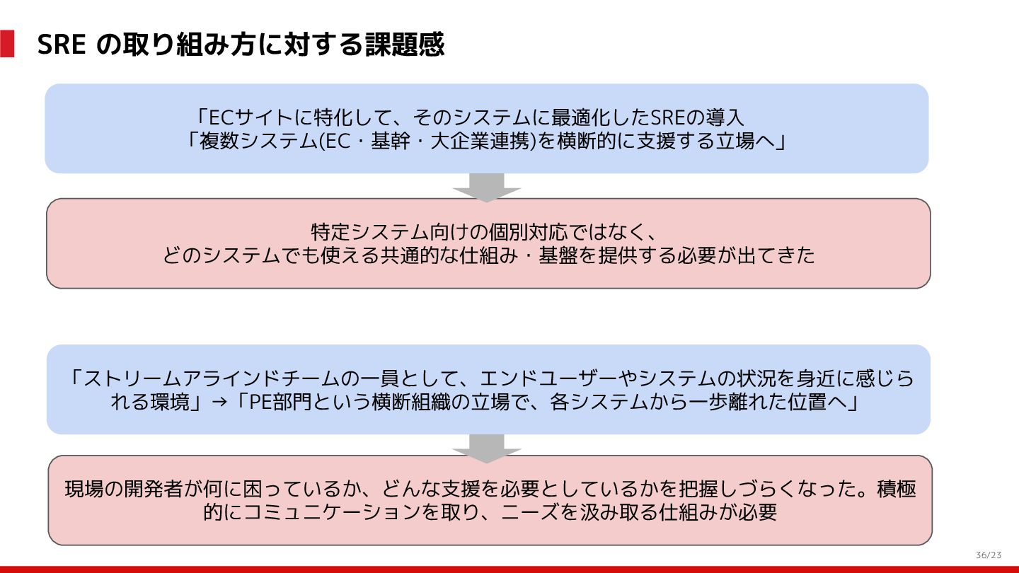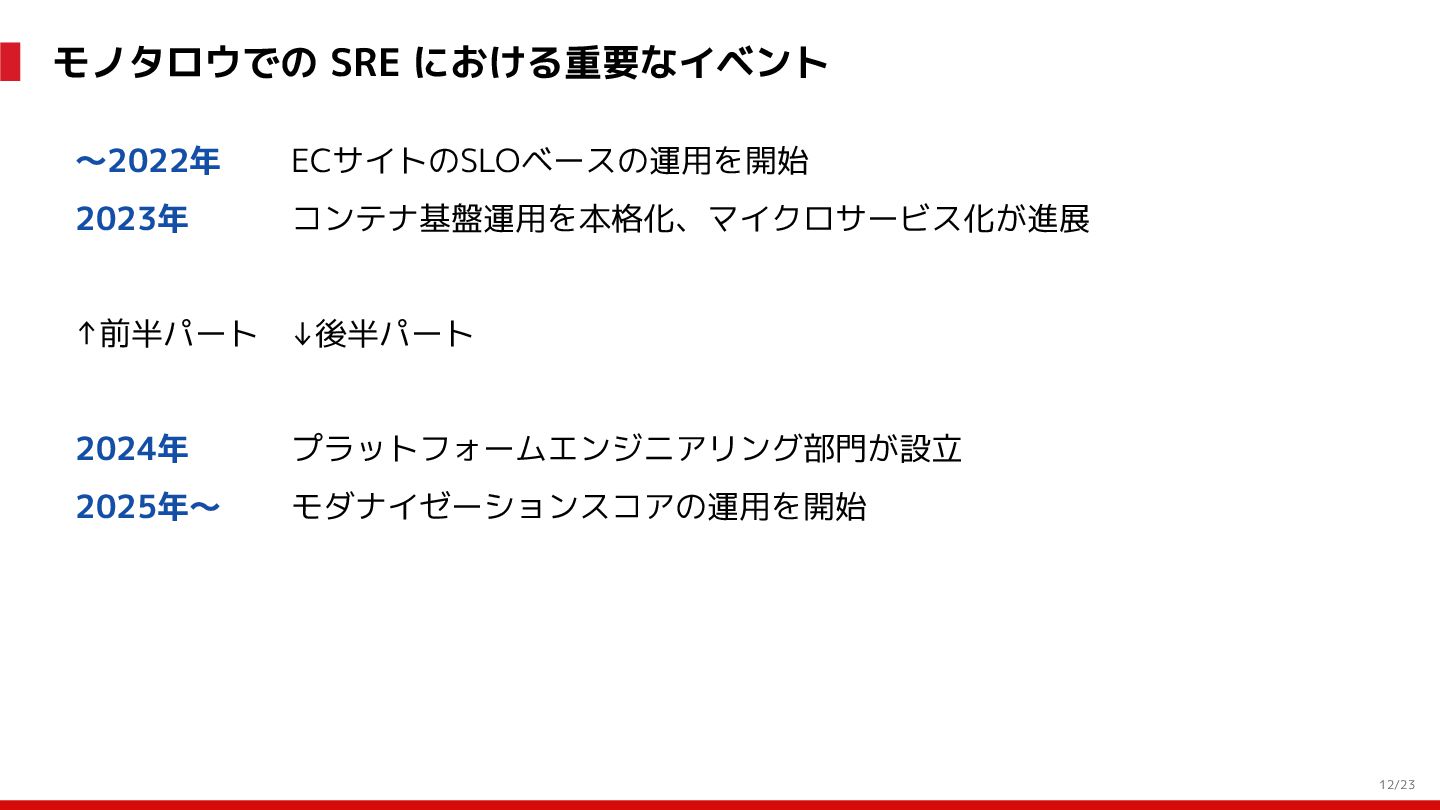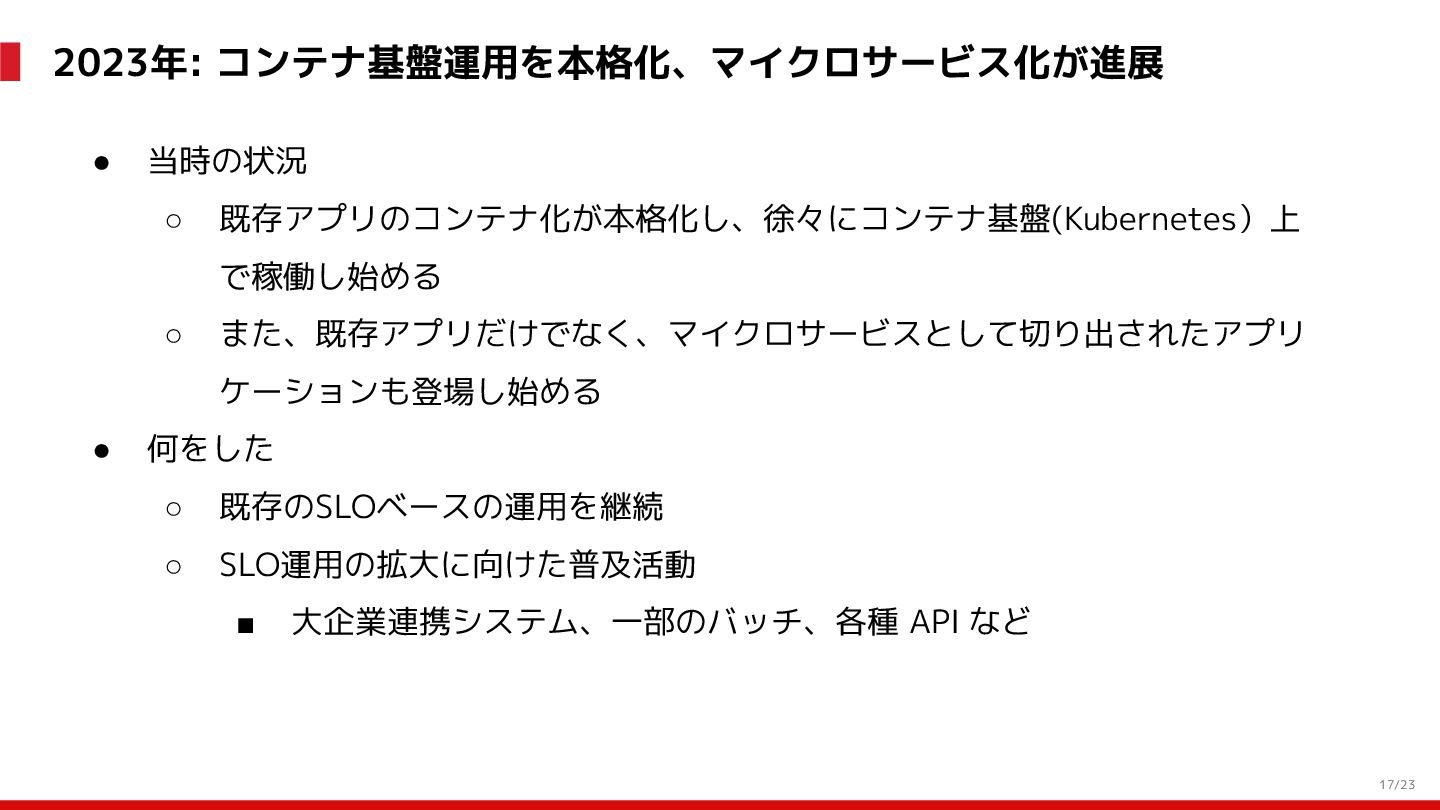 (見える化) Level 2 (コントロール) Level 3 (標準化・スケール) 国内EC SLO ベースの運用 オンコール 見える化 手順化、訓練 SLO ベースの運用 CUJ, SLO 設計 ダッシュボード作成 SLO ベースの運用 アラート実装 開発チームに展開 オンコール オンコールポリシー エラーバジェットポリシー SLO ベースの運用 各システムの運用を切り替え ログ集約 ログ基盤の構築 旧ログ基盤の廃止 ログ集約 データ保管ポリシー セキュリティポリシー ログ集約 各システムがログ基盤を利用 オンコール 各開発チームに展開 モニタリング 現状の運用 ツール/サービス選定 モニタリング 設定のコード化 CI/CD の仕組み化 モニタリング 各開発チームが仕組みを利用 デリバリー Four Keys 計測 CI, カナリアリリース デリバリー オンコール デリバリー CD 基盤 デリバリー 各システムが利用 マイクロサービス マイクロサービス コンテナ化 マイクロサービス マイクロサービス基盤 ログ集約 モニタリング マイクロサービス 各システムが利用 アプリケーションのひな形 2022年 2023年