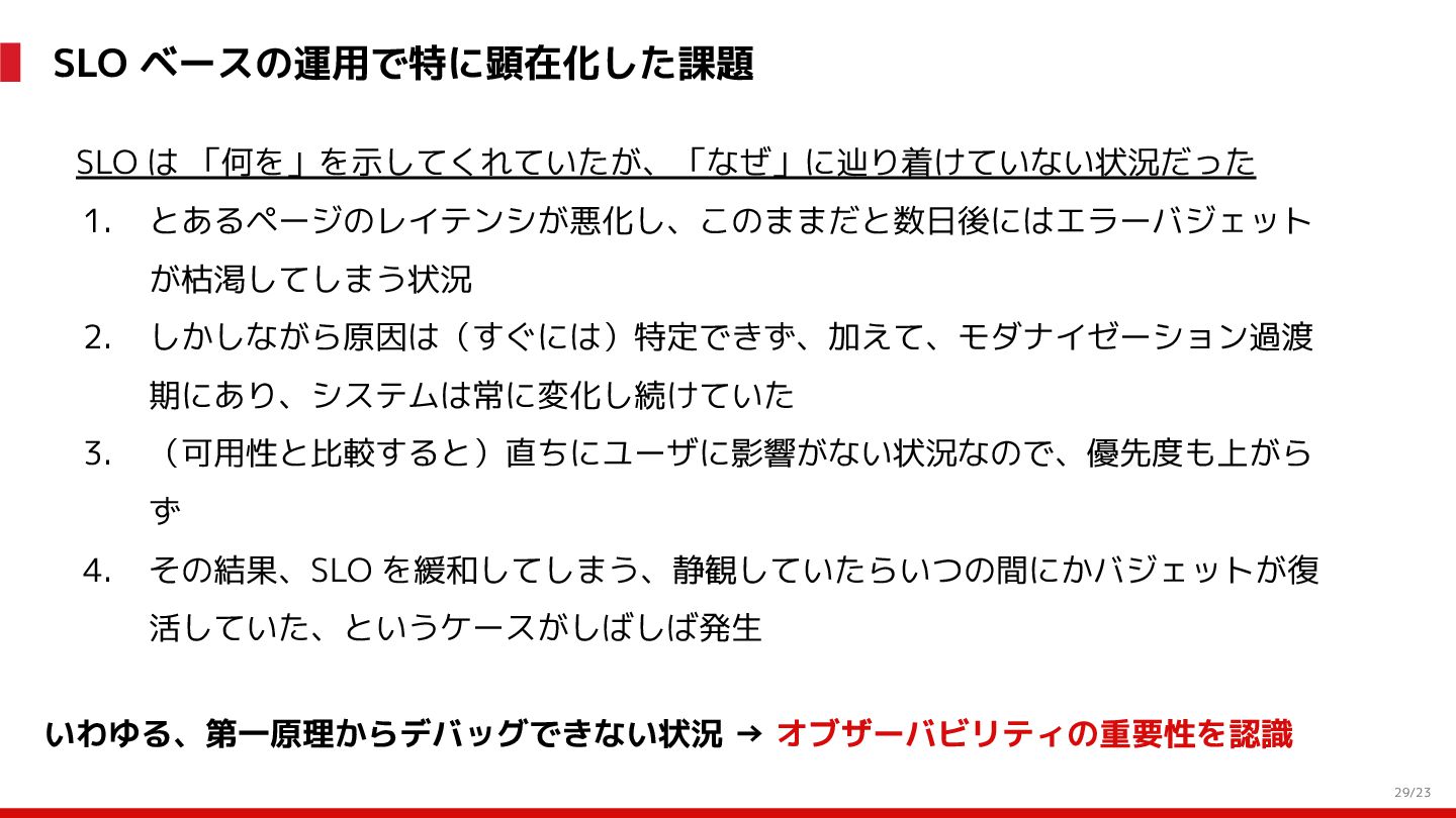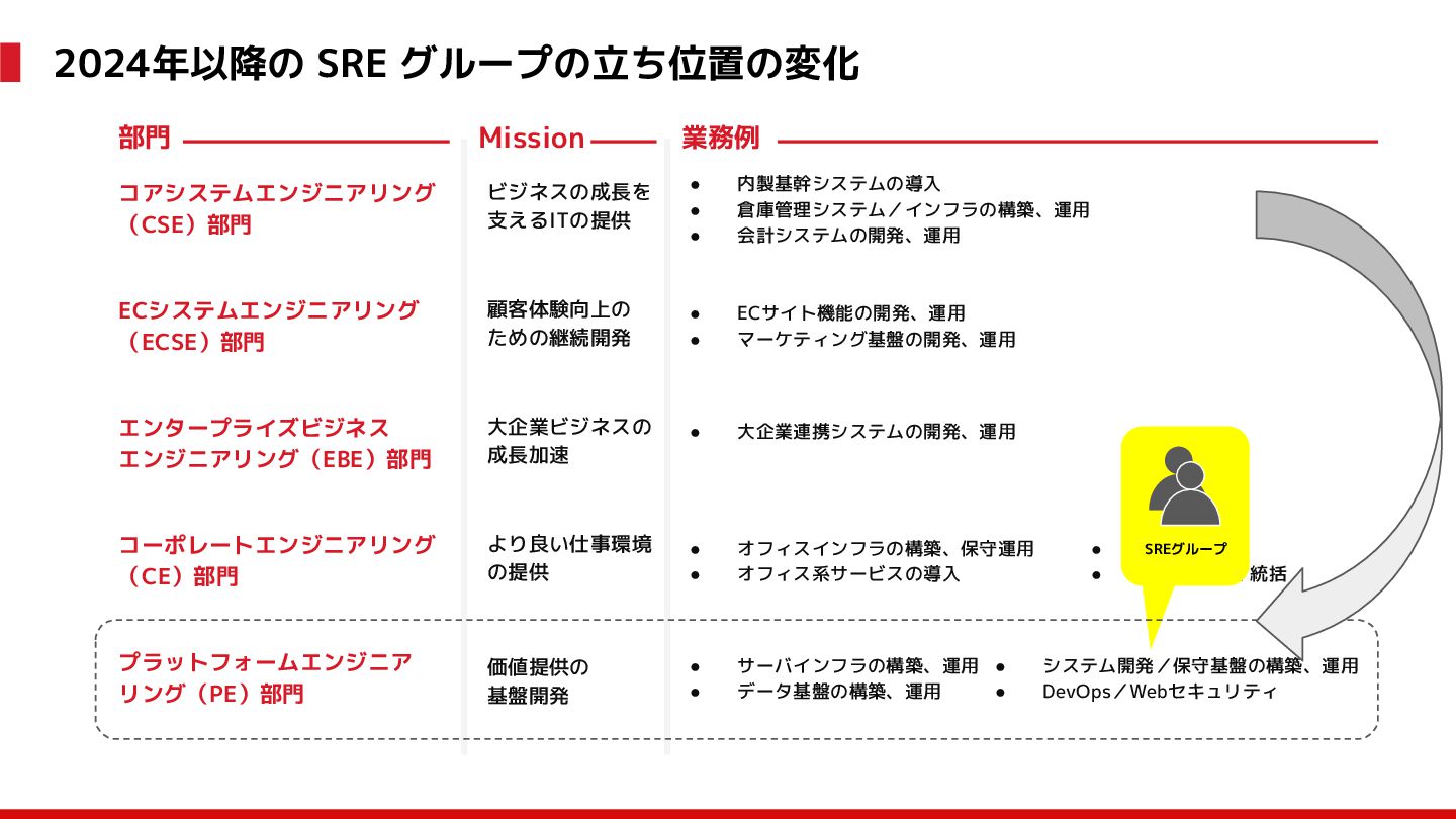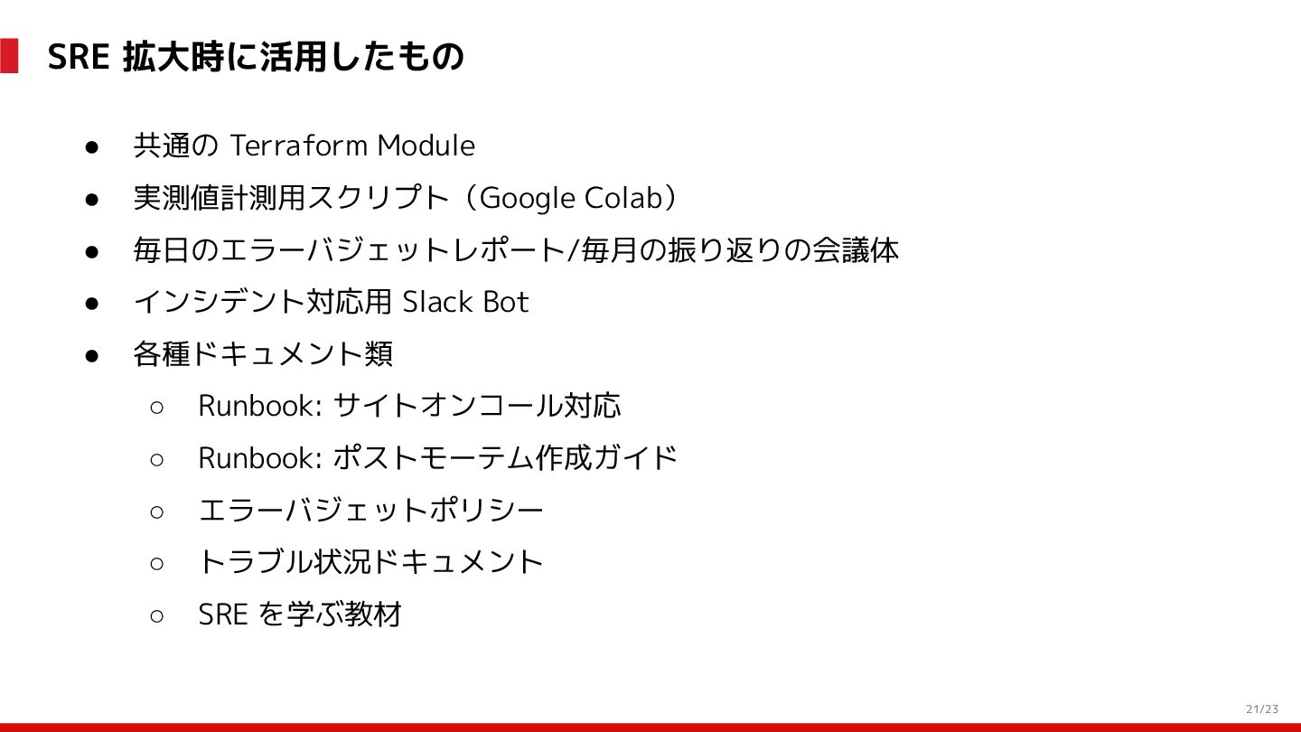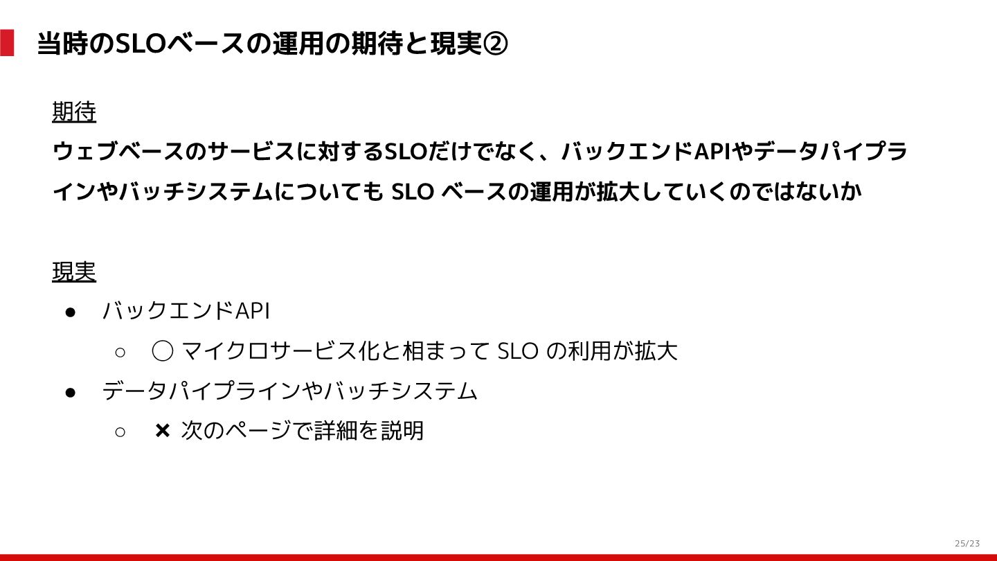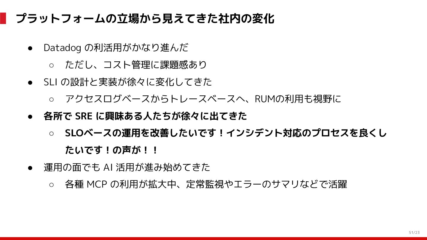 (見える化) Level 2 (コントロール) Level 3 (標準化・スケール) 国内EC SLO ベースの運用 オンコール 見える化 手順化、訓練 SLO ベースの運用 CUJ, SLO 設計 ダッシュボード作成 SLO ベースの運用 アラート実装 開発チームに展開 オンコール オンコールポリシー エラーバジェットポリシー SLO ベースの運用 各システムの運用を切り替え ログ集約 ログ基盤の構築 旧ログ基盤の廃止 ログ集約 データ保管ポリシー セキュリティポリシー ログ集約 各システムがログ基盤を利用 オンコール 各開発チームに展開 モニタリング 現状の運用 ツール/サービス選定 モニタリング 設定のコード化 CI/CD の仕組み化 モニタリング 各開発チームが仕組みを利用 デリバリー Four Keys 計測 CI, カナリアリリース デリバリー オンコール デリバリー CD 基盤 デリバリー 各システムが利用 マイクロサービス マイクロサービス コンテナ化 マイクロサービス マイクロサービス基盤 ログ集約 モニタリング マイクロサービス 各システムが利用 アプリケーションのひな形 2022年 2023年