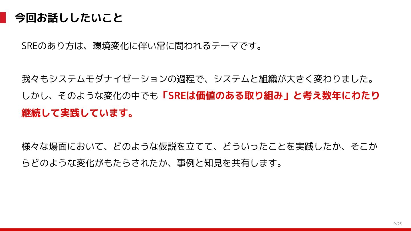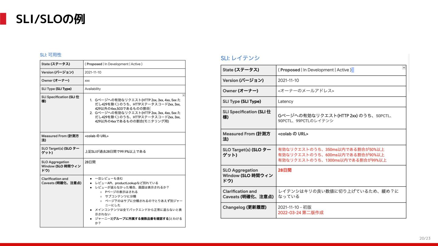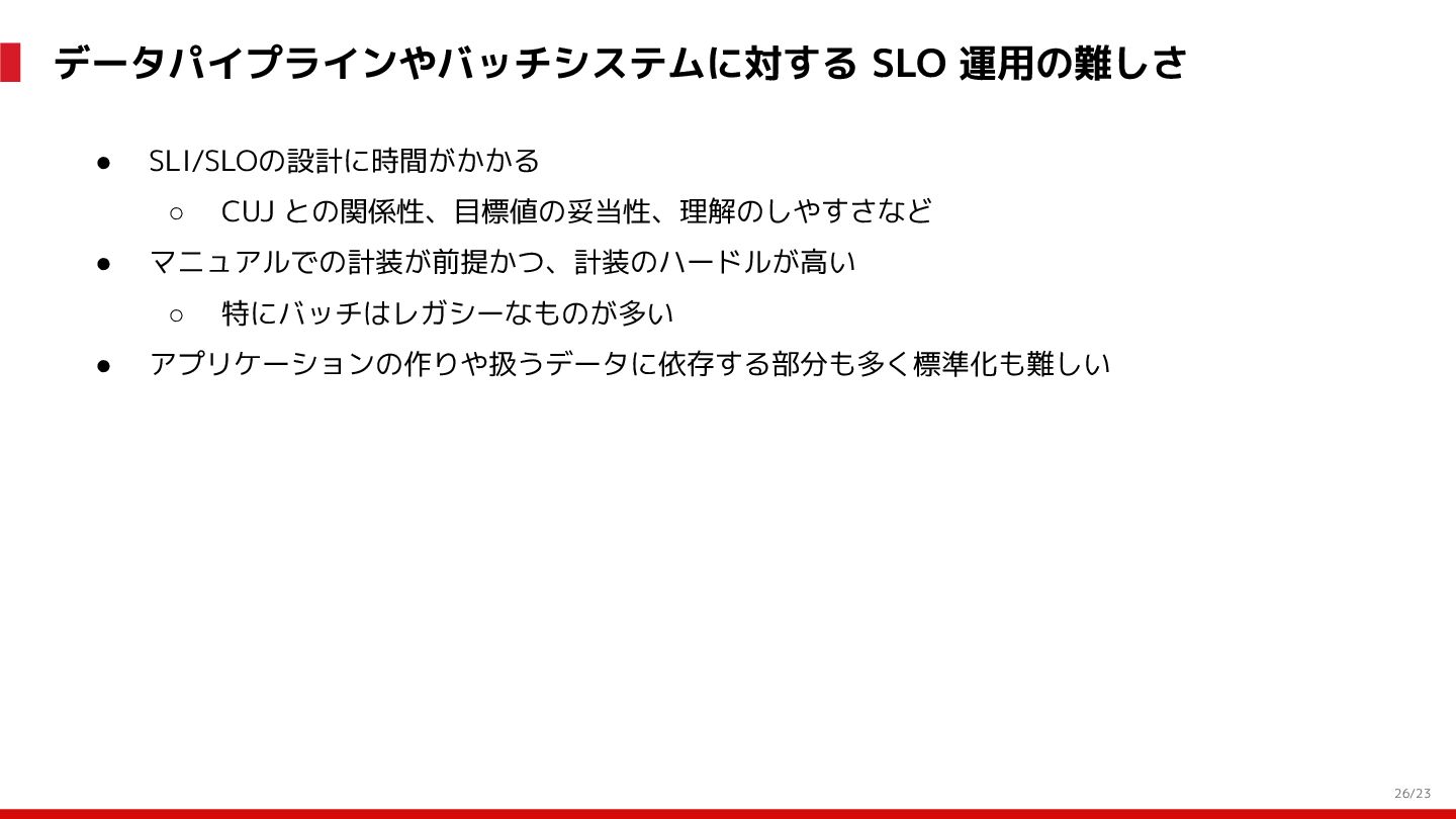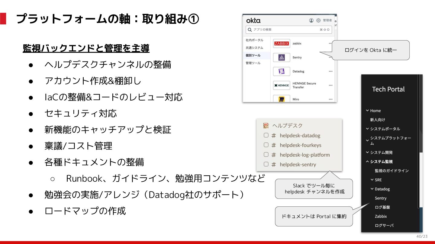 (見える化) Level 2 (コントロール) Level 3 (標準化・スケール) 国内EC SLO ベースの運用 オンコール 見える化 手順化、訓練 SLO ベースの運用 CUJ, SLO 設計 ダッシュボード作成 SLO ベースの運用 アラート実装 開発チームに展開 オンコール オンコールポリシー エラーバジェットポリシー SLO ベースの運用 各システムの運用を切り替え ログ集約 ログ基盤の構築 旧ログ基盤の廃止 ログ集約 データ保管ポリシー セキュリティポリシー ログ集約 各システムがログ基盤を利用 オンコール 各開発チームに展開 モニタリング 現状の運用 ツール/サービス選定 モニタリング 設定のコード化 CI/CD の仕組み化 モニタリング 各開発チームが仕組みを利用 デリバリー Four Keys 計測 CI, カナリアリリース デリバリー オンコール デリバリー CD 基盤 デリバリー 各システムが利用 マイクロサービス マイクロサービス コンテナ化 マイクロサービス マイクロサービス基盤 ログ集約 モニタリング マイクロサービス 各システムが利用 アプリケーションのひな形 2022年 2023年