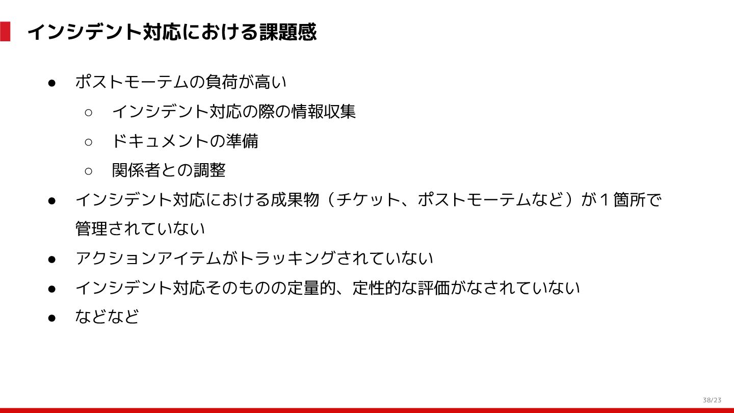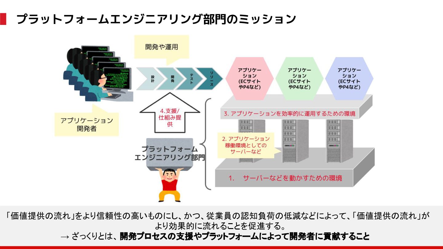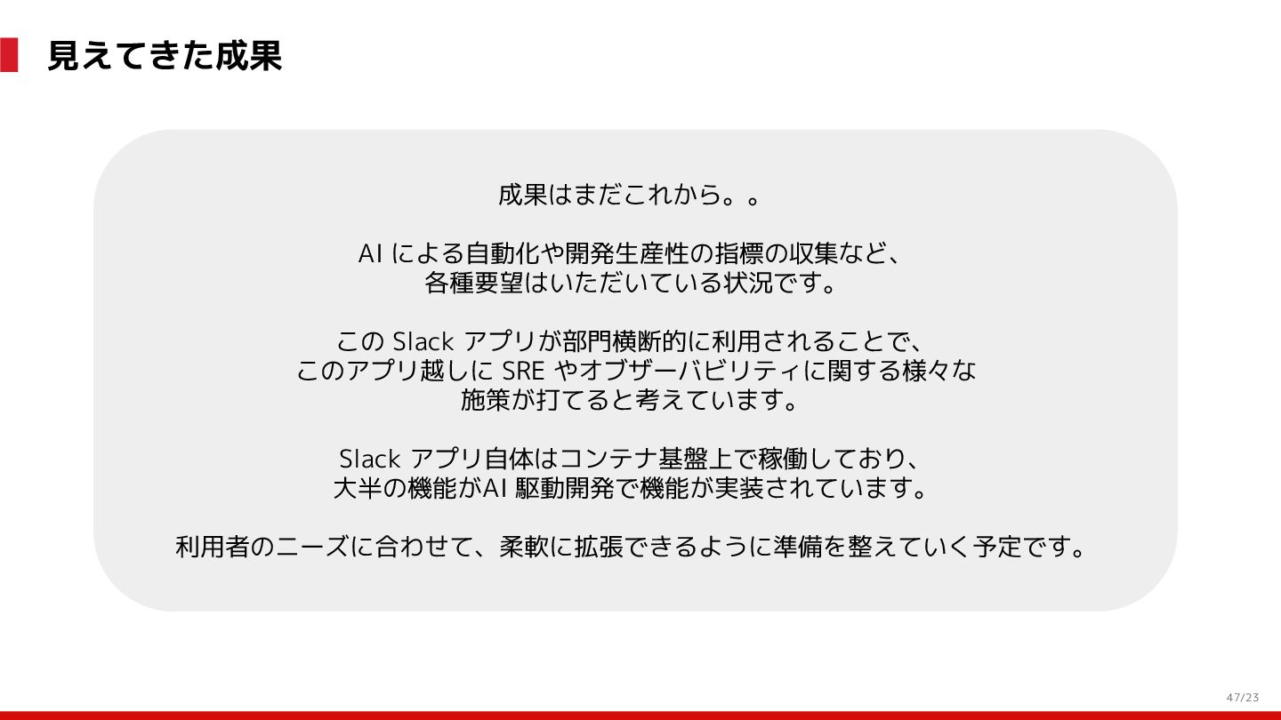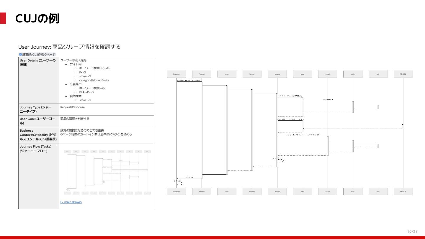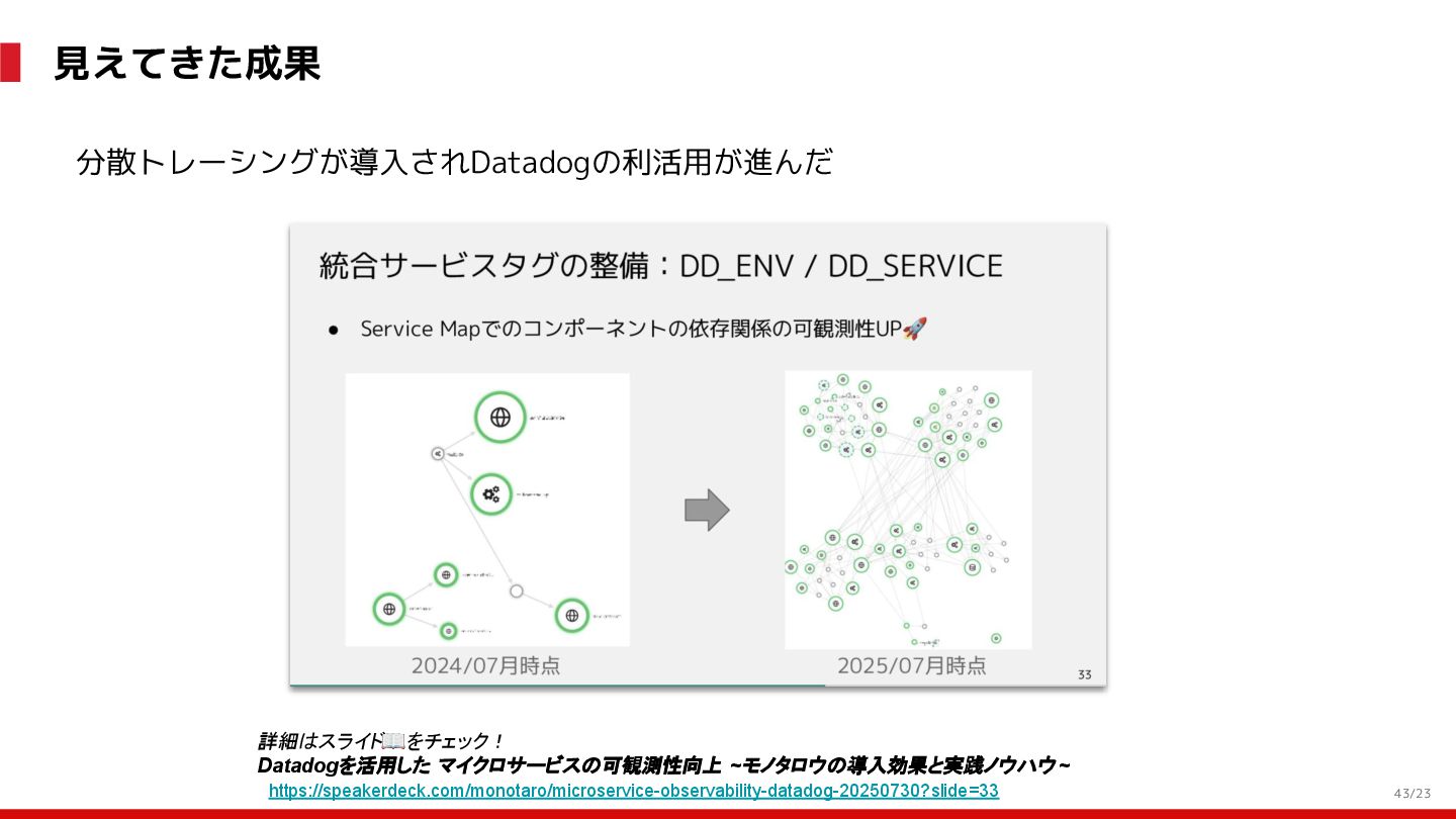 (見える化) Level 2 (コントロール) Level 3 (標準化・スケール) 国内EC SLO ベースの運用 オンコール 見える化 手順化、訓練 SLO ベースの運用 CUJ, SLO 設計 ダッシュボード作成 SLO ベースの運用 アラート実装 開発チームに展開 オンコール オンコールポリシー エラーバジェットポリシー SLO ベースの運用 各システムの運用を切り替え ログ集約 ログ基盤の構築 旧ログ基盤の廃止 ログ集約 データ保管ポリシー セキュリティポリシー ログ集約 各システムがログ基盤を利用 オンコール 各開発チームに展開 モニタリング 現状の運用 ツール/サービス選定 モニタリング 設定のコード化 CI/CD の仕組み化 モニタリング 各開発チームが仕組みを利用 デリバリー Four Keys 計測 CI, カナリアリリース デリバリー オンコール デリバリー CD 基盤 デリバリー 各システムが利用 マイクロサービス マイクロサービス コンテナ化 マイクロサービス マイクロサービス基盤 ログ集約 モニタリング マイクロサービス 各システムが利用 アプリケーションのひな形 2022年 2023年