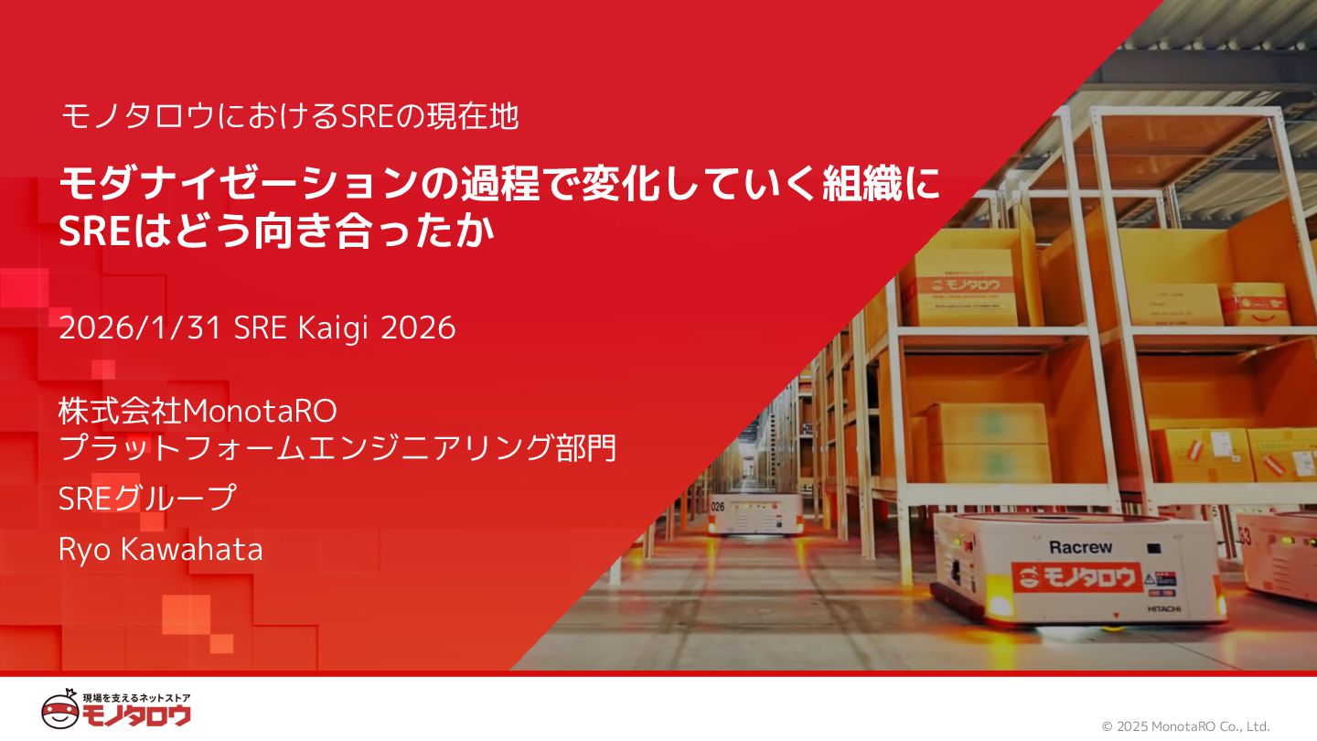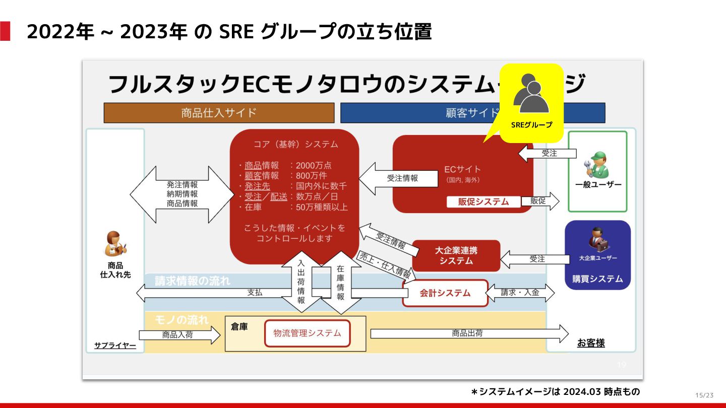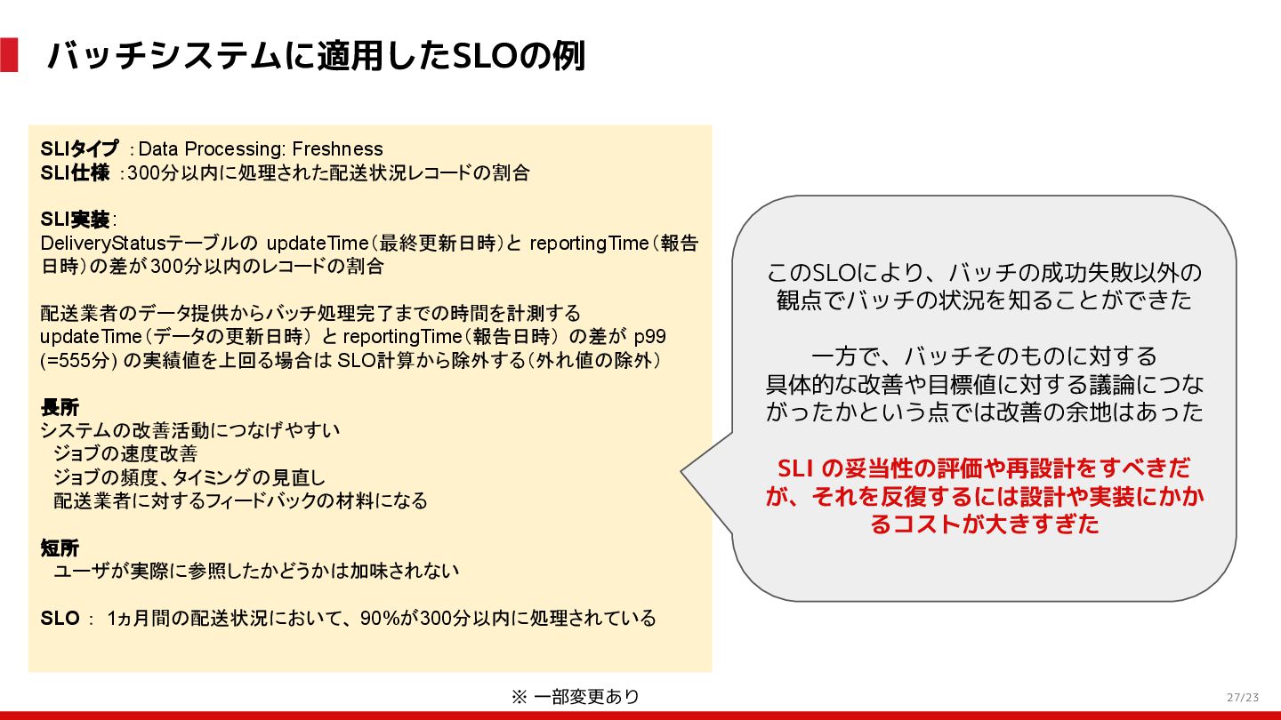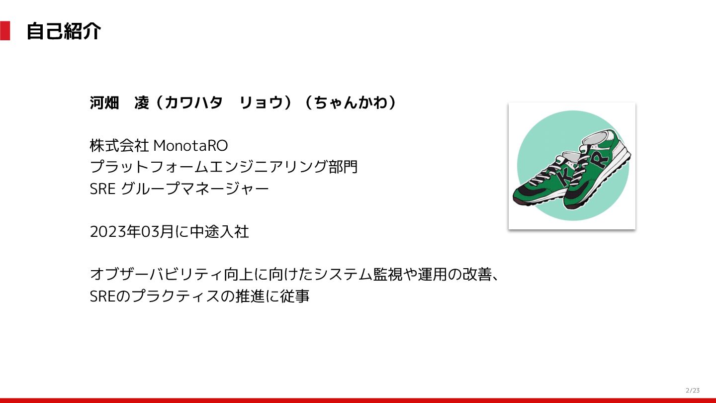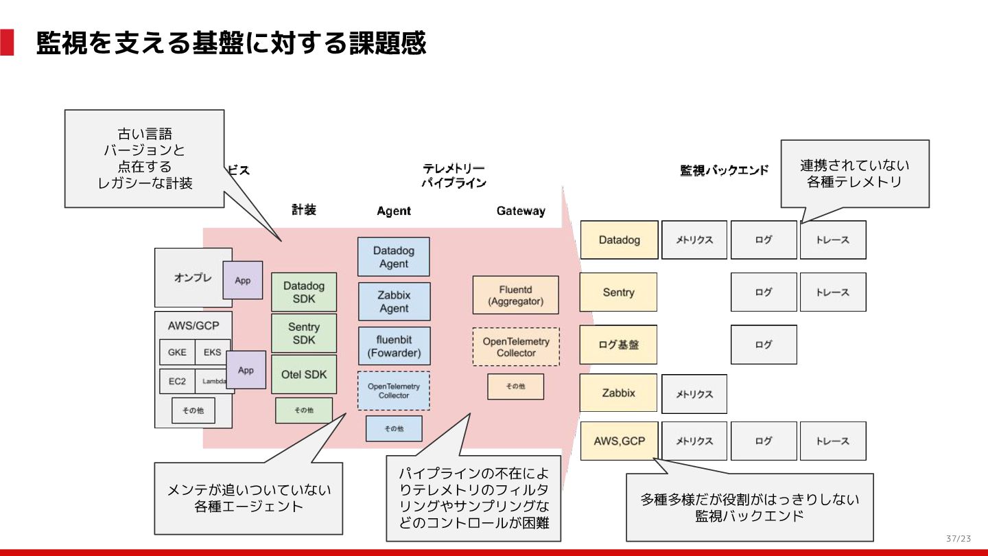 (見える化) Level 2 (コントロール) Level 3 (標準化・スケール) 国内EC SLO ベースの運用 オンコール 見える化 手順化、訓練 SLO ベースの運用 CUJ, SLO 設計 ダッシュボード作成 SLO ベースの運用 アラート実装 開発チームに展開 オンコール オンコールポリシー エラーバジェットポリシー SLO ベースの運用 各システムの運用を切り替え ログ集約 ログ基盤の構築 旧ログ基盤の廃止 ログ集約 データ保管ポリシー セキュリティポリシー ログ集約 各システムがログ基盤を利用 オンコール 各開発チームに展開 モニタリング 現状の運用 ツール/サービス選定 モニタリング 設定のコード化 CI/CD の仕組み化 モニタリング 各開発チームが仕組みを利用 デリバリー Four Keys 計測 CI, カナリアリリース デリバリー オンコール デリバリー CD 基盤 デリバリー 各システムが利用 マイクロサービス マイクロサービス コンテナ化 マイクロサービス マイクロサービス基盤 ログ集約 モニタリング マイクロサービス 各システムが利用 アプリケーションのひな形 2022年 2023年