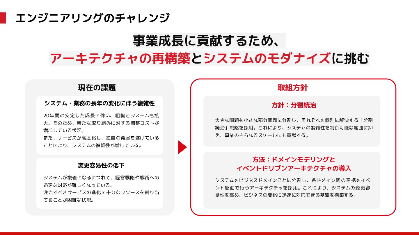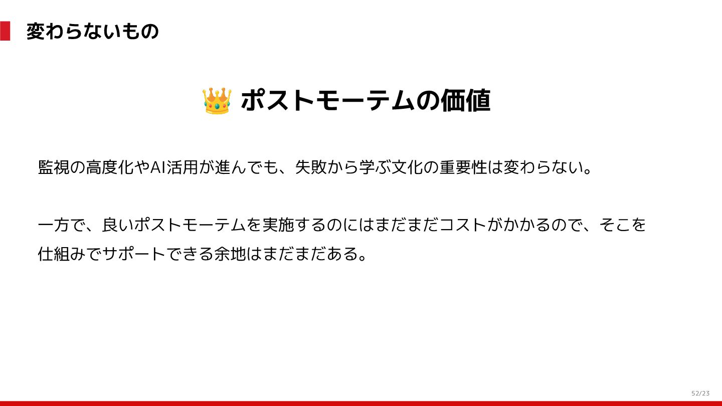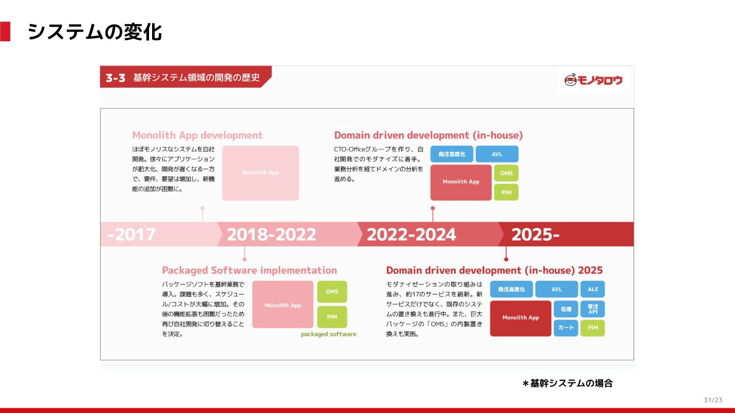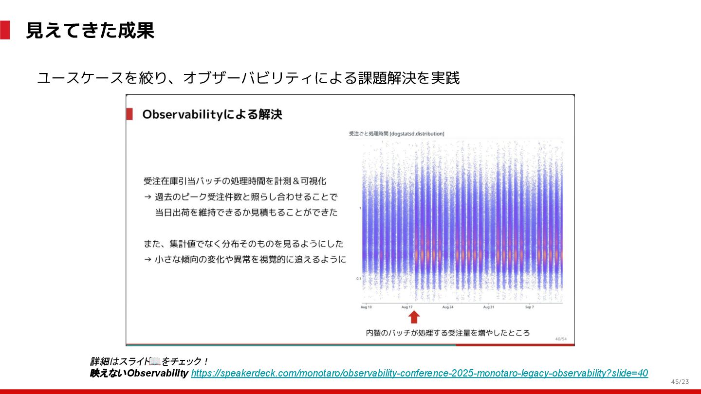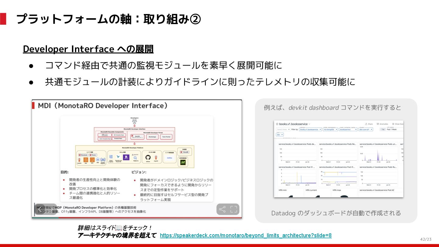 (見える化) Level 2 (コントロール) Level 3 (標準化・スケール) 国内EC SLO ベースの運用 オンコール 見える化 手順化、訓練 SLO ベースの運用 CUJ, SLO 設計 ダッシュボード作成 SLO ベースの運用 アラート実装 開発チームに展開 オンコール オンコールポリシー エラーバジェットポリシー SLO ベースの運用 各システムの運用を切り替え ログ集約 ログ基盤の構築 旧ログ基盤の廃止 ログ集約 データ保管ポリシー セキュリティポリシー ログ集約 各システムがログ基盤を利用 オンコール 各開発チームに展開 モニタリング 現状の運用 ツール/サービス選定 モニタリング 設定のコード化 CI/CD の仕組み化 モニタリング 各開発チームが仕組みを利用 デリバリー Four Keys 計測 CI, カナリアリリース デリバリー オンコール デリバリー CD 基盤 デリバリー 各システムが利用 マイクロサービス マイクロサービス コンテナ化 マイクロサービス マイクロサービス基盤 ログ集約 モニタリング マイクロサービス 各システムが利用 アプリケーションのひな形 2022年 2023年