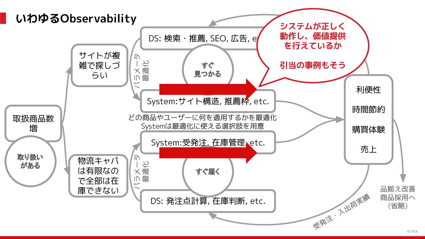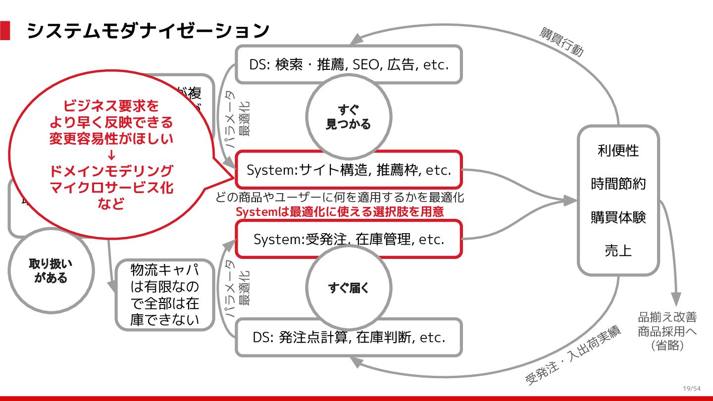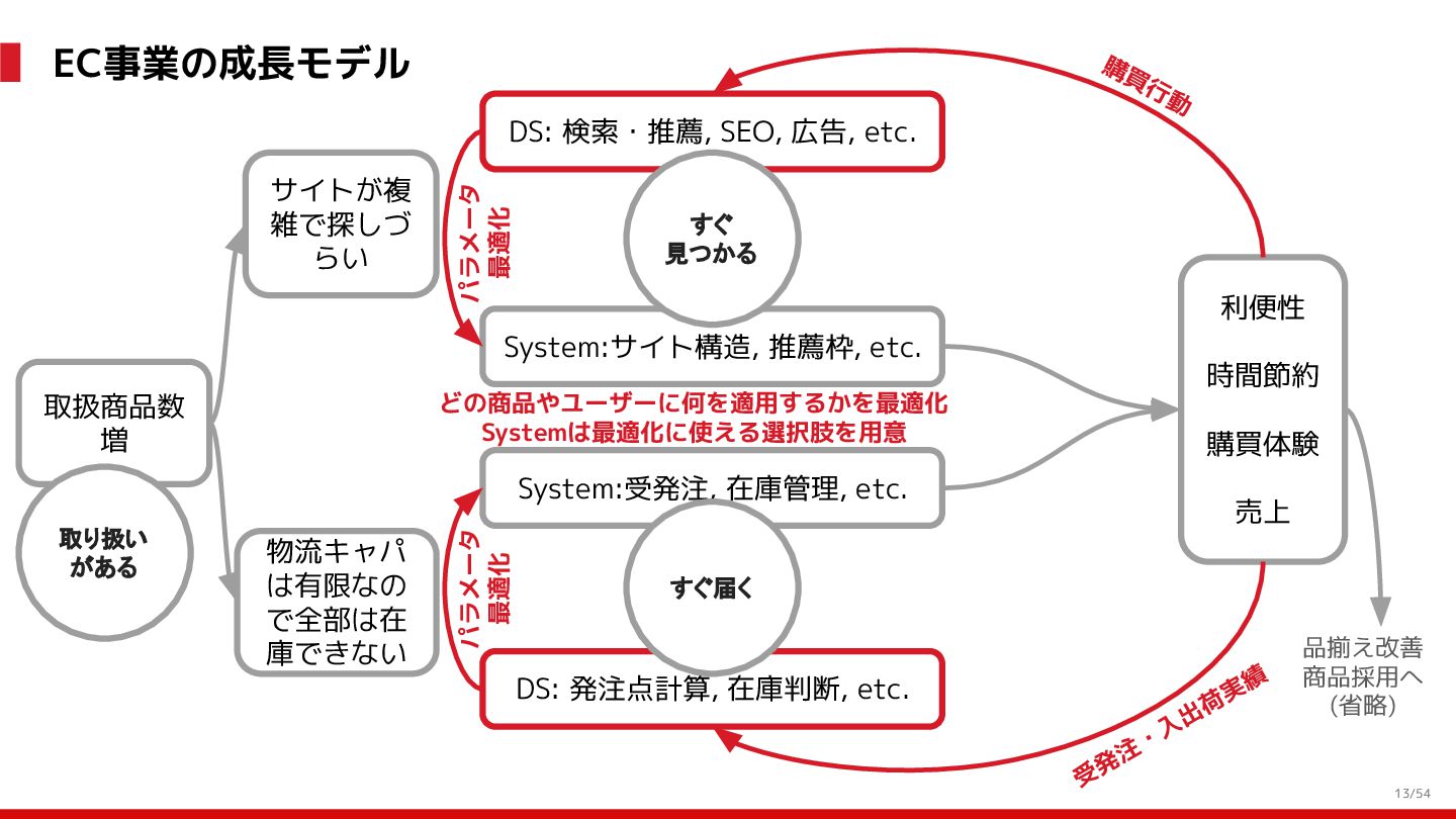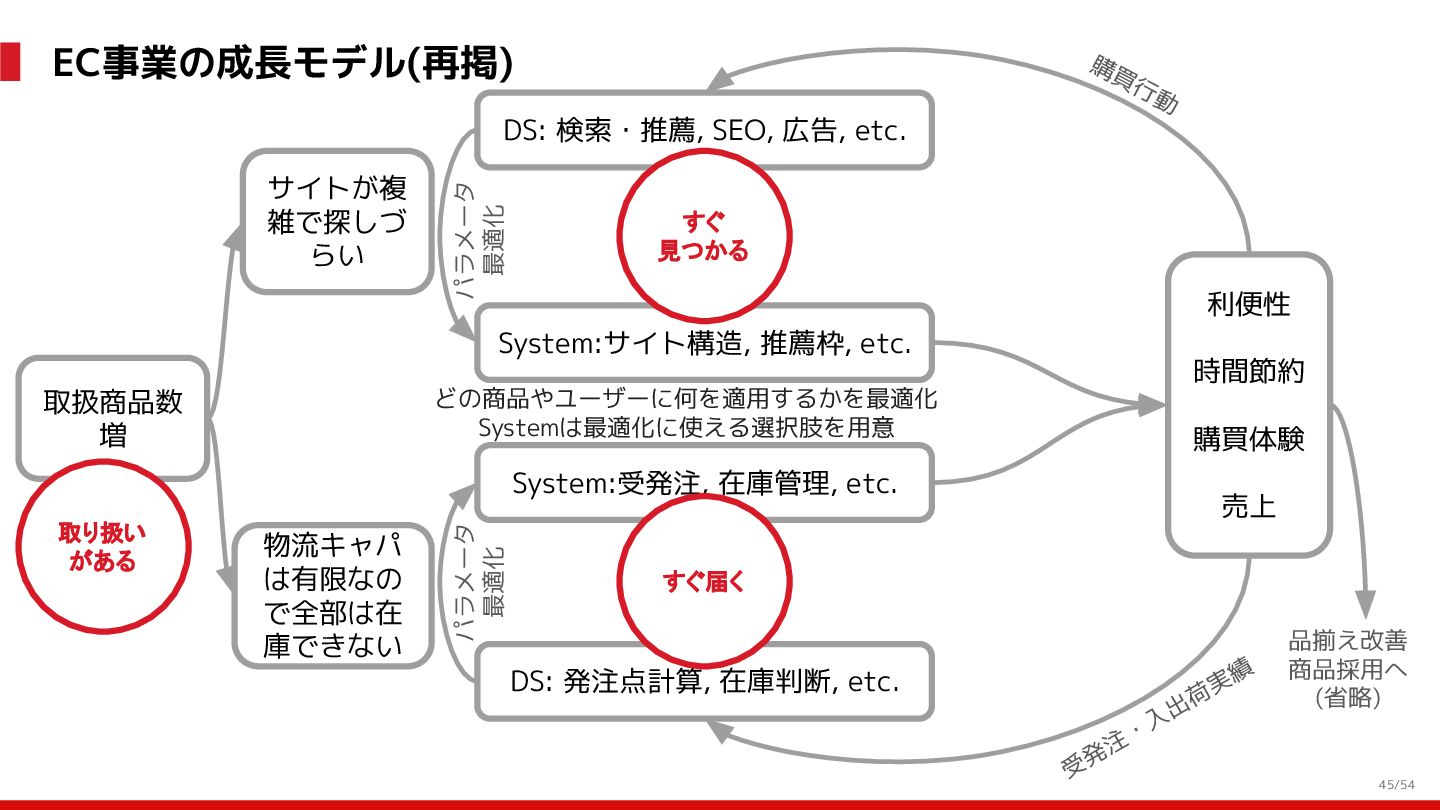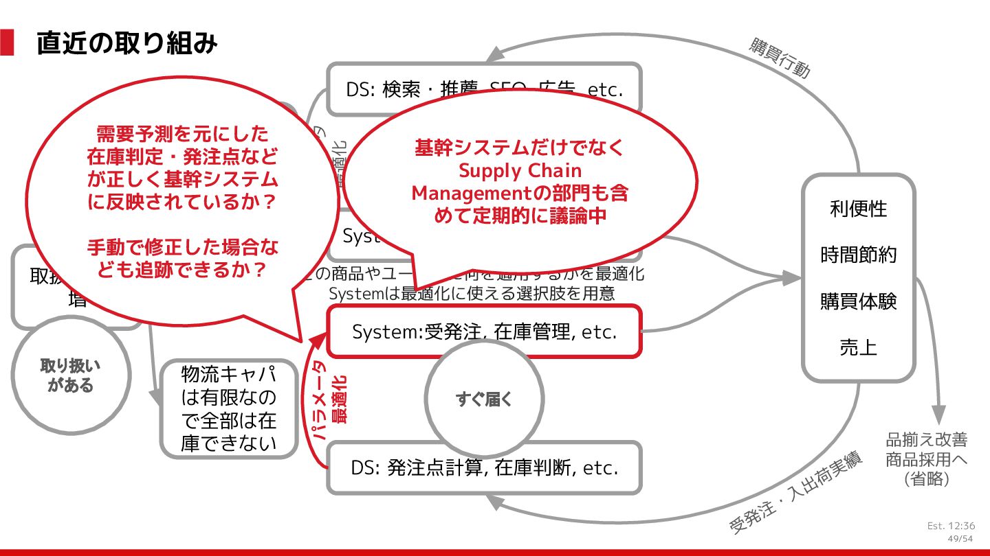 増 System:受発注, 在庫管理, etc. DS: 発注点計算, 在庫判断, etc. DS: 検索・推薦, SEO, 広告, etc. すぐ 見つかる すぐ届く サイトが複 雑で探しづ らい 物流キャパ は有限なの で全部は在 庫できない パラメータ 最適化 パラメータ 最適化 取り扱い がある 購買行動 品揃え改善 商品採用へ (省略) 受 発 注 ・ 入 出 荷 実 績 どの商品やユーザーに何を適用するかを最適化 Systemは最適化に使える選択肢を用意 需要予測を元にした 在庫判定・発注点など が正しく基幹システム に反映されているか? 手動で修正した場合な ども追跡できるか? 基幹システムだけでなく Supply Chain Managementの部門も含 めて定期的に議論中 Est. 12:36