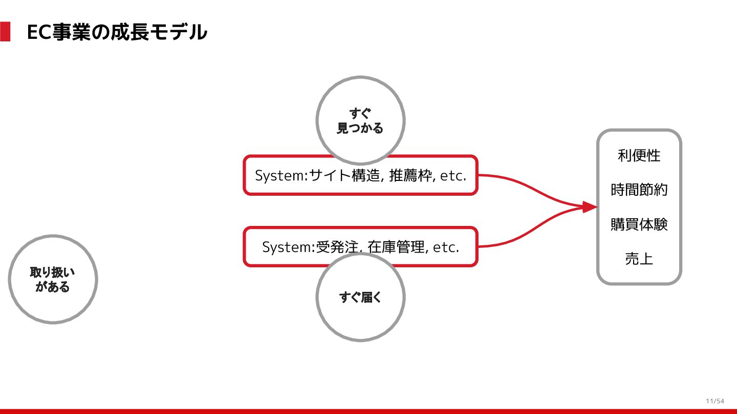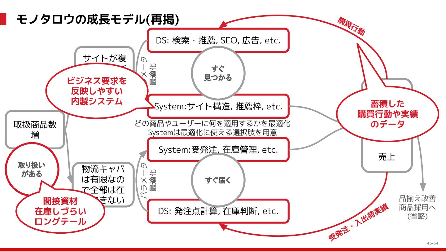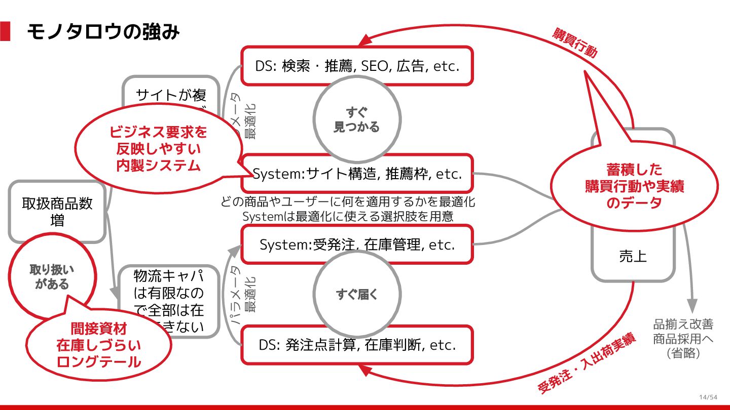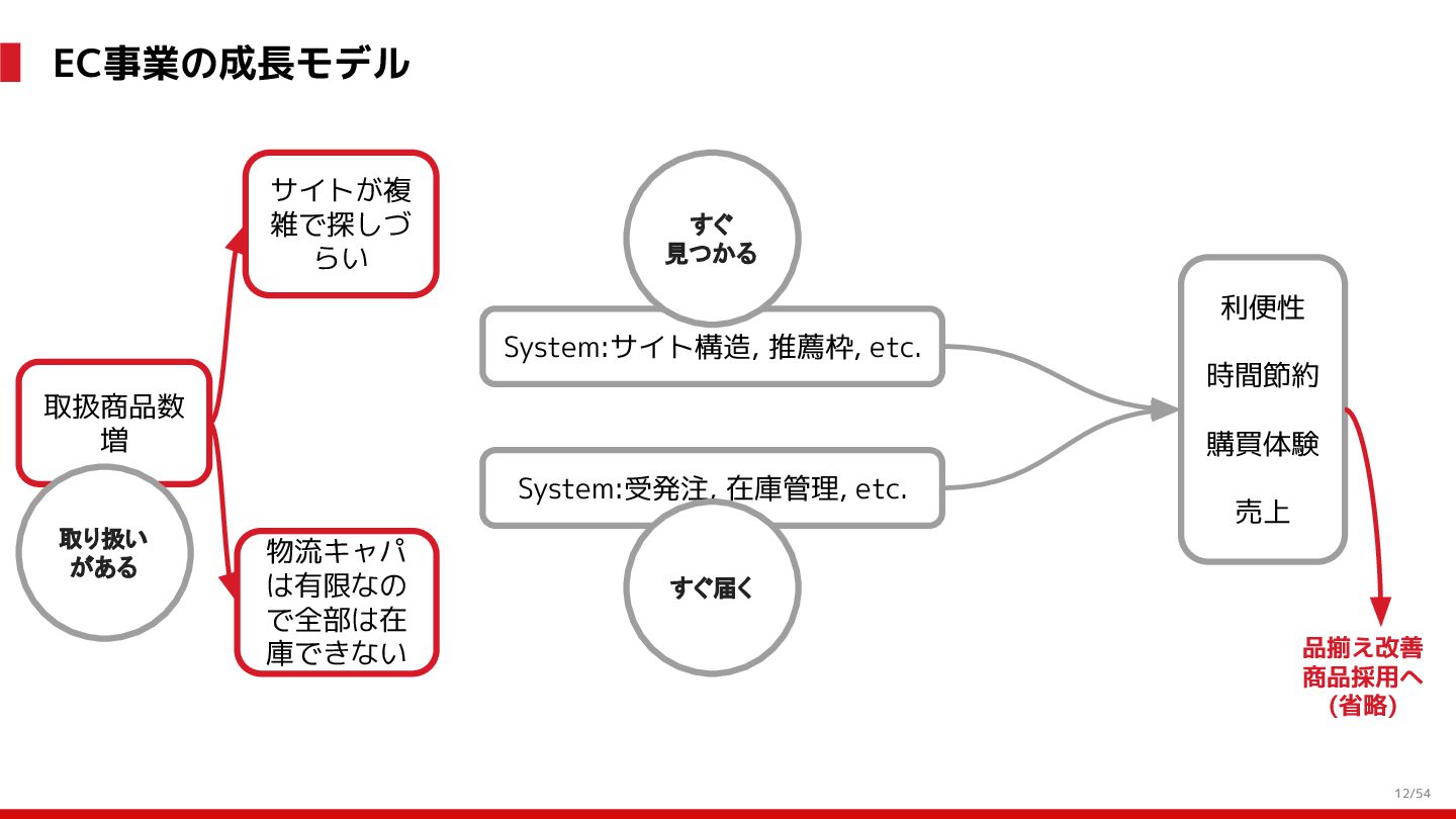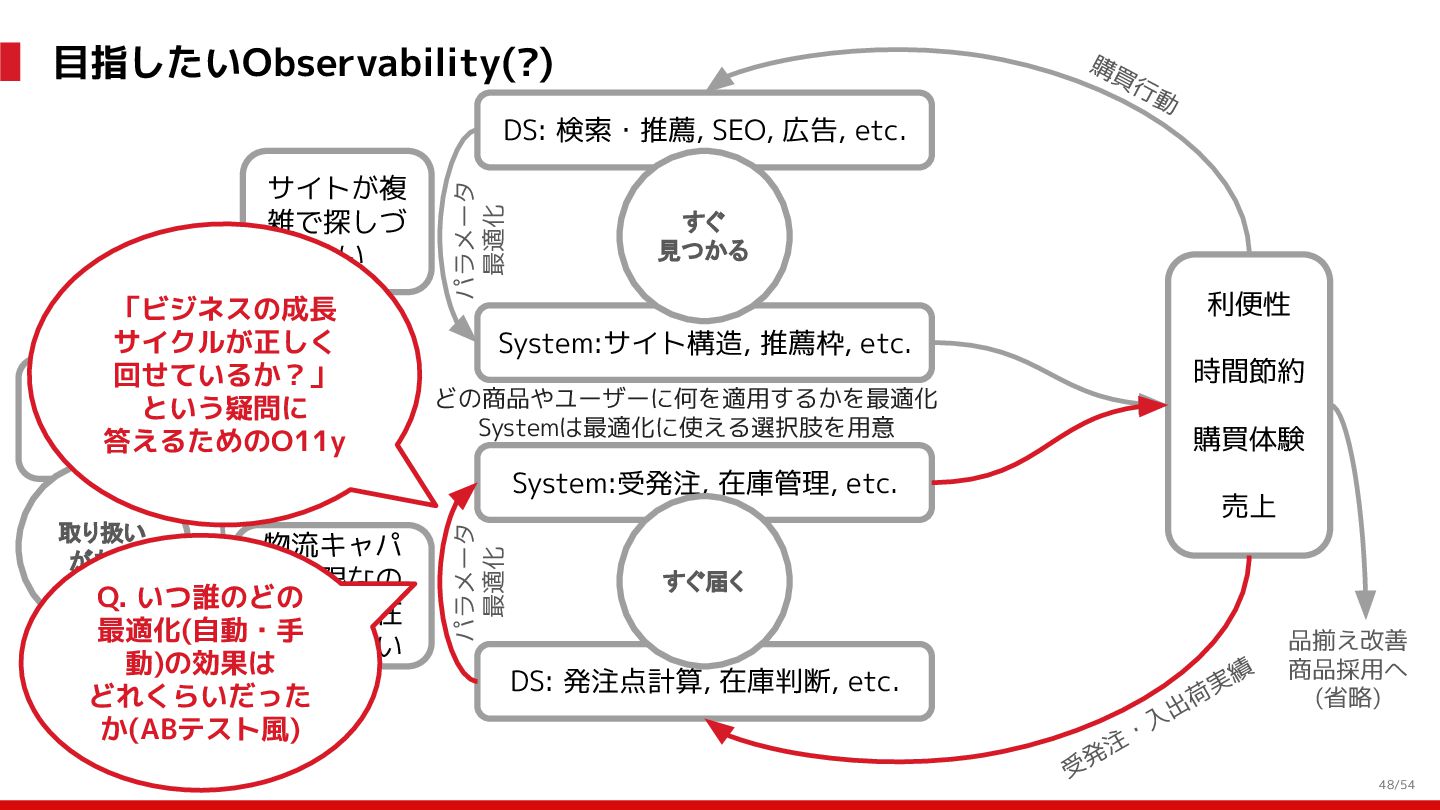 増 System:受発注, 在庫管理, etc. DS: 発注点計算, 在庫判断, etc. DS: 検索・推薦, SEO, 広告, etc. すぐ 見つかる すぐ届く サイトが複 雑で探しづ らい 物流キャパ は有限なの で全部は在 庫できない パラメータ 最適化 パラメータ 最適化 取り扱い がある 購買行動 品揃え改善 商品採用へ (省略) 受 発 注 ・ 入 出 荷 実 績 どの商品やユーザーに何を適用するかを最適化 Systemは最適化に使える選択肢を用意 需要予測を元にした 在庫判定・発注点など が正しく基幹システム に反映されているか? 手動で修正した場合な ども追跡できるか? 基幹システムだけでなく Supply Chain Managementの部門も含 めて定期的に議論中 Est. 12:36