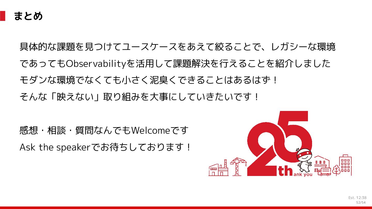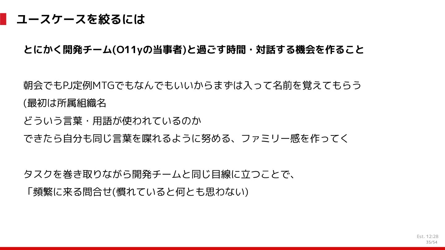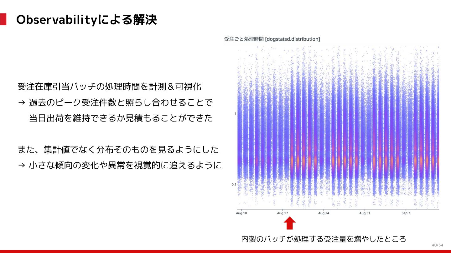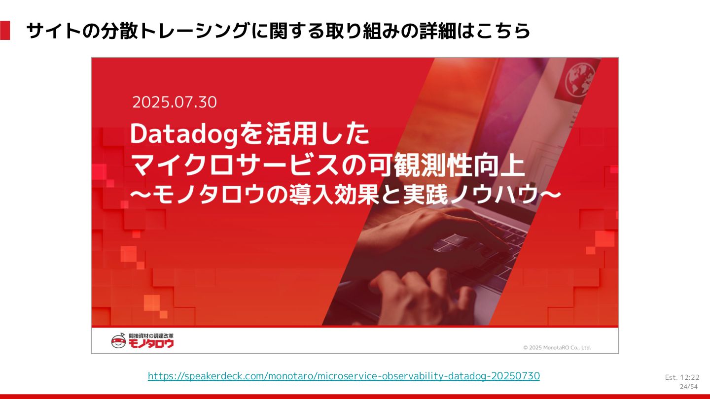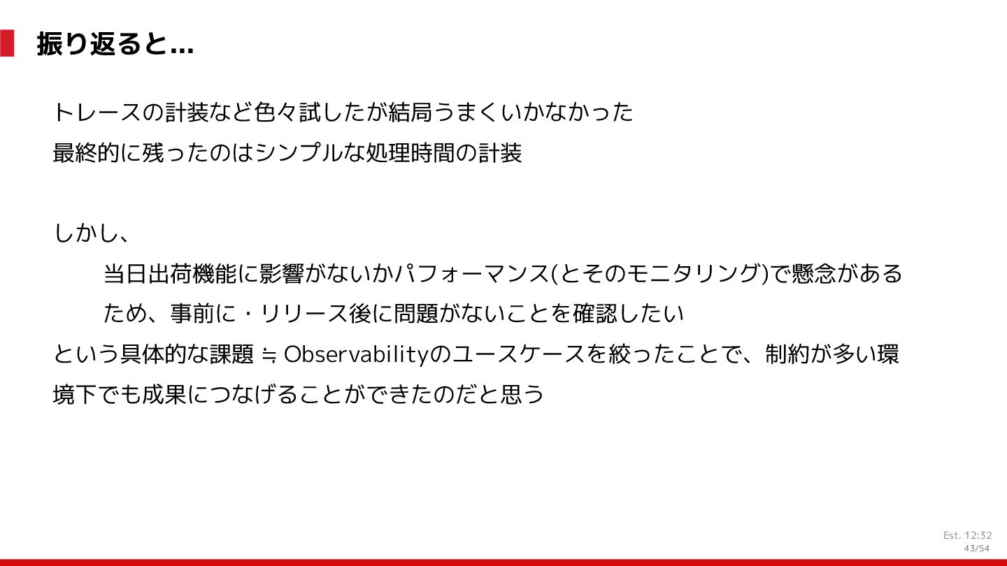 増 System:受発注, 在庫管理, etc. DS: 発注点計算, 在庫判断, etc. DS: 検索・推薦, SEO, 広告, etc. すぐ 見つかる すぐ届く サイトが複 雑で探しづ らい 物流キャパ は有限なの で全部は在 庫できない パラメータ 最適化 パラメータ 最適化 取り扱い がある 購買行動 品揃え改善 商品採用へ (省略) 受 発 注 ・ 入 出 荷 実 績 どの商品やユーザーに何を適用するかを最適化 Systemは最適化に使える選択肢を用意 需要予測を元にした 在庫判定・発注点など が正しく基幹システム に反映されているか? 手動で修正した場合な ども追跡できるか? 基幹システムだけでなく Supply Chain Managementの部門も含 めて定期的に議論中 Est. 12:36