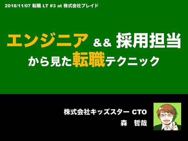 2018/11/07 (Wed) に株式会社プレイドさんで開催された「転職 LT #3」( https://ex-sier.connpass.com/event/104766/ ) にて LT したスライドです。
