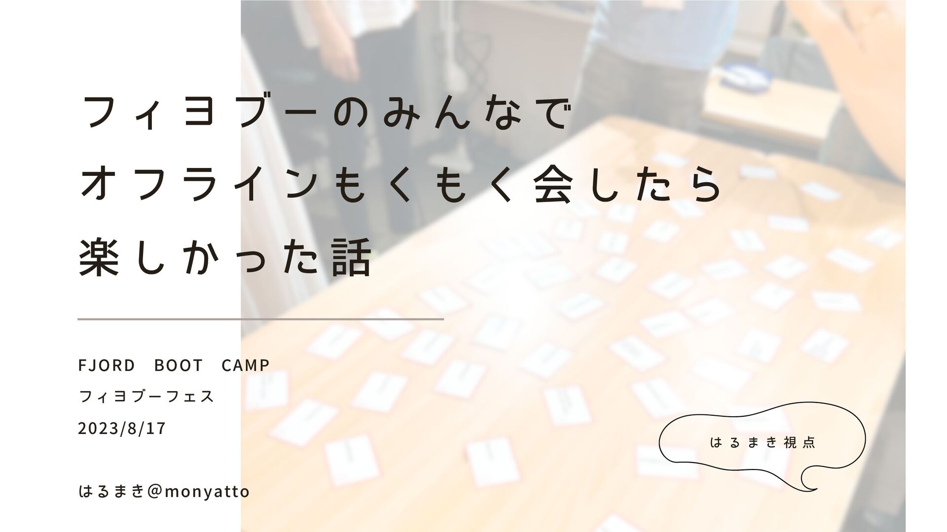 オ フ ラ イ ン も く も く 会 し た ら 楽 し か っ た 話 FJORD BOOT CAMP フィヨブーフェス 2023/8/17 はるまき@monyatto は る ま き 視 点