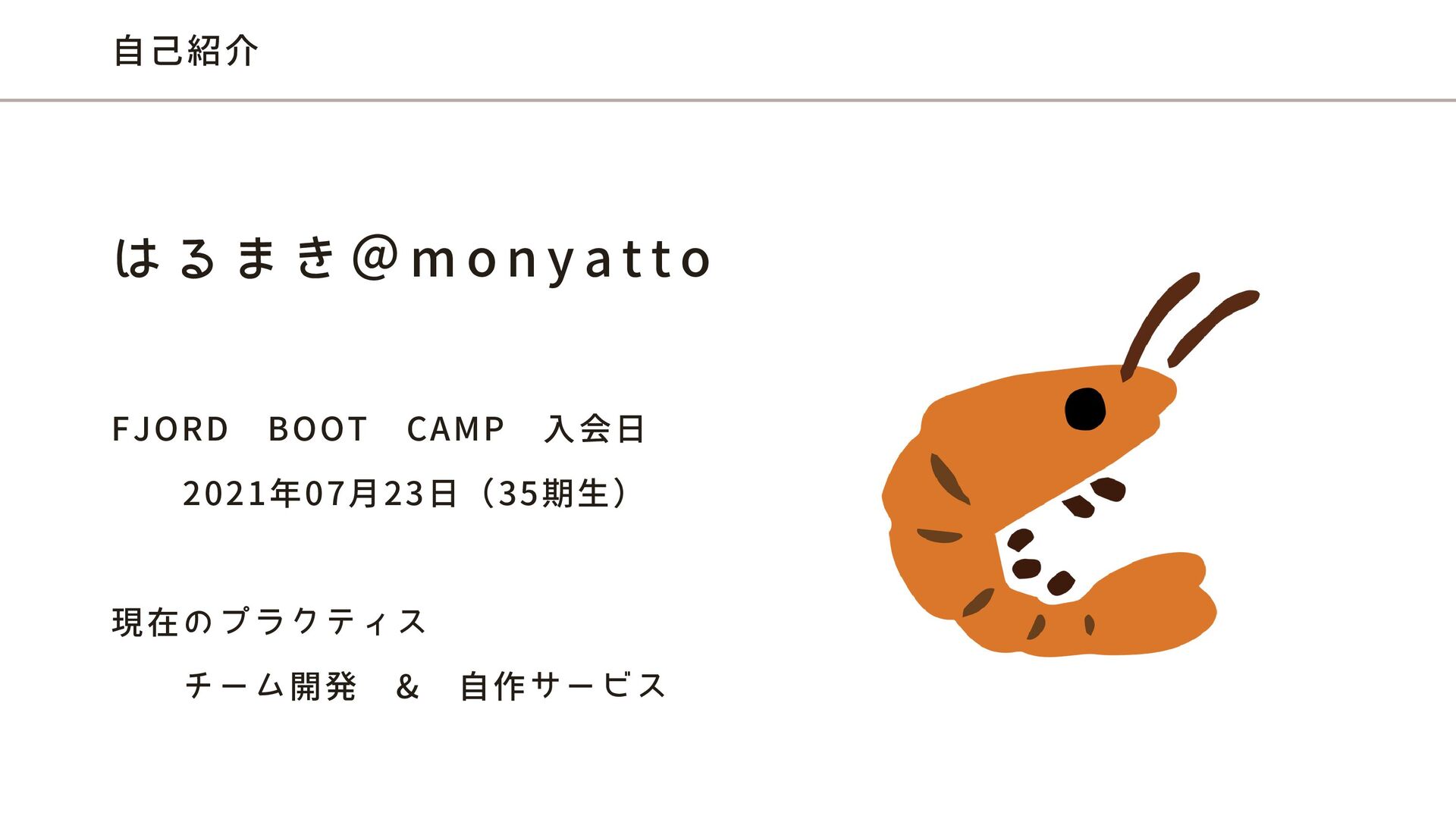 自己紹介 FJORD BOOT CAMP 入会日 2021年07月23日(35期生) 現在のプラクティス チーム開発 & 自作サービス