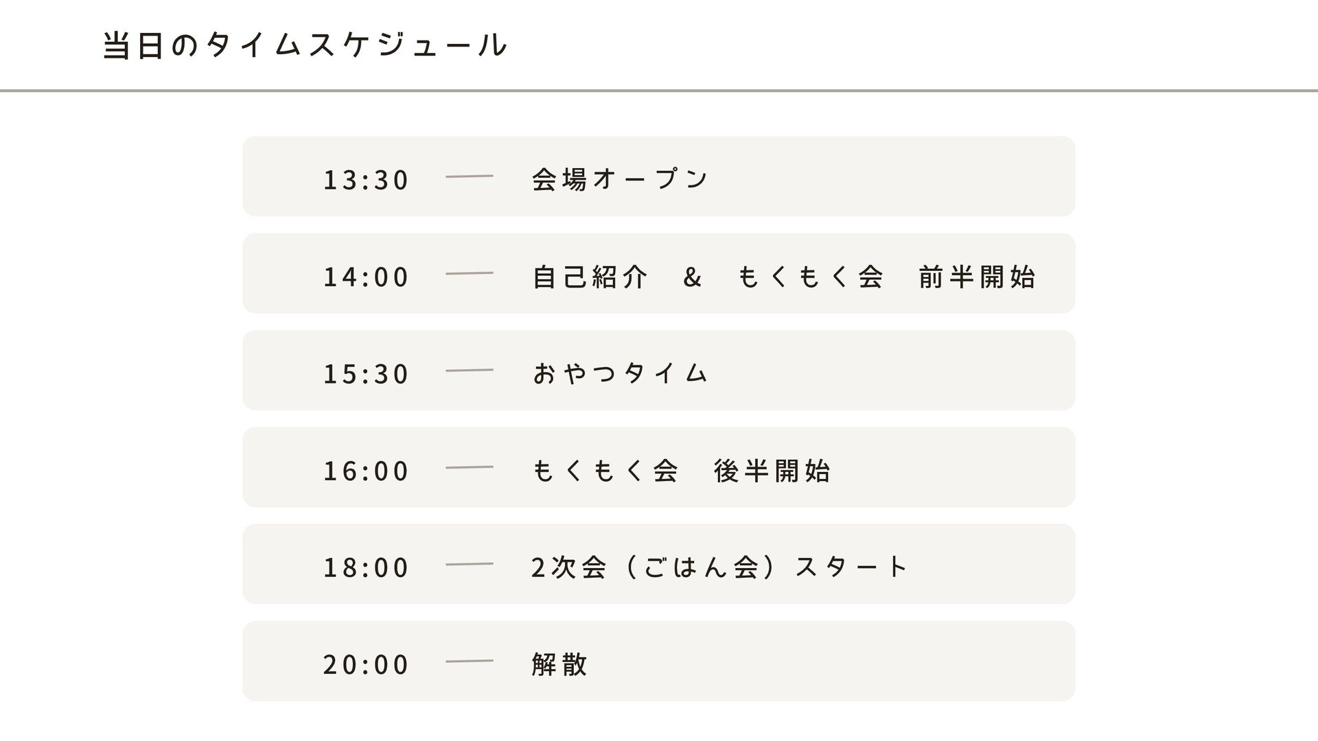 ブ ー 運 営 に 連 絡 02 レ ン タ ル ス ペ ー ス & 夜 ご 飯 予 約 03 参 加 者 募 集 04 当 日 の ア ナ ウ ン ス & 事 前 集 金 05 開 催 🎉 06