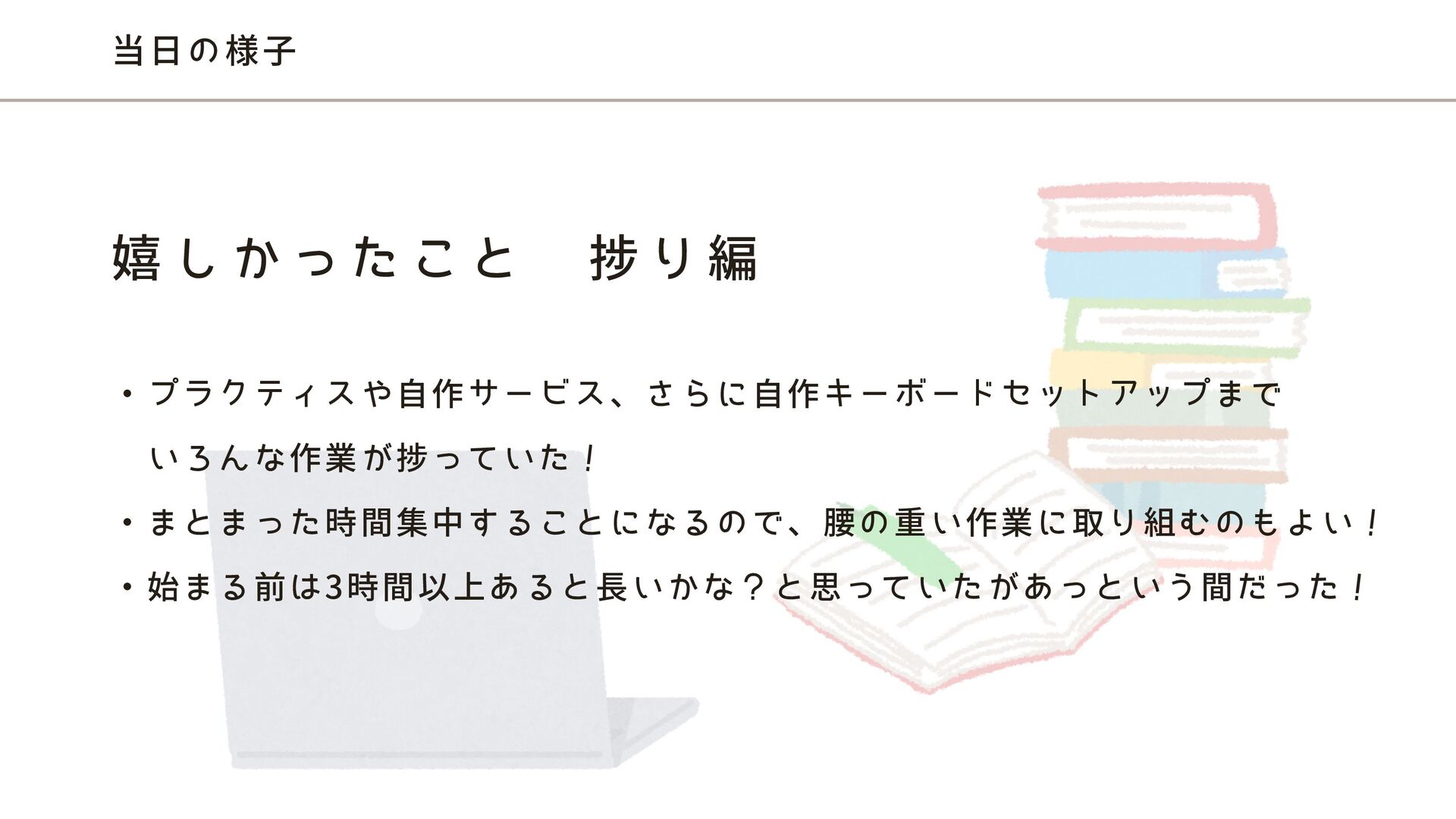 ・プラクティスや自作サービス、さらに自作キーボードセットアップまで いろんな作業が捗っていた! ・まとまった時間集中することになるので、腰の重い作業に取り組むのもよい! ・始まる前は3時間以上あると長いかな?と思っていたがあっという間だった! 当日の様子 嬉 し か っ た