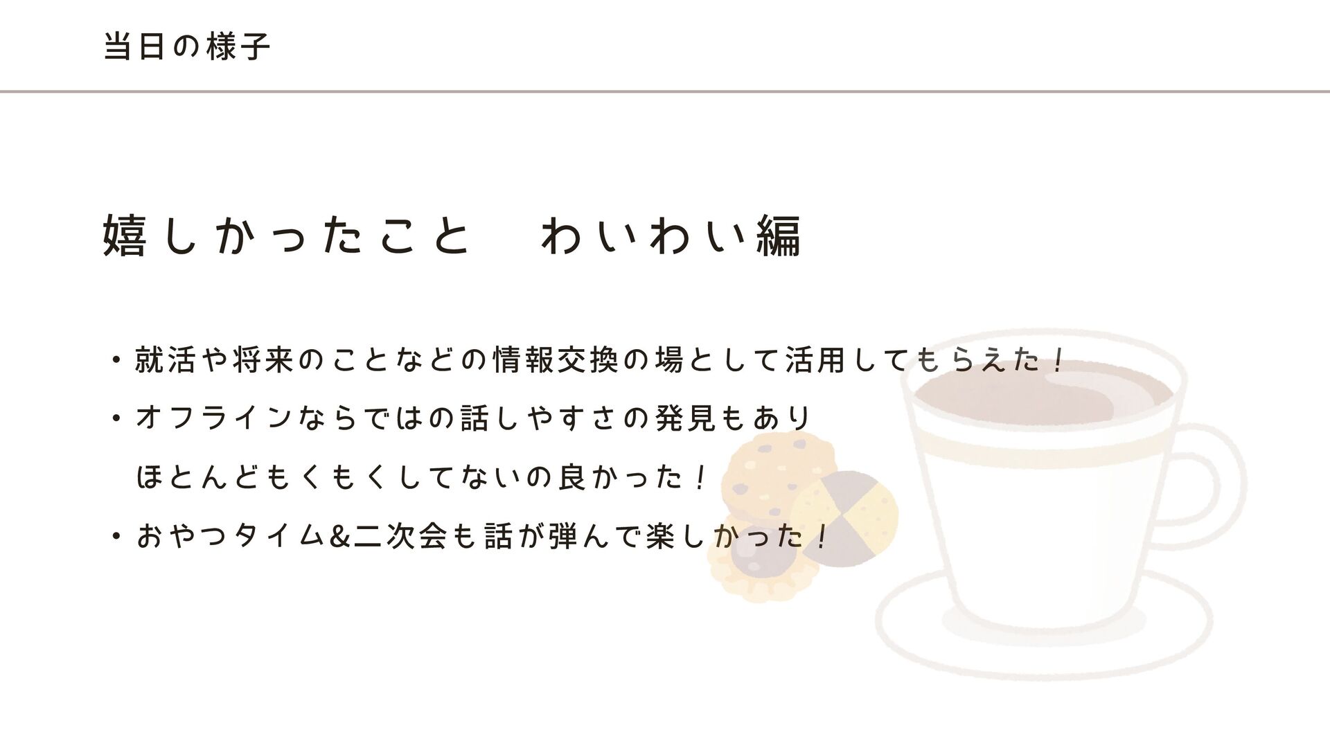 ・就活や将来のことなどの情報交換の場として活用してもらえた! ・オフラインならではの話しやすさの発見もあり ほとんどもくもくしてないの良かった! ・おやつタイム&二次会も話が弾んで楽しかった! 当日の様子 嬉 し か っ た