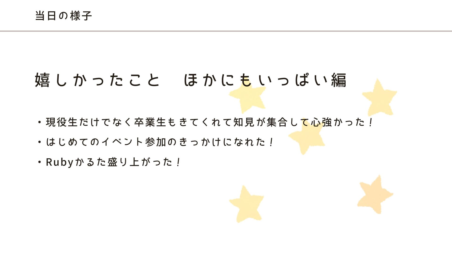 当日の様子 ・現役生だけでなく卒業生もきてくれて知見が集合して心強かった! ・はじめてのイベント参加のきっかけになれた! ・Rubyかるた盛り上がった! 嬉 し か っ た こ
