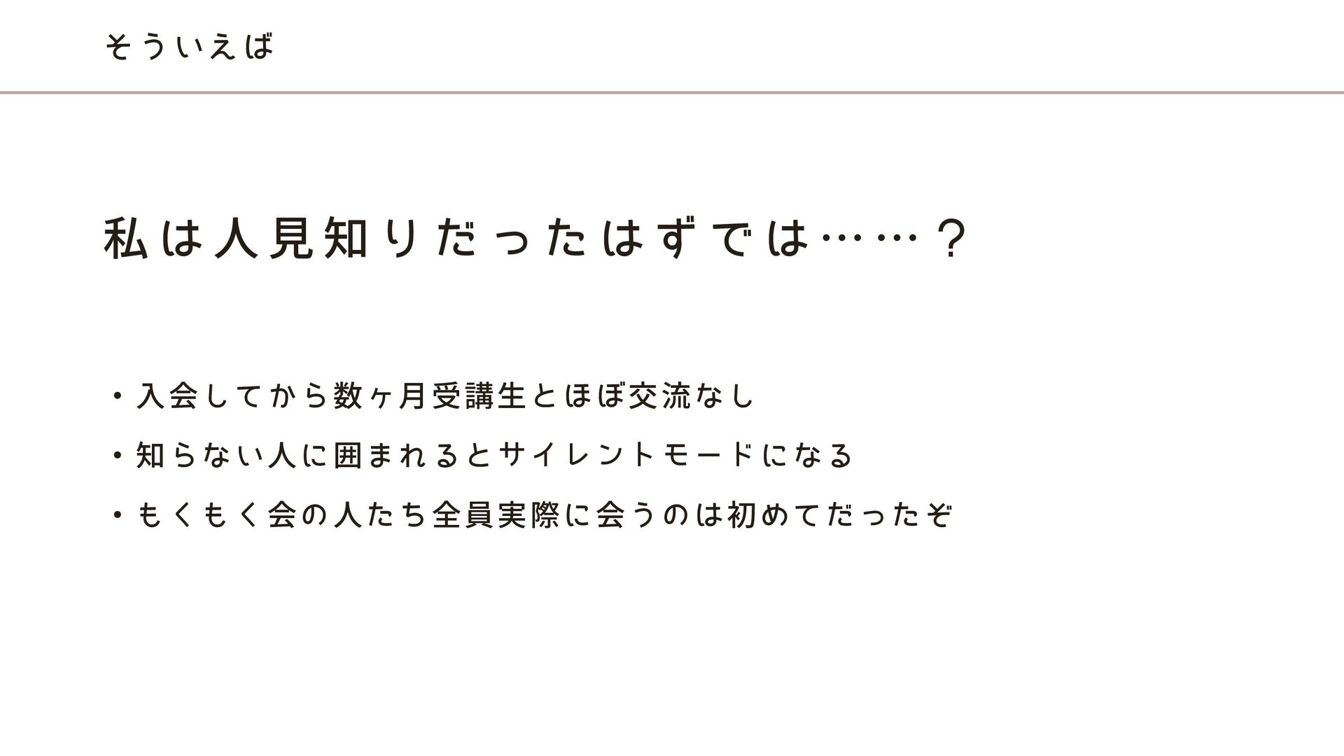 そういえば ・入会してから数ヶ月受講生とほぼ交流なし ・知らない人に囲まれるとサイレントモードになる ・もくもく会の人たち全員実際に会うのは初めてだったぞ 私 は 人 見 知 り