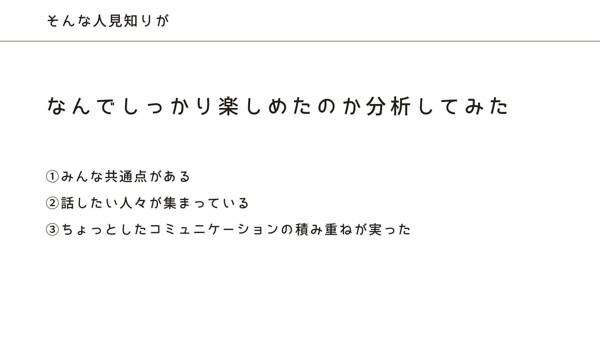 め た の か 分 析 し て み た ①みんな共通点がある ②話したい人々が集まっている ③ちょっとしたコミュニケーションの積み重ねが実った
