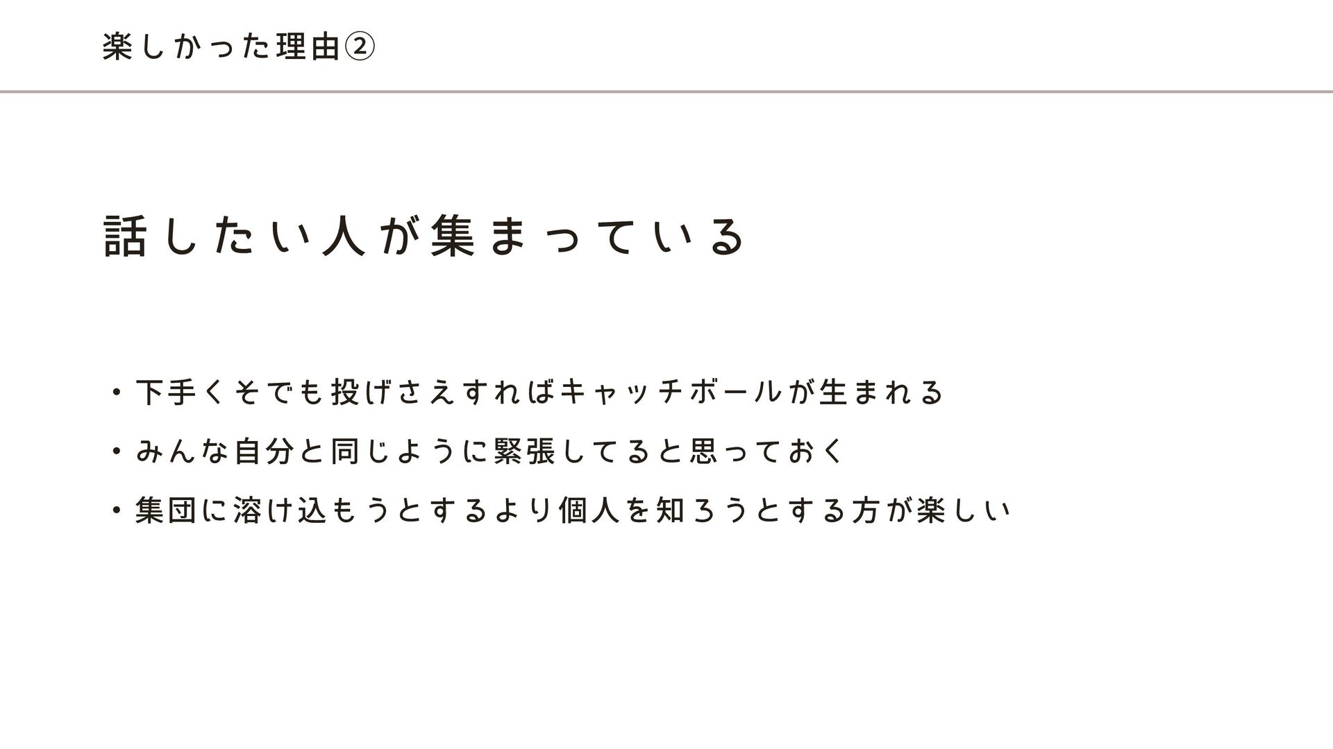 楽しかった理由② ・下手くそでも投げさえすればキャッチボールが生まれる ・みんな自分と同じように緊張してると思っておく ・集団に溶け込もうとするより個人を知ろうとする方が楽しい 話 し た い 人 が