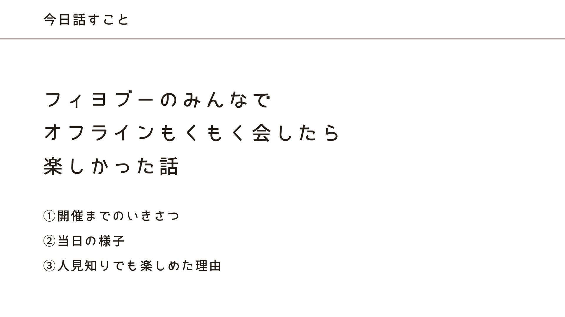 今日話すこと ①開催までのいきさつ ②当日の様子 ③人見知りでも楽しめた理由 フ ィ ヨ ブ ー の