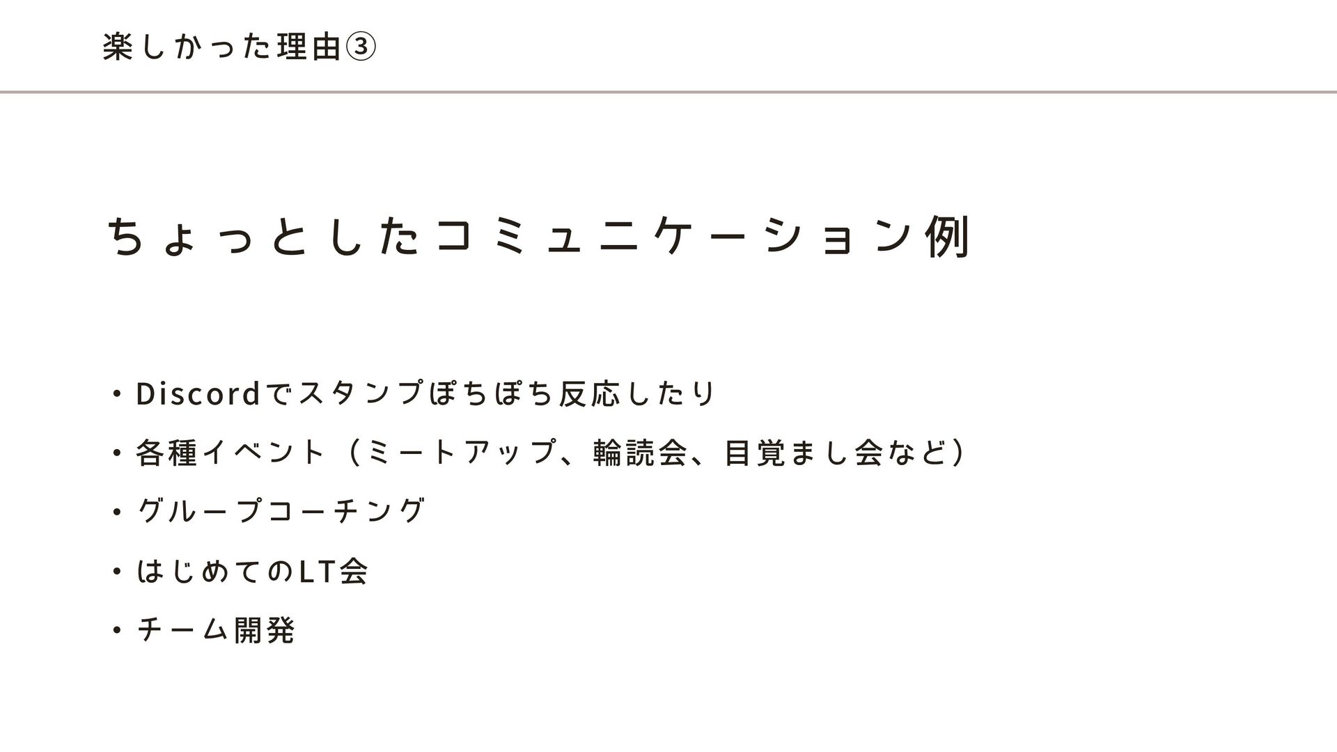 楽しかった理由③ ・Discordでスタンプぽちぽち反応したり ・各種イベント(ミートアップ、輪読会、目覚まし会など) ・グループコーチング ・はじめてのLT会 ・チーム開発 ち ょ っ と