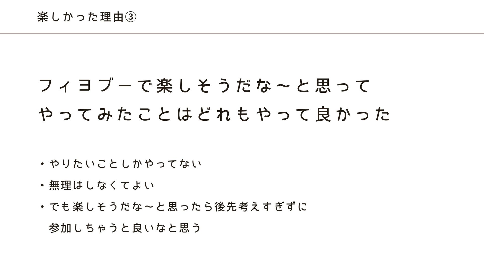 楽しかった理由③ ・やりたいことしかやってない ・無理はしなくてよい ・でも楽しそうだな〜と思ったら後先考えすぎずに 参加しちゃうと良いなと思う フ ィ ヨ ブ ー