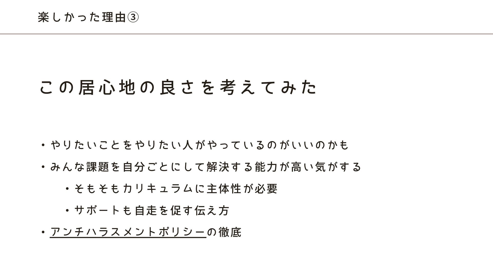 楽しかった理由③ ・やりたいことをやりたい人がやっているのがいいのかも ・みんな課題を自分ごとにして解決する能力が高い気がする ・そもそもカリキュラムに主体性が必要 ・サポートも自走を促す伝え方 ・アンチハラスメントポリシーの徹底 こ の 居 心