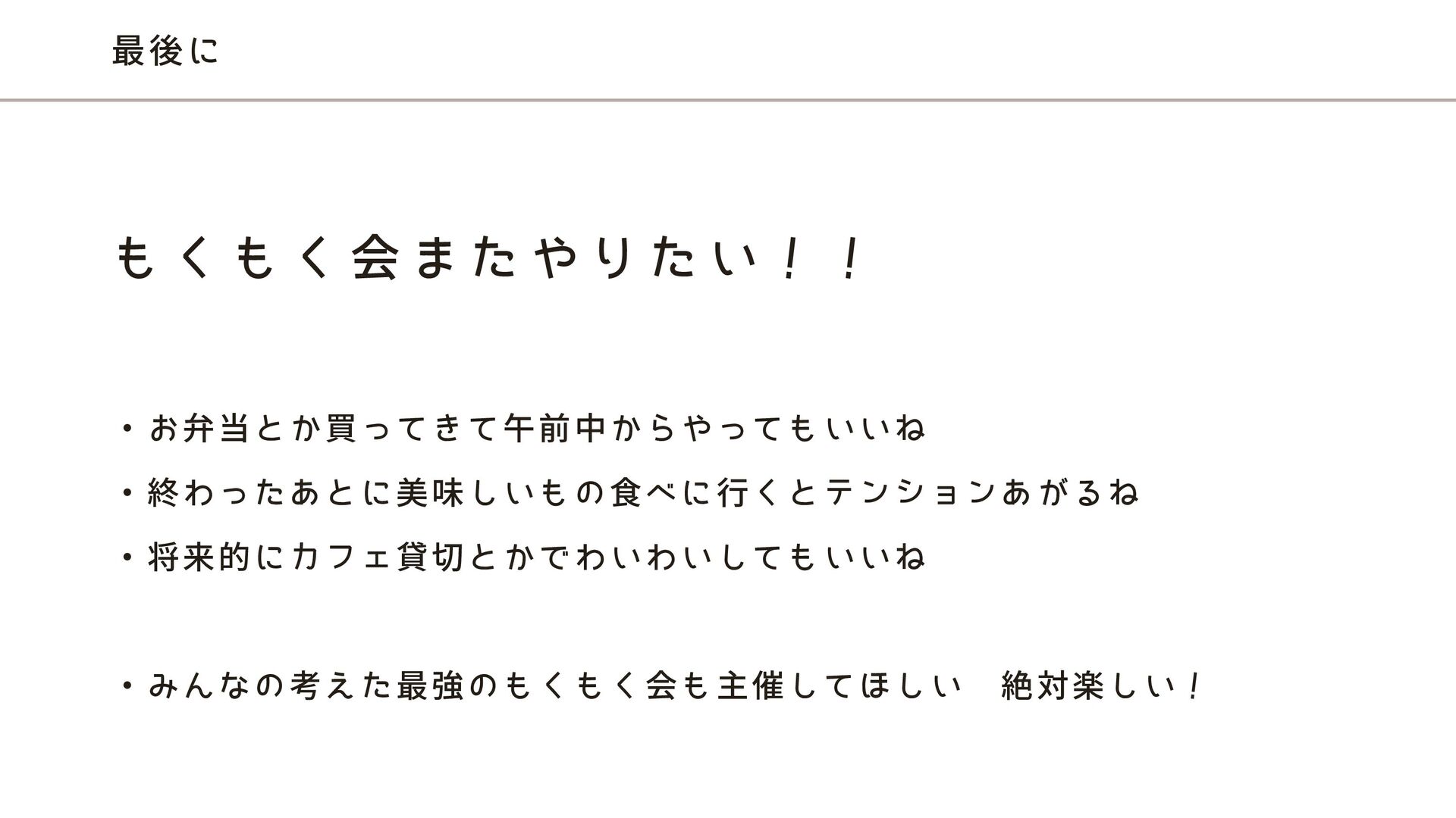 最後に ・お弁当とか買ってきて午前中からやってもいいね ・終わったあとに美味しいもの食べに行くとテンションあがるね ・将来的にカフェ貸切とかでわいわいしてもいいね ・みんなの考えた最強のもくもく会も主催してほしい 絶対楽しい! も く も く 会