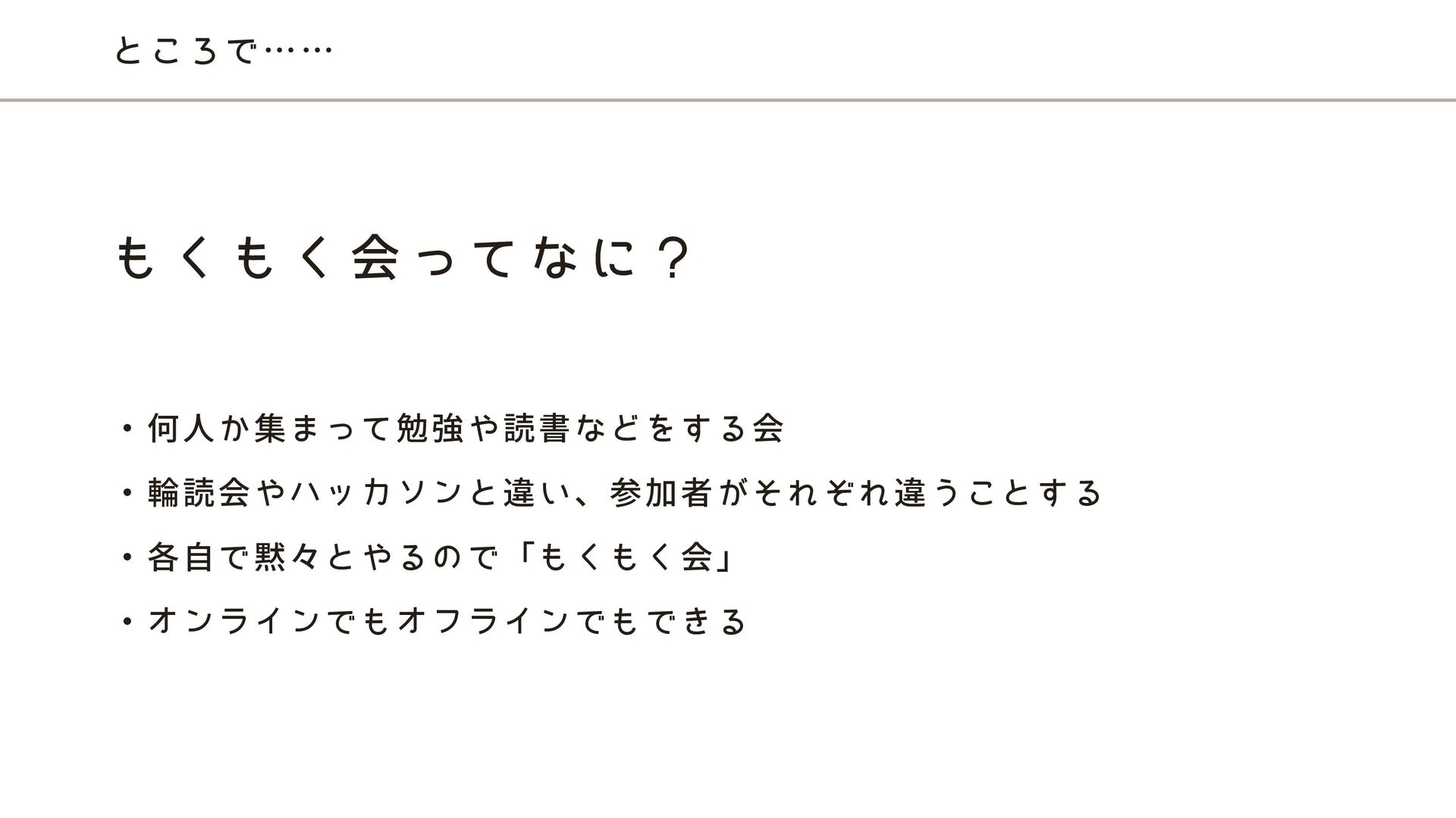 ところで…… ・何人か集まって勉強や読書などをする会 ・輪読会やハッカソンと違い、参加者がそれぞれ違うことする ・各自で黙々とやるので「もくもく会」 ・オンラインでもオフラインでもできる も く も く 会