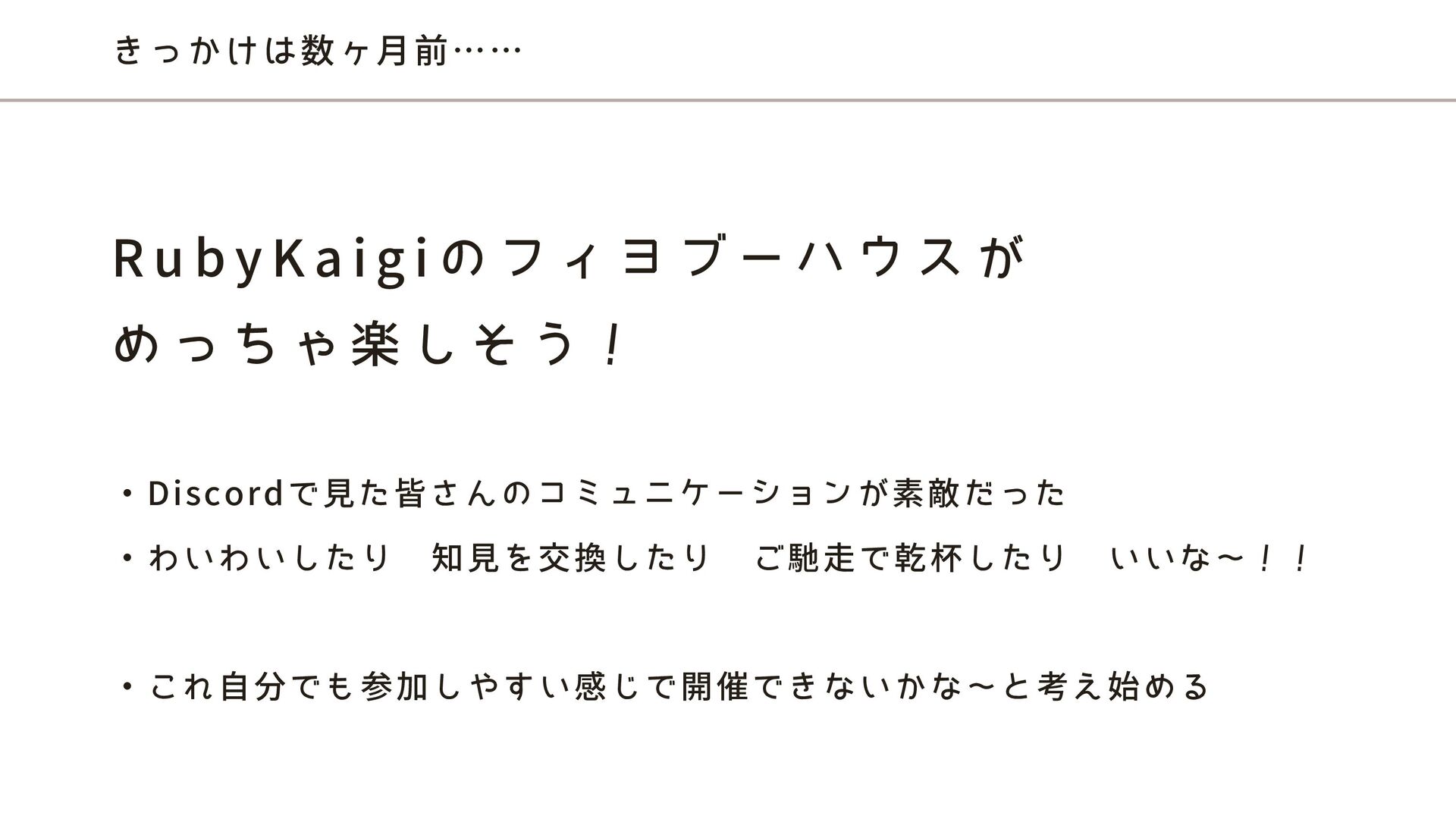 きっかけは数ヶ月前…… ・Discordで見た皆さんのコミュニケーションが素敵だった ・わいわいしたり 知見を交換したり ご馳走で乾杯したり いいな〜!! ・これ自分でも参加しやすい感じで開催できないかな〜と考え始める R u b y K a