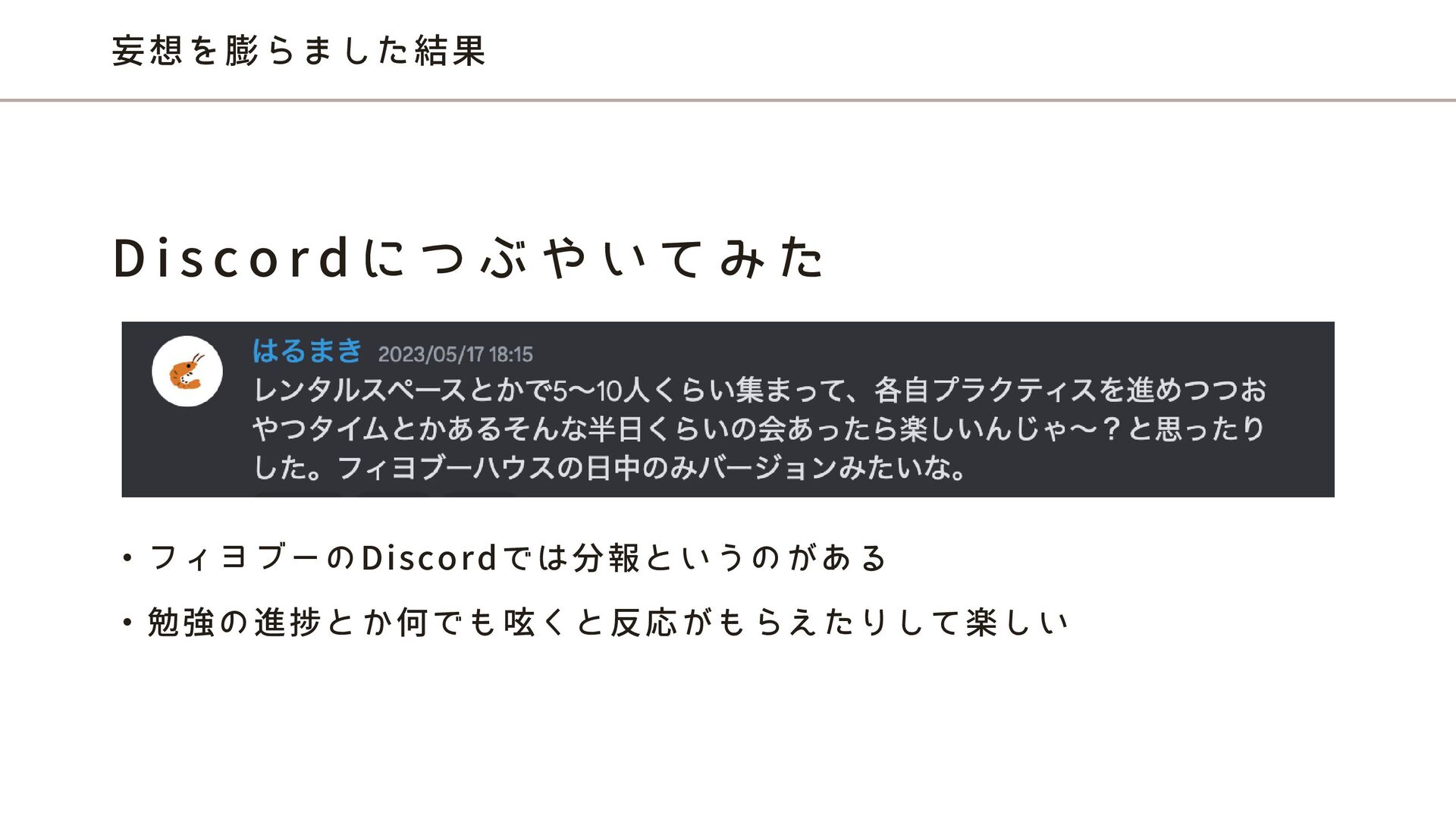 ぶ や い て み た ・フィヨブーのDiscordでは分報というのがある ・勉強の進捗とか何でも呟くと反応がもらえたりして楽しい