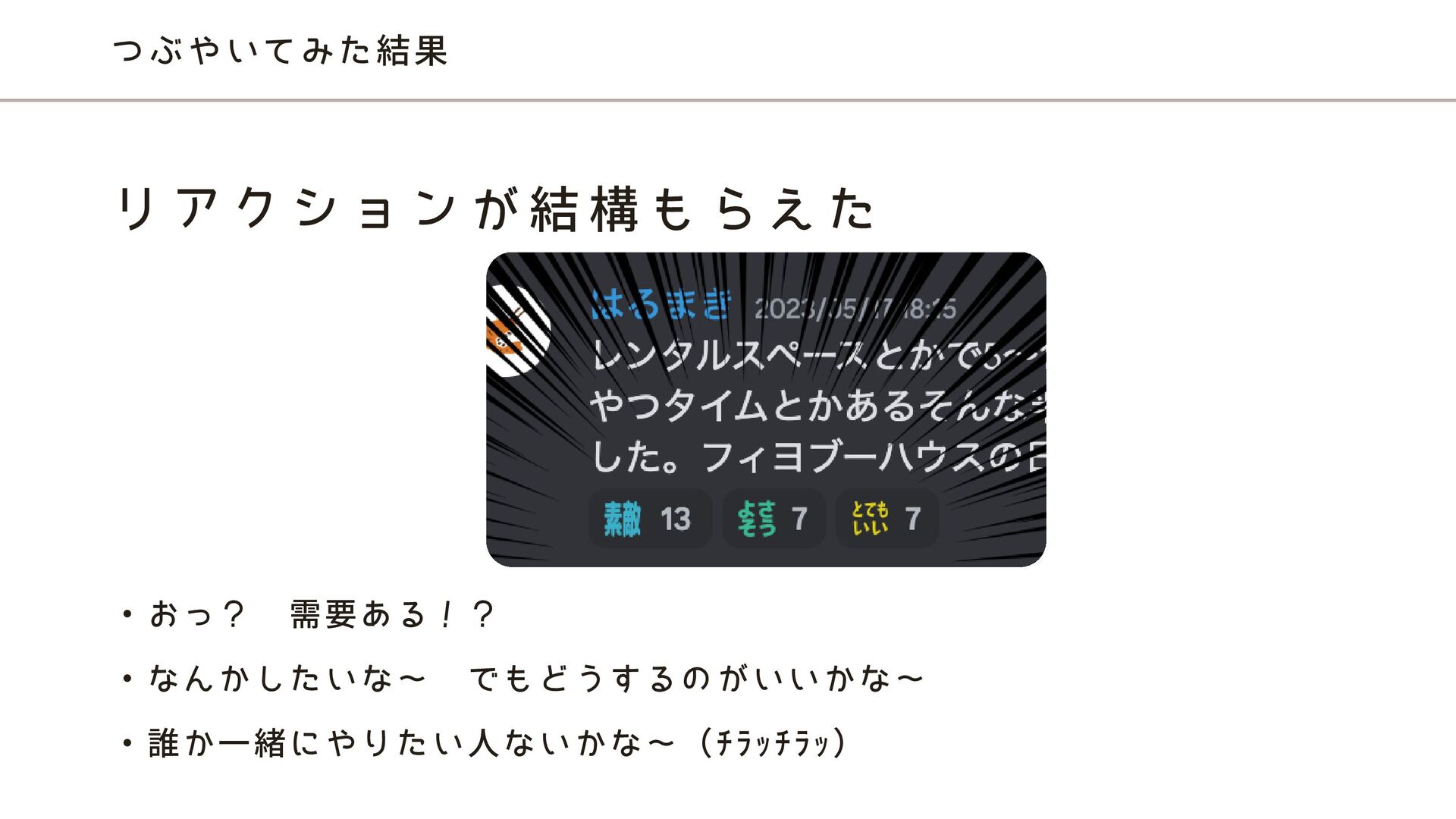 つぶやいてみた結果 ・おっ? 需要ある!? ・なんかしたいな〜 でもどうするのがいいかな〜 ・誰か一緒にやりたい人ないかな〜(チラッチラッ) リ ア ク シ ョ ン