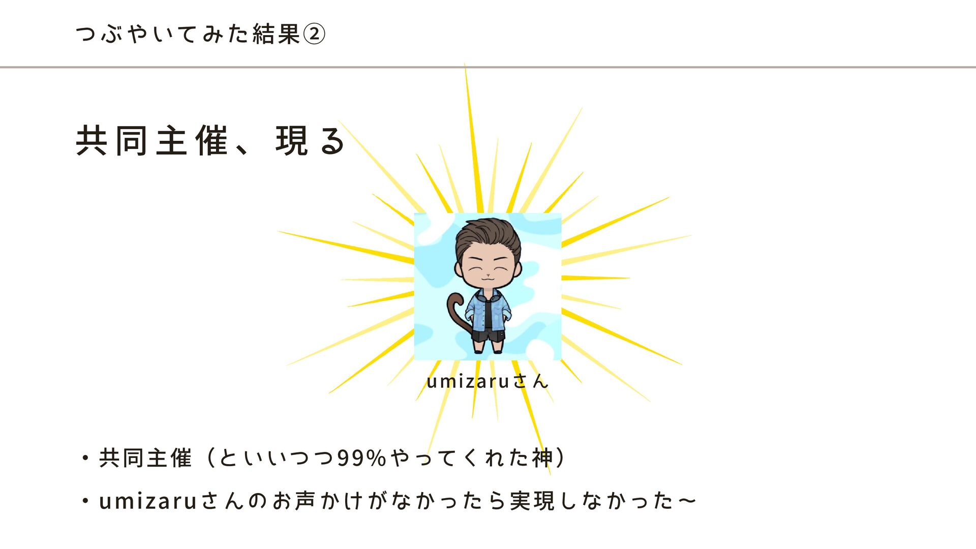 つぶやいてみた結果② 共 同 主 催 、 現 る ・共同主催(といいつつ99%やってくれた神) ・umizaruさんのお声かけがなかったら実現しなかった〜