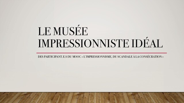 2020, deux nouvelles activités ont été proposées aux inscrits au MOOC. Dans celle-ci, nous demandions aux mooqueuses et aux mooqueurs de se glisser dans la peau d’un collectionneur du XIXe siècle et de créer leur propre « musée impressionniste idéal » à l’aide de l’application en ligne Padlet. Découvrez leurs réalisations ! Des participant.e.s au MOOC « L’impressionnisme, du scandale à la consécration » Retrouvez ci-dessous les liens vers leurs musées en ligne : https://padlet.com/doudoulolita/kk3bcpwfsll78ajm https://padlet.com/noelgenevieve/6gnnjr13d1vslzcu https://padlet.com/eglymusique/4m5yq0su7kzomvia https://padlet.com/matisleggiadro/tmfvjmsze40w https://fr.padlet.com/noelgenevieve/k5qbobqt4rcq https://padlet.com/lynnrovida/ldf8nyq2iaao https://padlet.com/beawell/wik7auqiquvv https://padlet.com/geraldinelimon/txnwsolauy3m https://padlet.com/PatitaL/4qvzlouvlyv2 https://padlet.com/gerathon/w9bqx7e6kxru https://fr.padlet.com/noelgenevieve/rrf6iiiw4o4q https://padlet.com/stephgaiga/xpyajb4c9xn2mng0