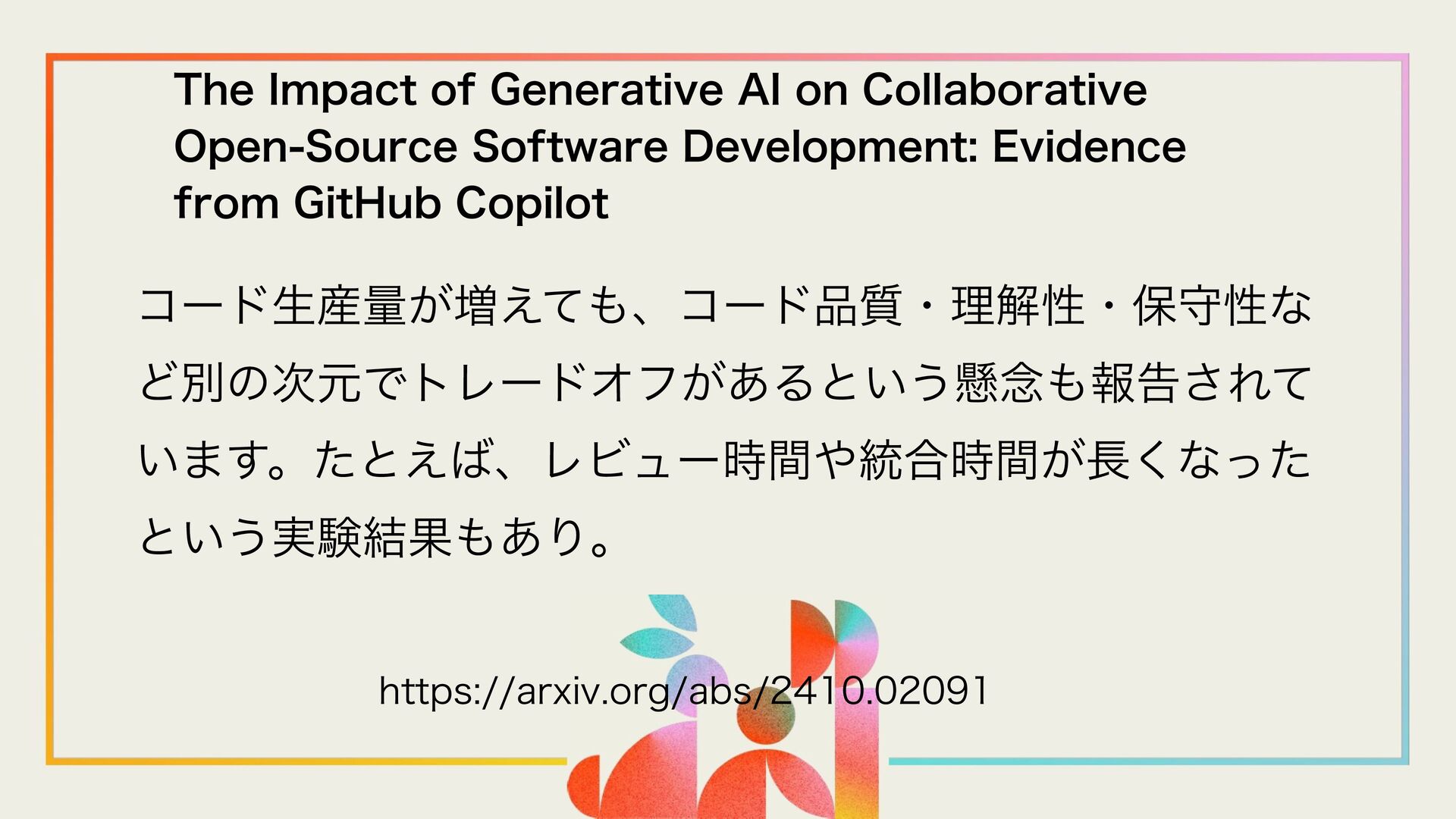 ίʔυੜ࢈ྔ͕૿͑ͯɺίʔυ࣭ɾཧղੑɾอकੑͳ Ͳผͷ࣍ݩͰτϨʔυΦϑ͕͋Δͱ͍͏ݒ೦ใࠂ͞Εͯ ͍·͢ɻͨͱ͑ɺϨϏϡʔ࣌ؒ౷߹͕࣌ؒ͘ͳͬͨ ͱ͍͏࣮ݧ݁Ռ͋Γɻ 5IF*NQBDUPG(FOFSBUJWF"*PO$PMMBCPSBUJWF 0QFO4PVSDF4PGUXBSF%FWFMPQNFOU&WJEFODF GSPN(JU)VC$PQJMPU IUUQTBSYJWPSHBCT