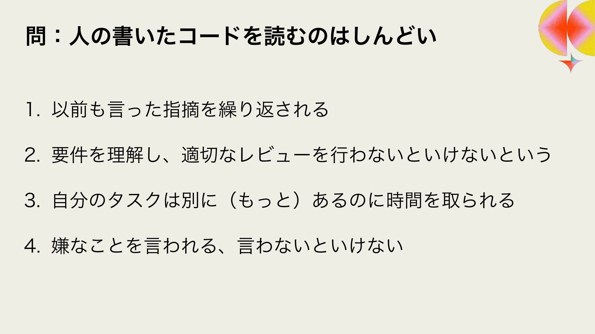 ɿਓͷॻ͍ͨίʔυΛಡΉͷ͠ΜͲ͍ ҎલݴͬͨࢦఠΛ܁Γฦ͞ΕΔ ཁ݅Λཧղ͠ɺదͳϨϏϡʔΛߦΘͳ͍ͱ͍͚ͳ͍ͱ͍͏ ࣗͷλεΫผʹʢͬͱʣ͋Δͷʹ࣌ؒΛऔΒΕΔ ݏͳ͜ͱΛݴΘΕΔɺݴΘͳ͍ͱ͍͚ͳ͍