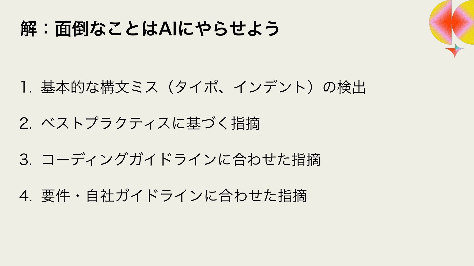 ղɿ໘ͳ͜ͱ"*ʹΒͤΑ͏ جຊతͳߏจϛεʢλΠϙɺΠϯσϯτʣͷݕग़ ϕετϓϥΫςΟεʹجͮ͘ࢦఠ ίʔσΟϯάΨΠυϥΠϯʹ߹Θͤͨࢦఠ ཁ݅ɾࣗࣾΨΠυϥΠϯʹ߹Θͤͨࢦఠ