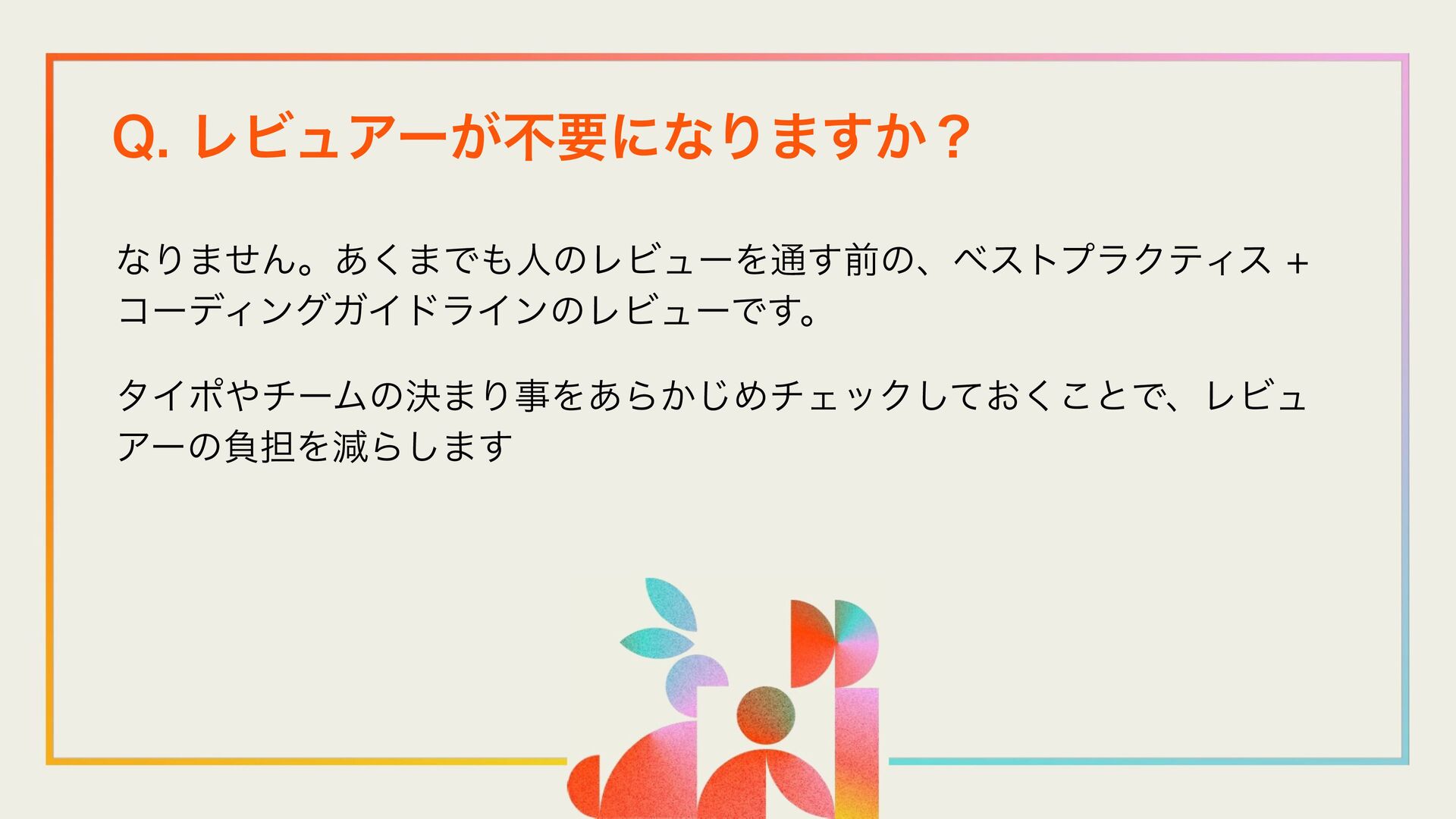 ϓϥοτϑΥʔϜ৫Λ࣋ͭҎ্Ͱ"*ಋೖࡁΈʢͨͩ͠ɺ ׂͷ৫ίʔυੜΛ৴པ͍ͯ͠ͳ͍ʣ "*ʹΑͬͯίʔυͷੜमਖ਼্͕ΔҰํɺϨϏϡʔɾ ςετɾ࿈ܞମ੍͕͍͔ͭͳ͍ͱɺϦϦʔε࣭͕༳Β͙ %03"4UBUFPG"*BTTJTUFE4PGUXBSF %FWFMPQNFOUΑΓ IUUQTDMPVEHPPHMFDPNSFTPVSDFTDPOUFOUEPSBBJBTTJTUFE TPGUXBSFEFWFMPQNFOUSFQPSU