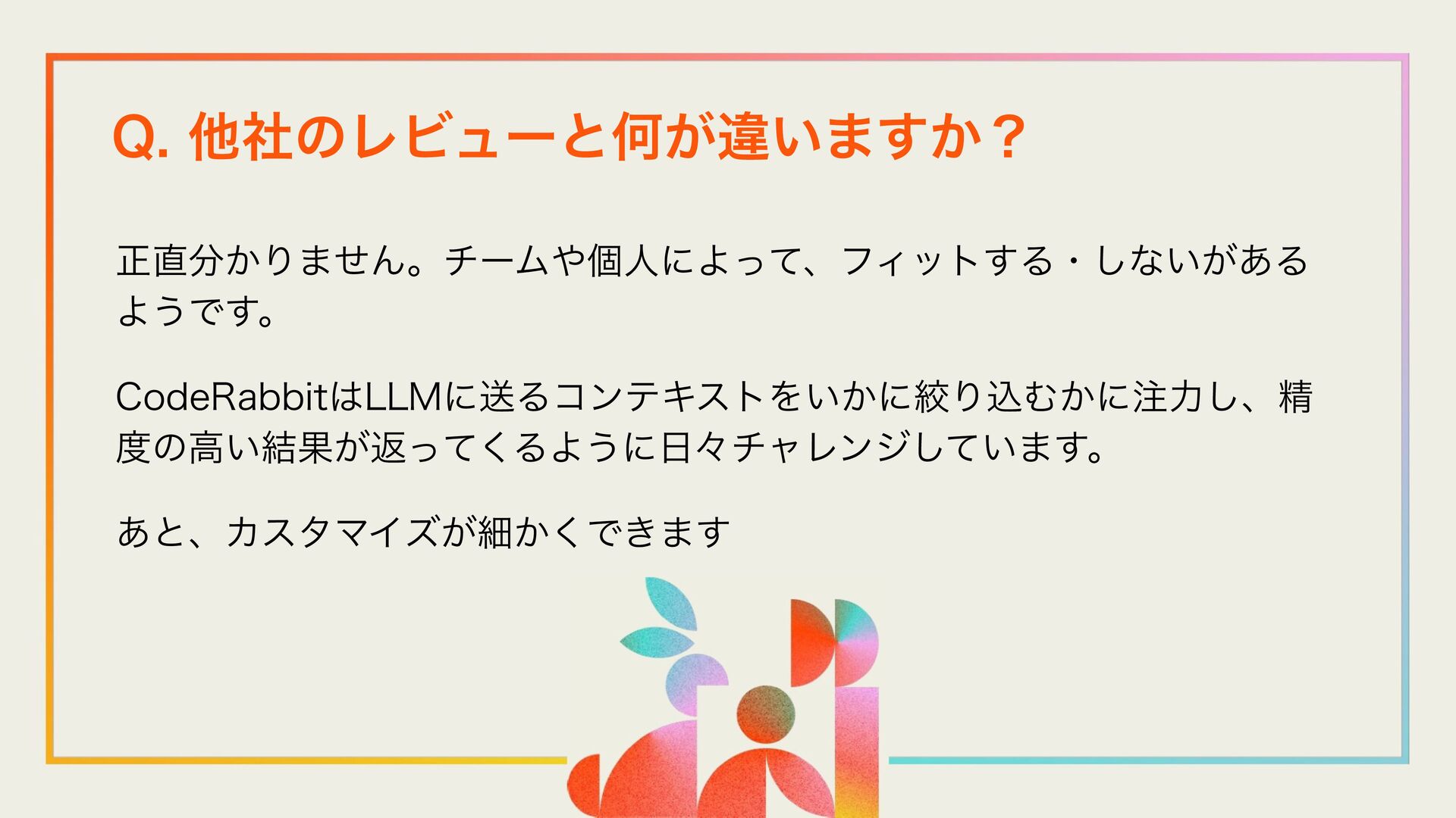 2ଞࣾͷϨϏϡʔͱԿ͕ҧ͍·͔͢ʁ ਖ਼͔Γ·ͤΜɻνʔϜݸਓʹΑͬͯɺϑΟοτ͢Δɾ͠ͳ͍͕͋Δ Α͏Ͱ͢ɻ $PEF3BCCJU--.ʹૹΔίϯςΩετΛ͍͔ʹߜΓࠐΉ͔ʹྗ͠ɺਫ਼ ͷߴ͍݁Ռ͕ฦͬͯ͘ΔΑ͏ʹʑνϟϨϯδ͍ͯ͠·͢ɻ ͋ͱɺΧελϚΠζ͕ࡉ͔͘Ͱ͖·͢