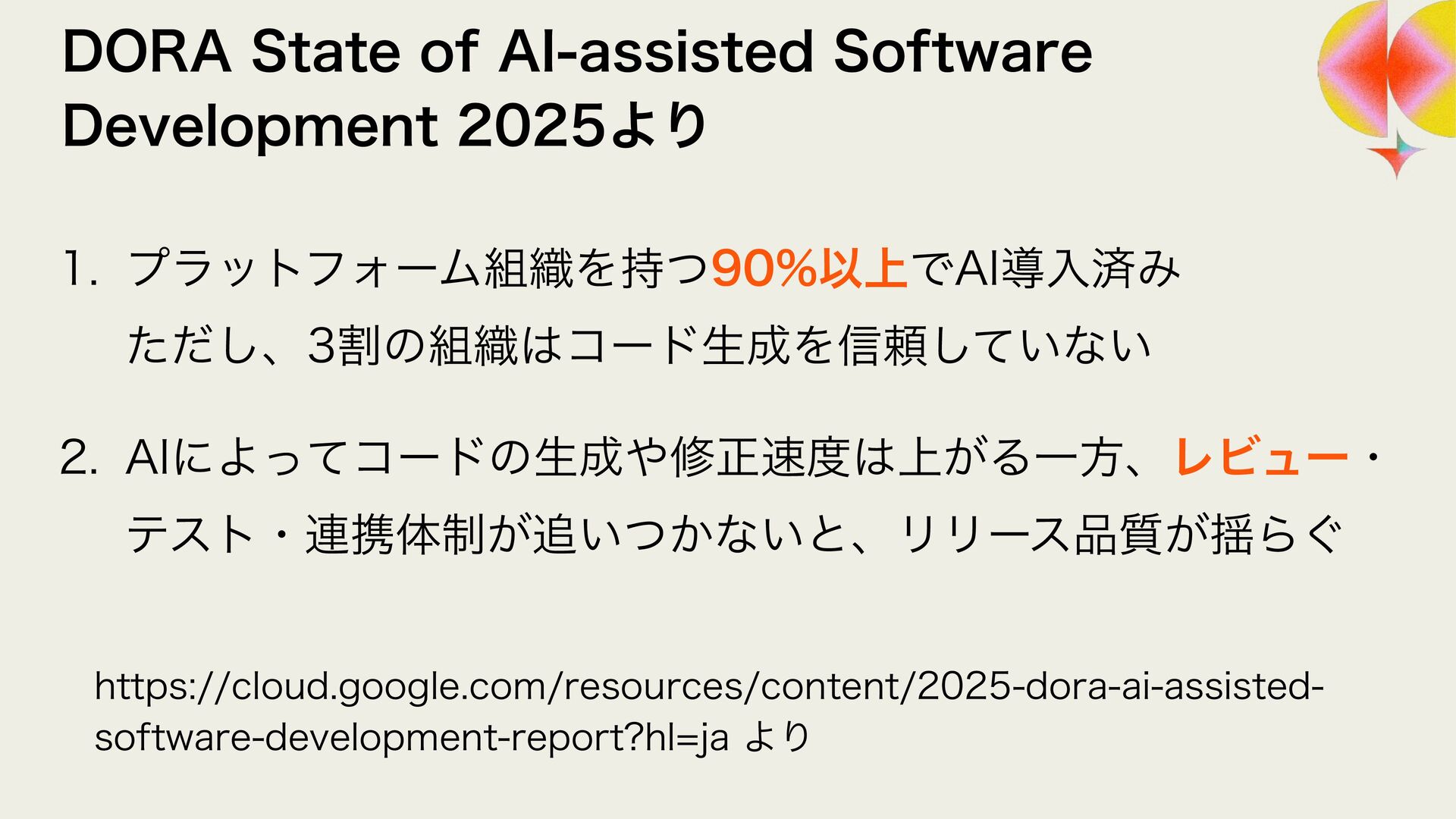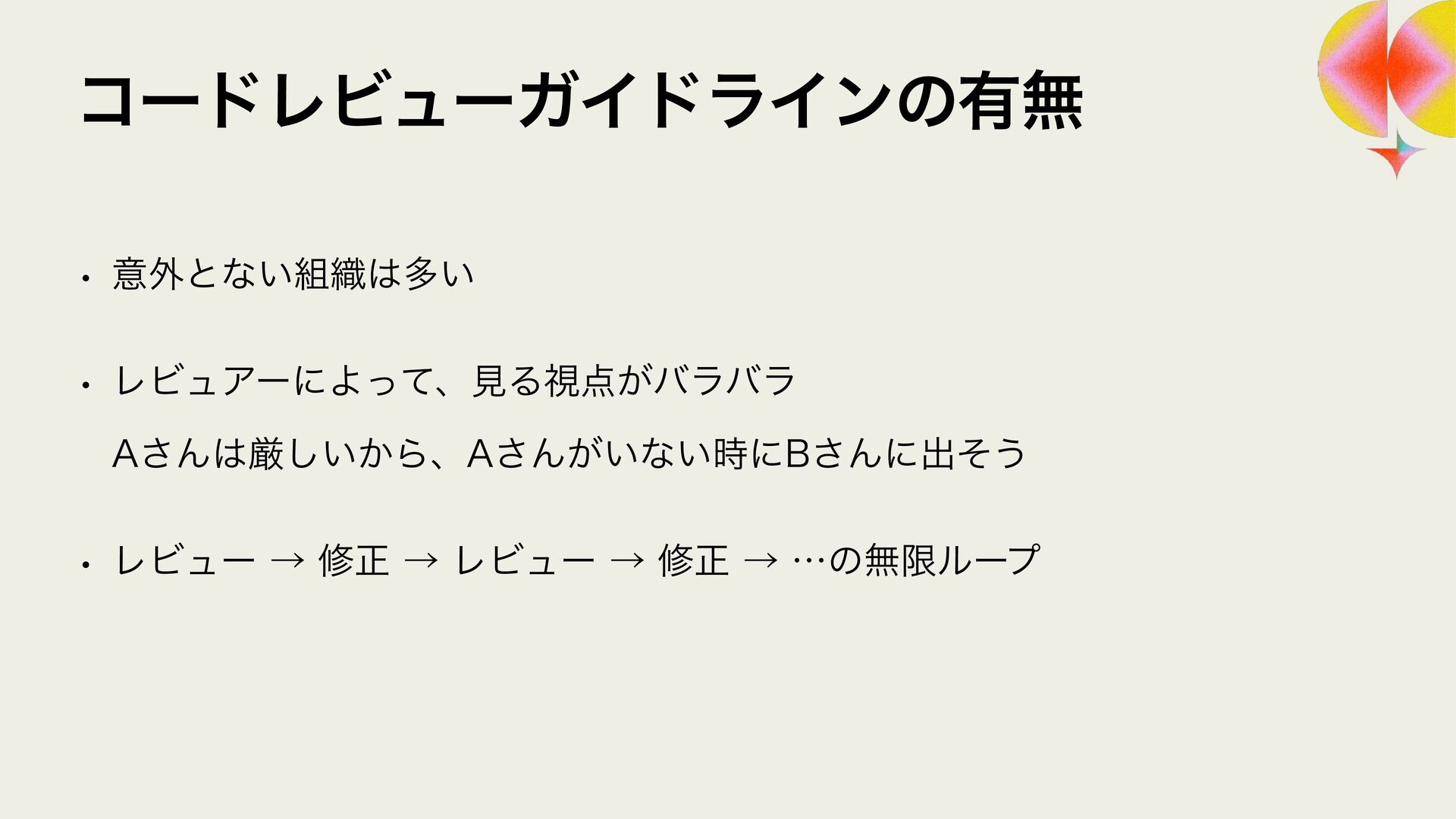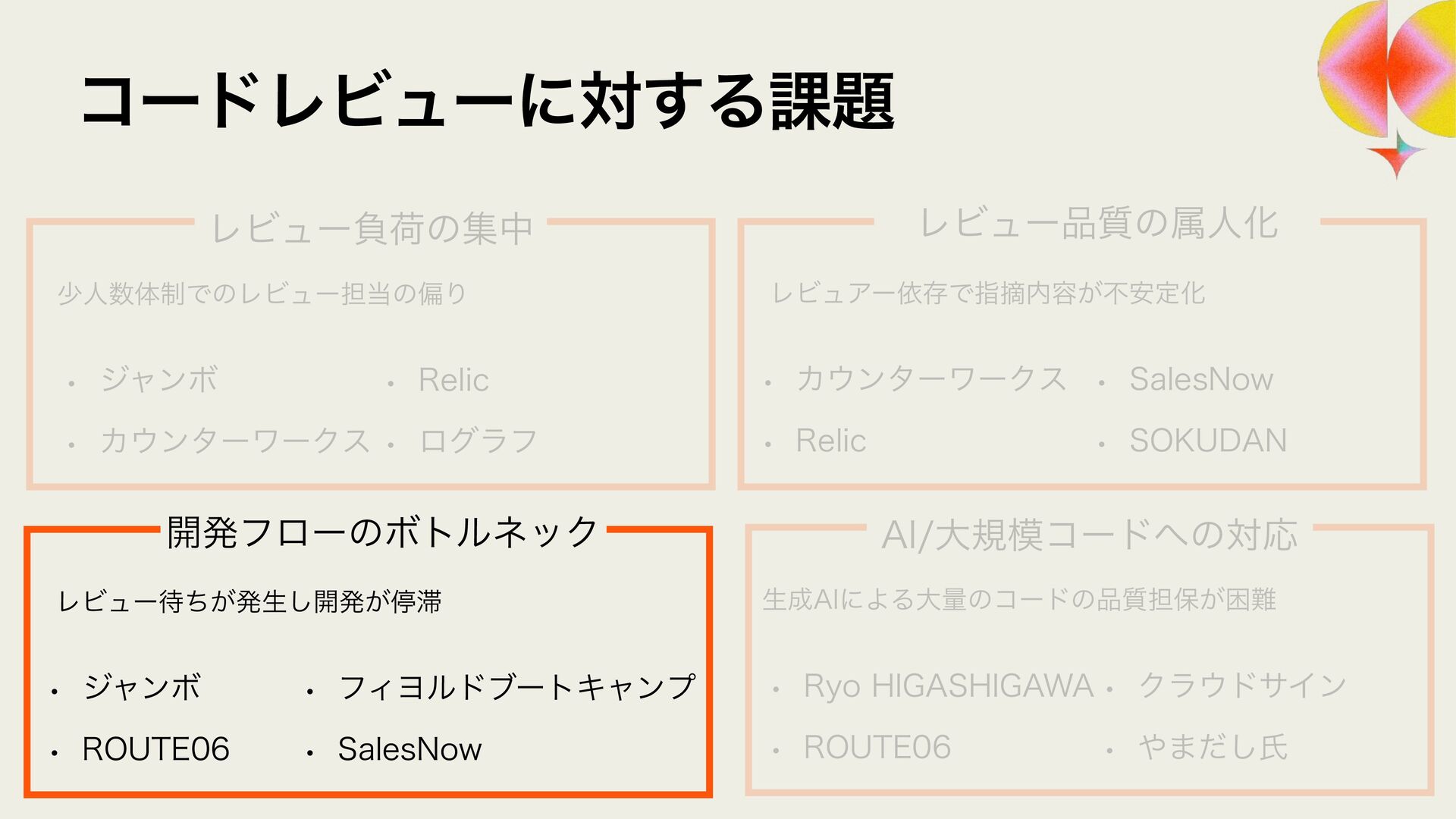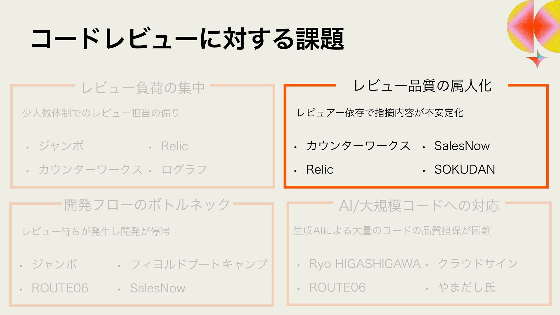 ϩάϥϑ ϨϏϡΞʔґଘͰࢦఠ಺༰͕ෆ҆ఆԽ w Χ΢ϯλʔϫʔΫε w 3FMJD ϨϏϡʔ඼࣭ͷଐਓԽ w 4BMFT/PX w 40,6%"/ ϨϏϡʔ଴͕ͪൃੜ͠։ൃ͕ఀ଺ w δϟϯϘ w 3065& ։ൃϑϩʔͷϘτϧωοΫ w ϑΟϤϧυϒʔτΩϟϯϓ w 4BMFT/PX ੜ੒"*ʹΑΔେྔͷίʔυͷ඼࣭୲อ͕ࠔ೉ w 3ZP)*("4)*("8" w 3065& "*େن໛ίʔυ΁ͷରԠ w Ϋϥ΢υαΠϯ w ΍·ͩ͠ࢯ