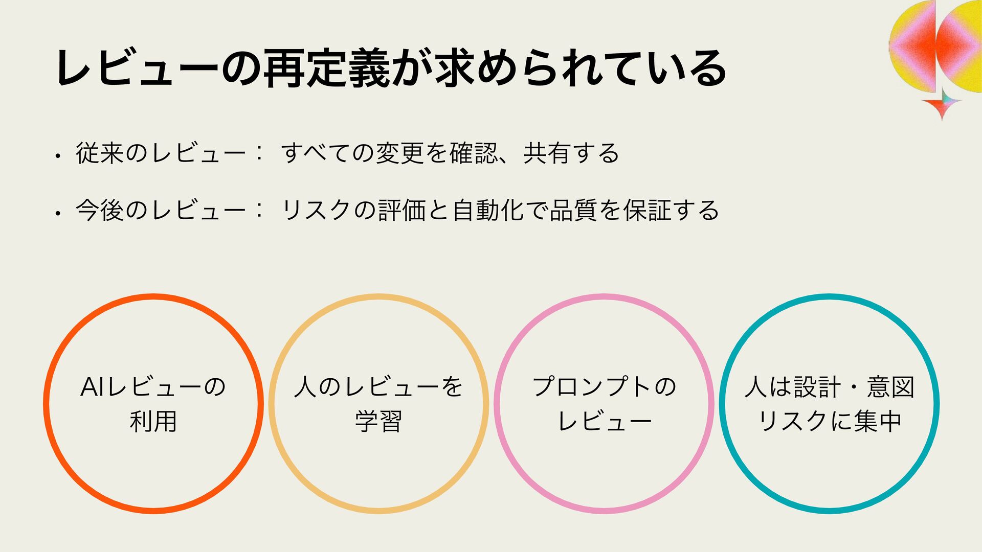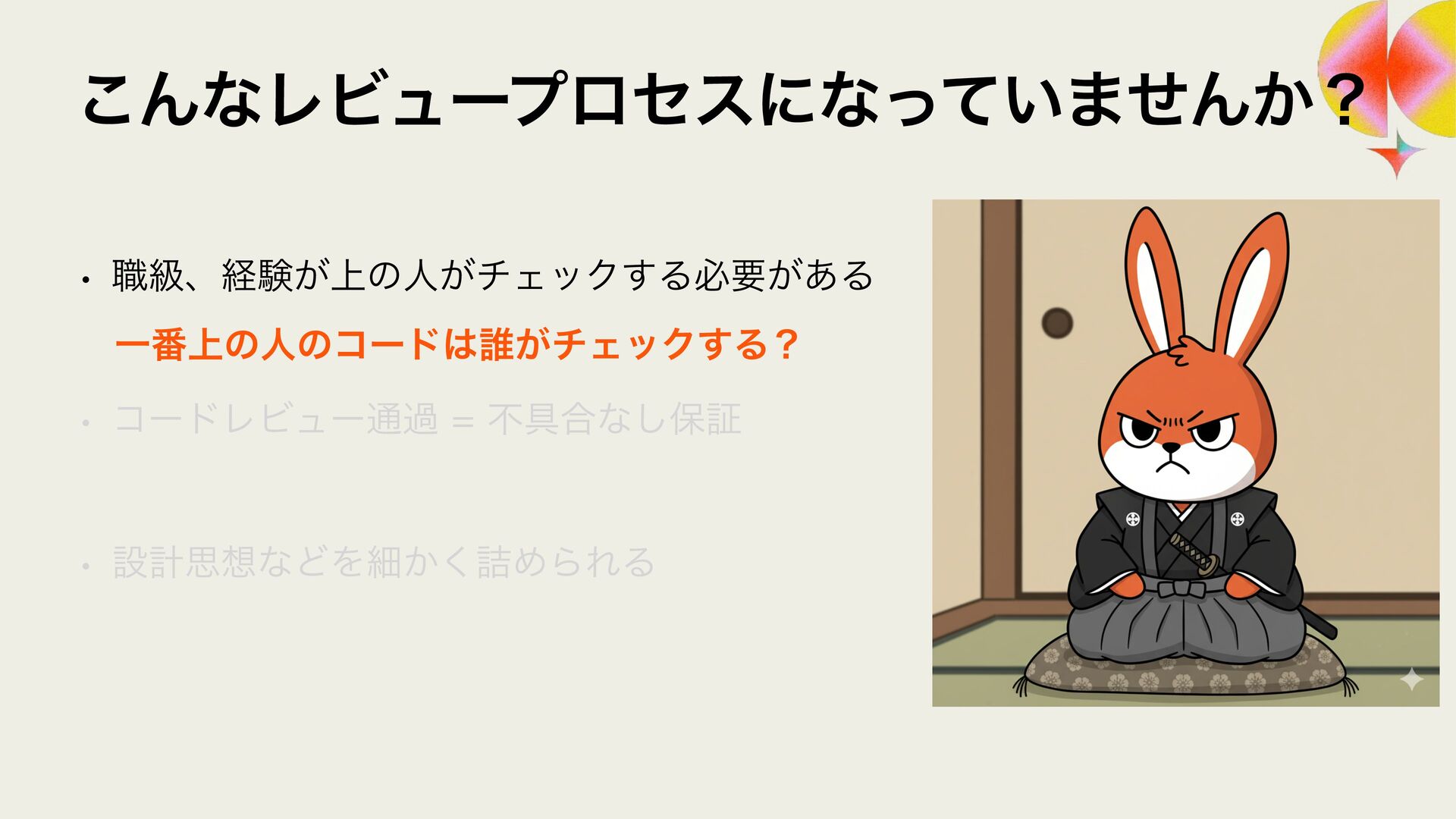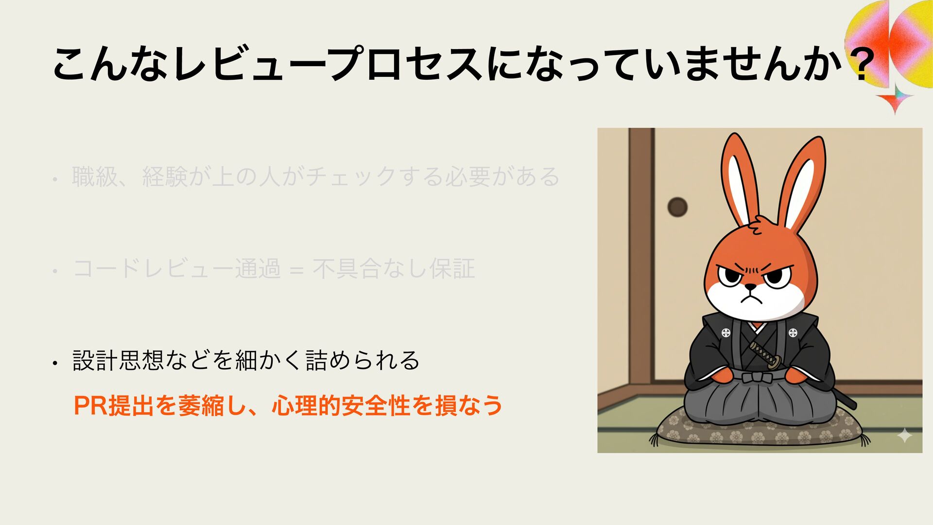 ϩάϥϑ ϨϏϡΞʔґଘͰࢦఠ಺༰͕ෆ҆ఆԽ w Χ΢ϯλʔϫʔΫε w 3FMJD ϨϏϡʔ඼࣭ͷଐਓԽ w 4BMFT/PX w 40,6%"/ ϨϏϡʔ଴͕ͪൃੜ͠։ൃ͕ఀ଺ w δϟϯϘ w 3065& ։ൃϑϩʔͷϘτϧωοΫ w ϑΟϤϧυϒʔτΩϟϯϓ w 4BMFT/PX ੜ੒"*ʹΑΔେྔͷίʔυͷ඼࣭୲อ͕ࠔ೉ w 3ZP)*("4)*("8" w 3065& "*େن໛ίʔυ΁ͷରԠ w Ϋϥ΢υαΠϯ w ΍·ͩ͠ࢯ