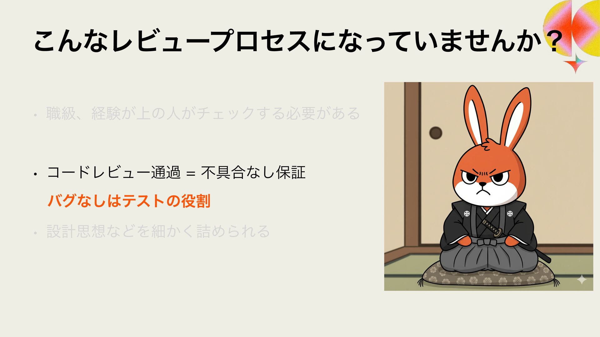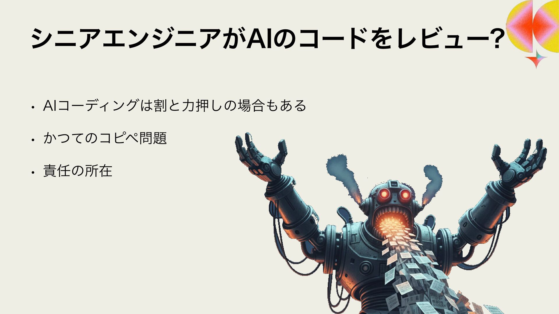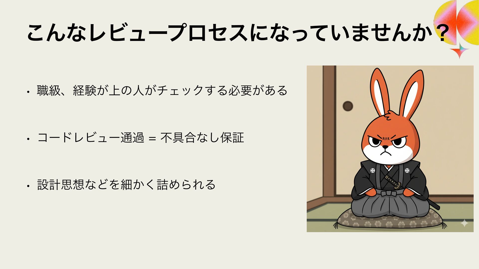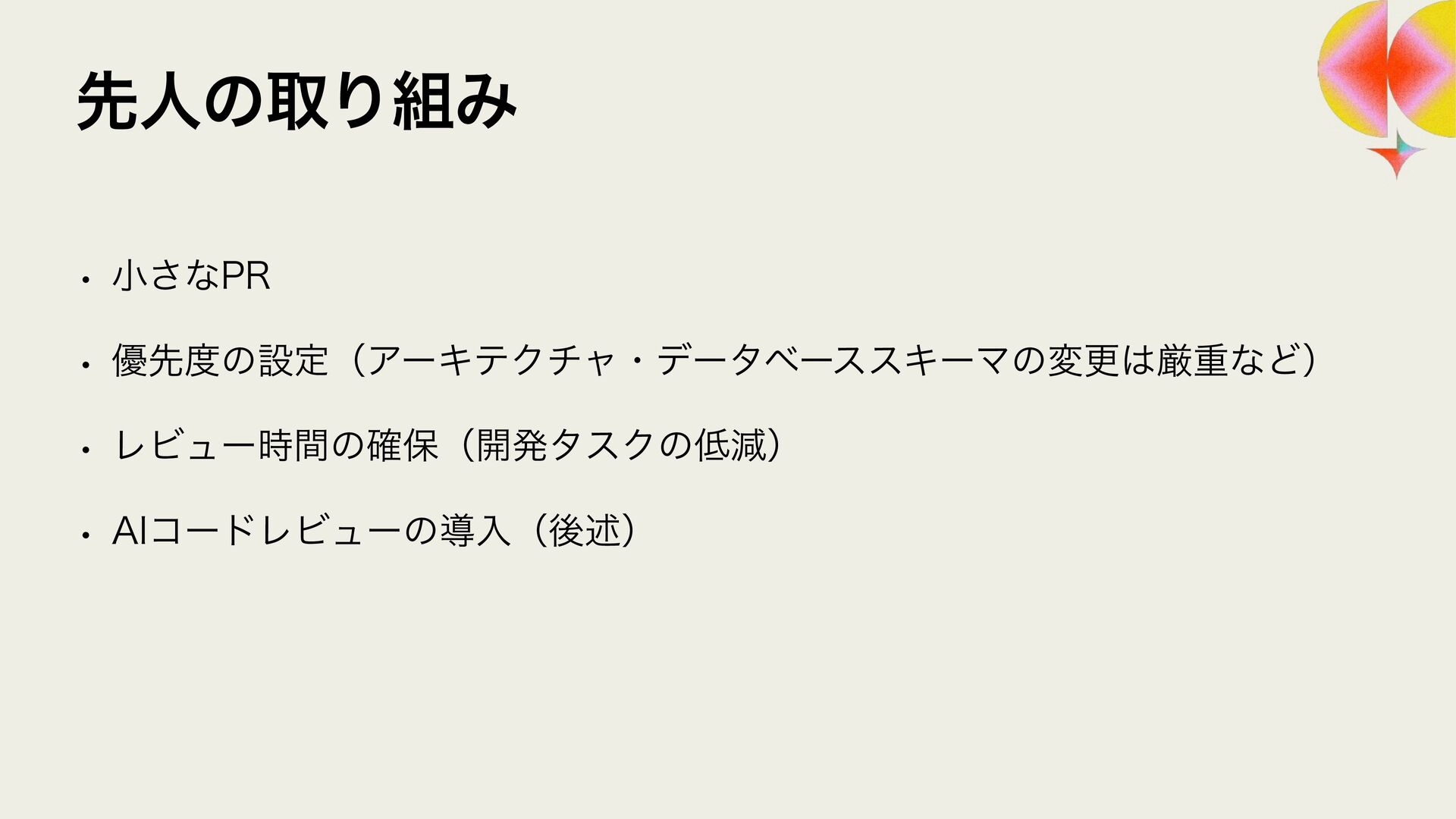 ϩάϥϑ ϨϏϡΞʔґଘͰࢦఠ಺༰͕ෆ҆ఆԽ w Χ΢ϯλʔϫʔΫε w 3FMJD ϨϏϡʔ඼࣭ͷଐਓԽ w 4BMFT/PX w 40,6%"/ ϨϏϡʔ଴͕ͪൃੜ͠։ൃ͕ఀ଺ w δϟϯϘ w 3065& ։ൃϑϩʔͷϘτϧωοΫ w ϑΟϤϧυϒʔτΩϟϯϓ w 4BMFT/PX ੜ੒"*ʹΑΔେྔͷίʔυͷ඼࣭୲อ͕ࠔ೉ w 3ZP)*("4)*("8" w 3065& "*େن໛ίʔυ΁ͷରԠ w Ϋϥ΢υαΠϯ w ΍·ͩ͠ࢯ