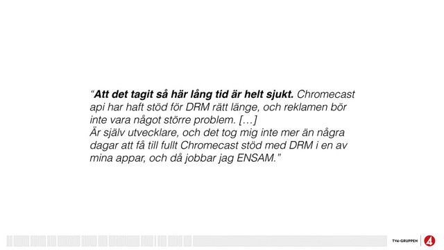 Chromecast api har haft stöd för DRM rätt länge, och reklamen bör inte vara något större problem. […] Är själv utvecklare, och det tog mig inte mer än några dagar att få till fullt Chromecast stöd med DRM i en av mina appar, och då jobbar jag ENSAM.”