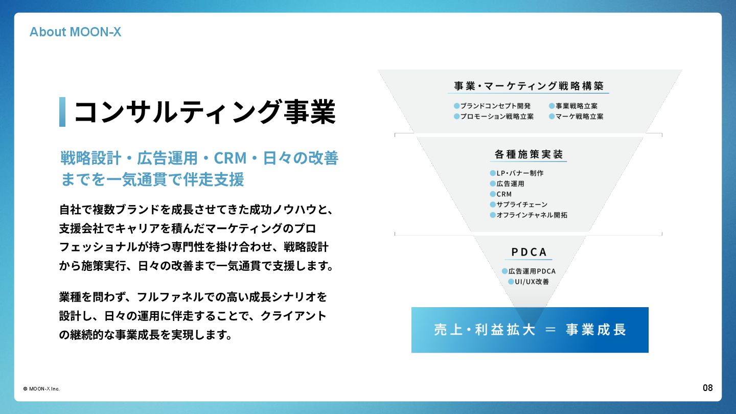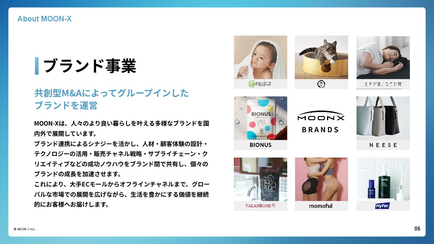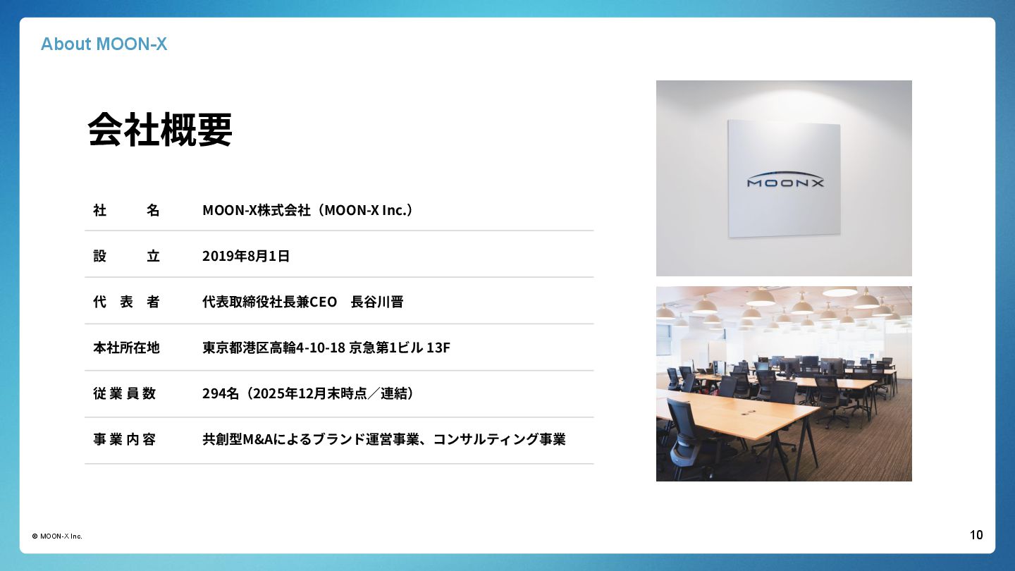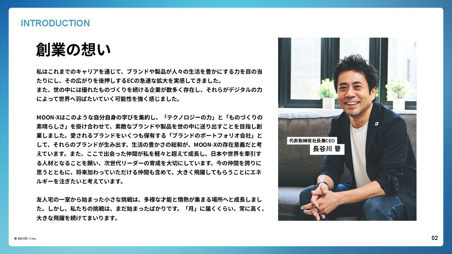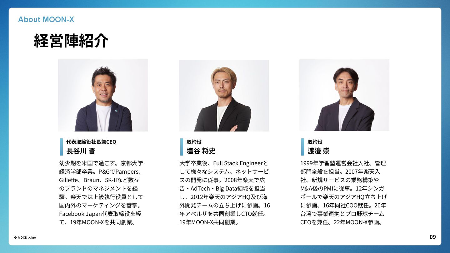 代表取締役社⻑兼CEO ⻑⾕川 晋 取締役 渡邉 崇 幼少期を⽶国で過ごす。京都⼤学 経済学部卒業。P&GでPampers、 Gillette、Braun、SK-IIなど数々 のブランドのマネジメントを経 験。楽天では上級執⾏役員として 国内外のマーケティングを管掌。 Facebook Japan代表取締役を経 て、19年MOON-Xを共同創業。 ⼤学卒業後、Full Stack Engineerと して様々なシステム、ネットサービ スの開発に従事。2008年楽天で広 告‧AdTech‧Big Data領域を担当 し、2012年楽天のアジアHQ及び海 外開発チームの⽴ち上げに参画。16 年アペルザを共同創業しCTO就任。 19年MOON-X共同創業。 1999年学習塾運営会社⼊社、管理 部⾨全般を担当。2007年楽天⼊ 社、新規サービスの業務構築や M&A後のPMIに従事。12年シンガ ポールで楽天のアジアHQ⽴ち上げ に参画、16年同社COO就任。20年 台湾で事業連携とプロ野球チーム CEOを兼任。22年MOON-X参画。