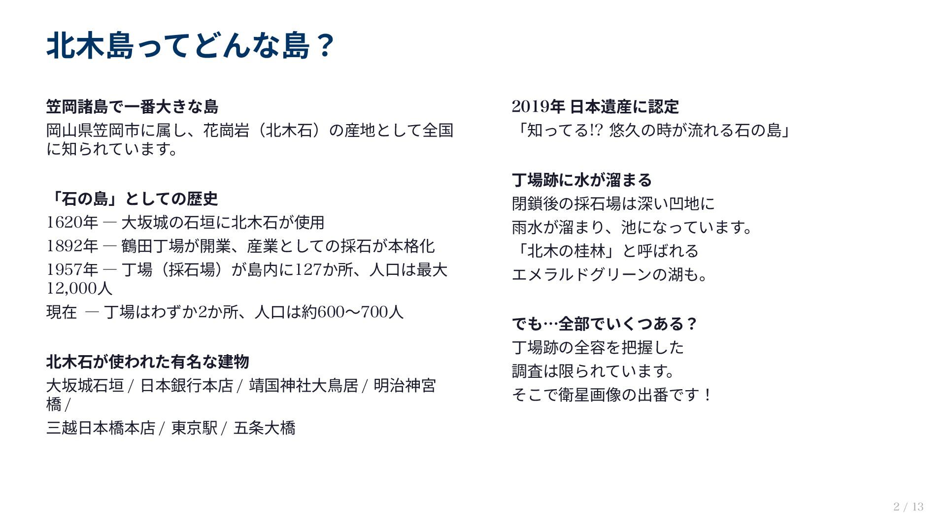 北木島ってどんな島? 2 / 13 笠岡諸島で一番大きな島 岡山県笠岡市に属し、花崗岩(北木石)の産地として全国 に知られています。 「石の島」としての歴史 1620年 —