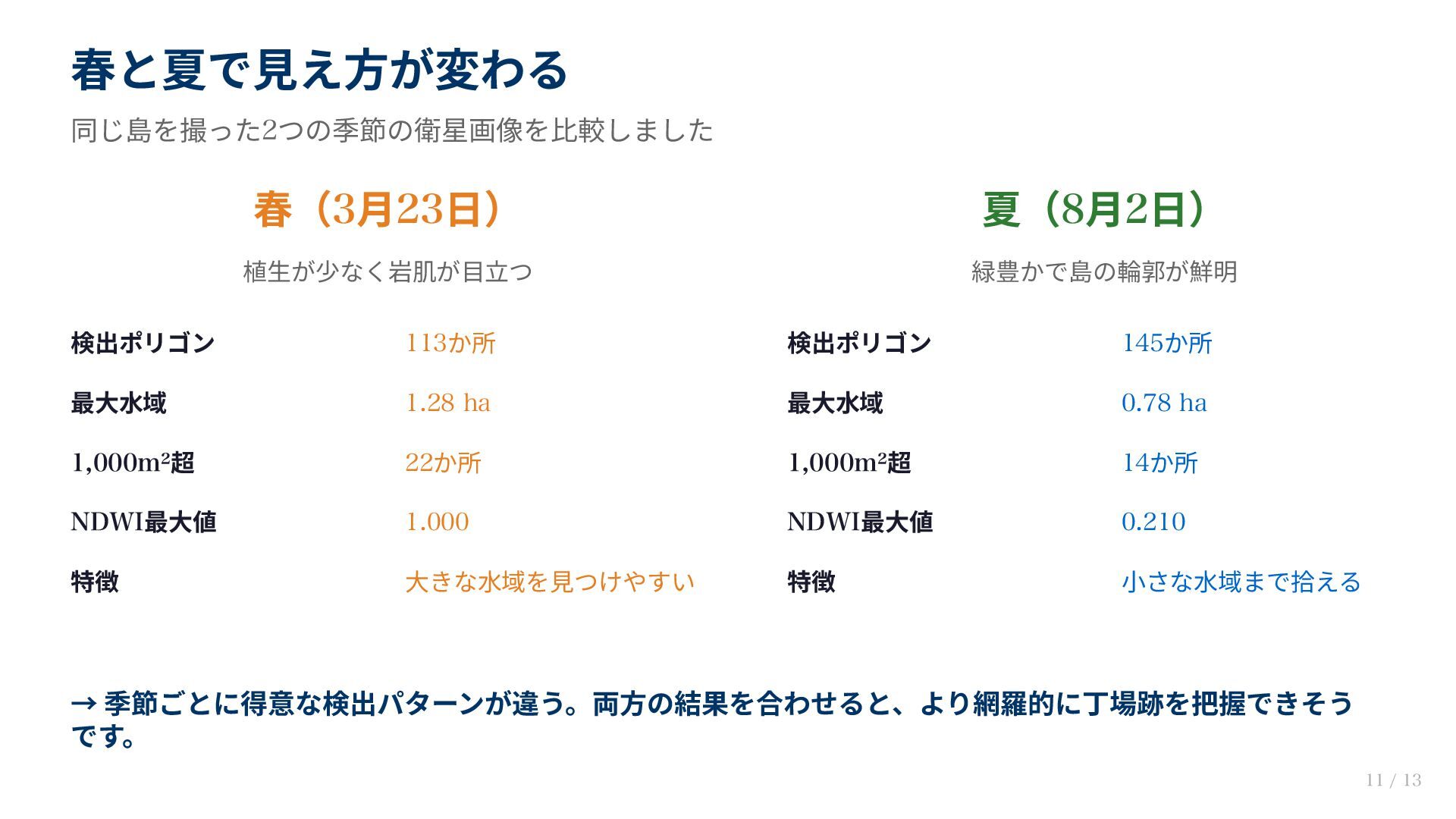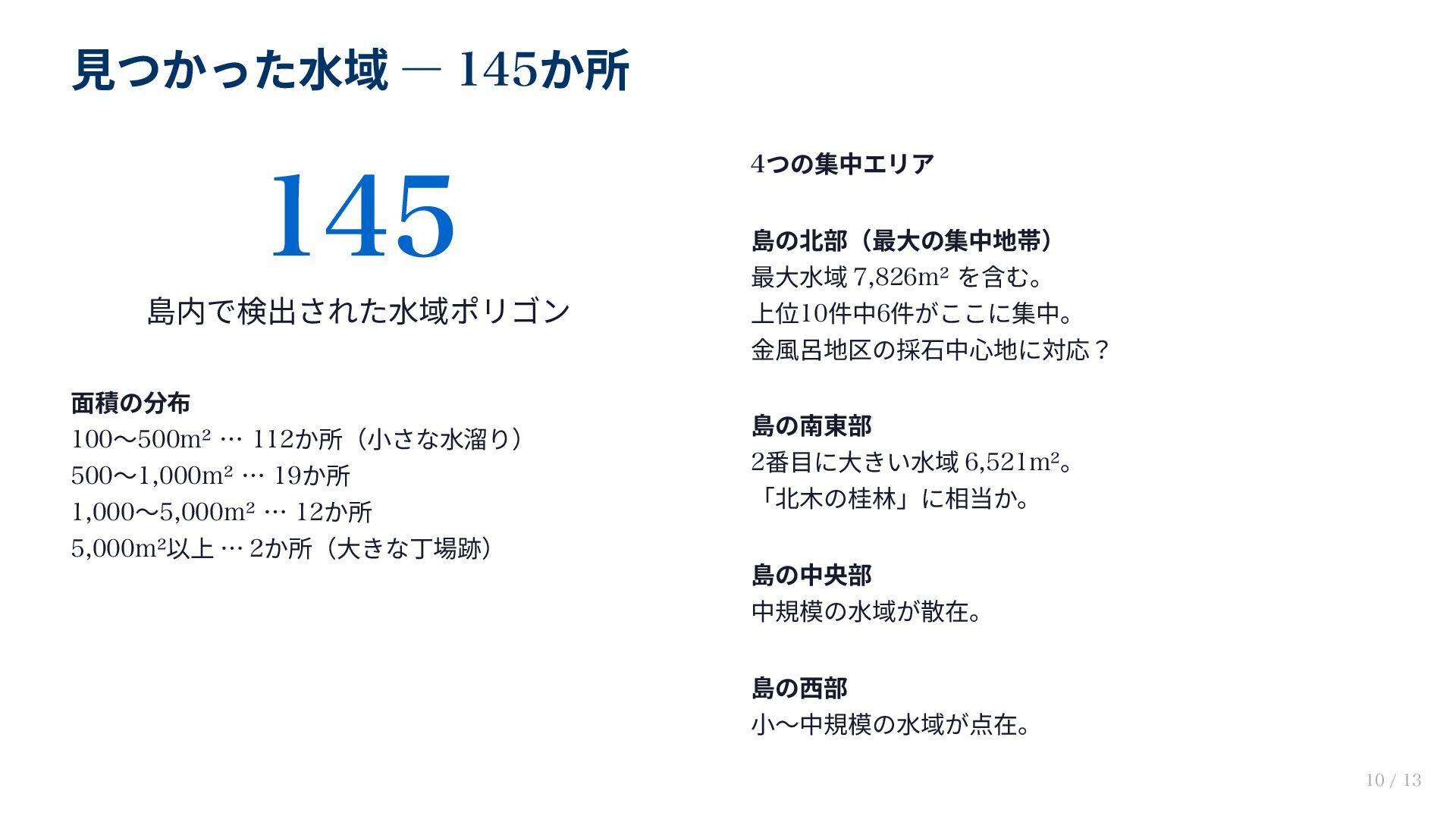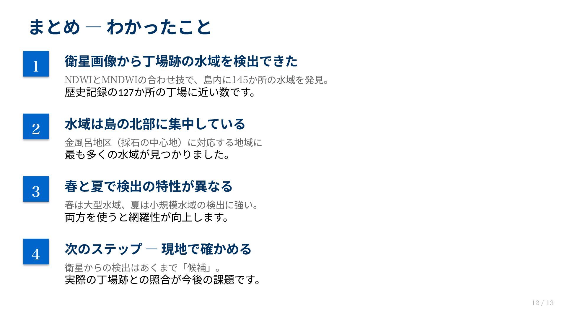 まとめ — わかったこと 12 / 13 1 1 衛星画像から丁場跡の水域を検出できた NDWIとMNDWIの合わせ技で、島内に145か所の水域を発見。