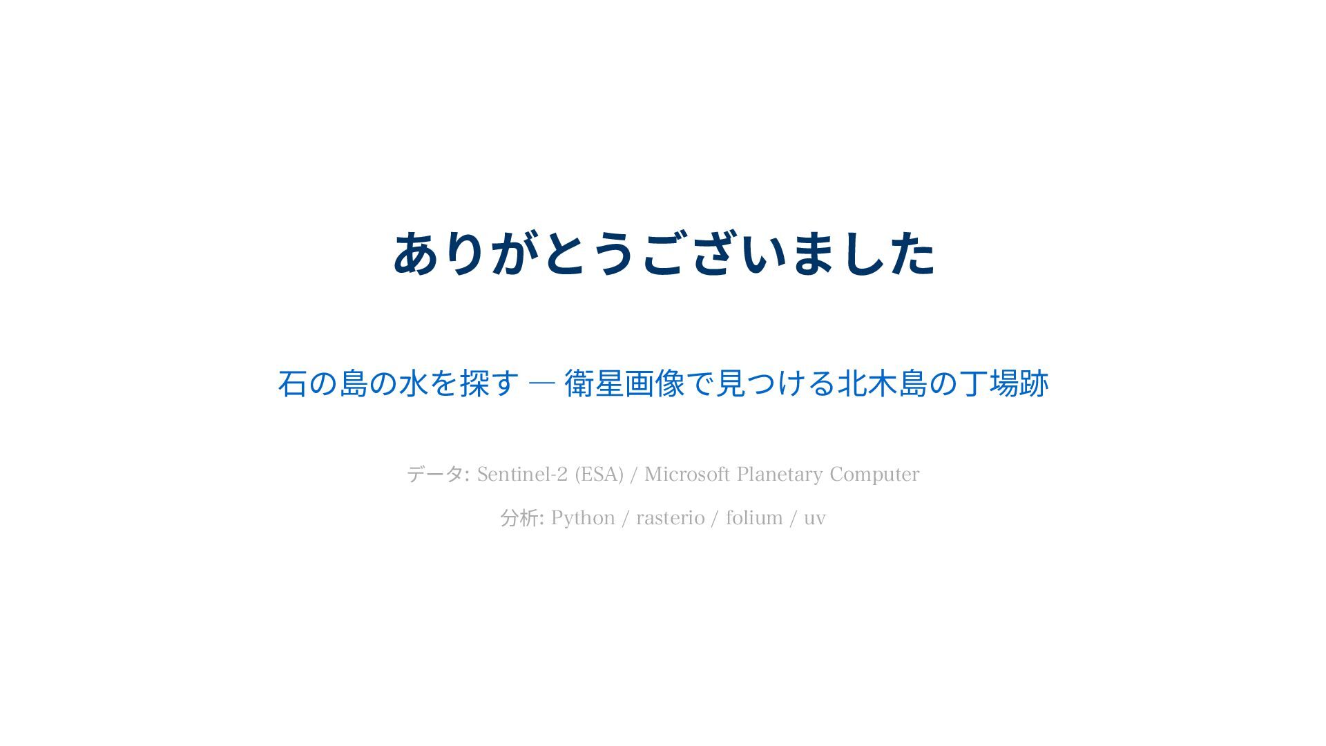 ありがとうございました 石の島の水を探す — 衛星画像で見つける北木島の丁場跡 データ: Sentinel-2 (ESA) / Microsoft Planetary