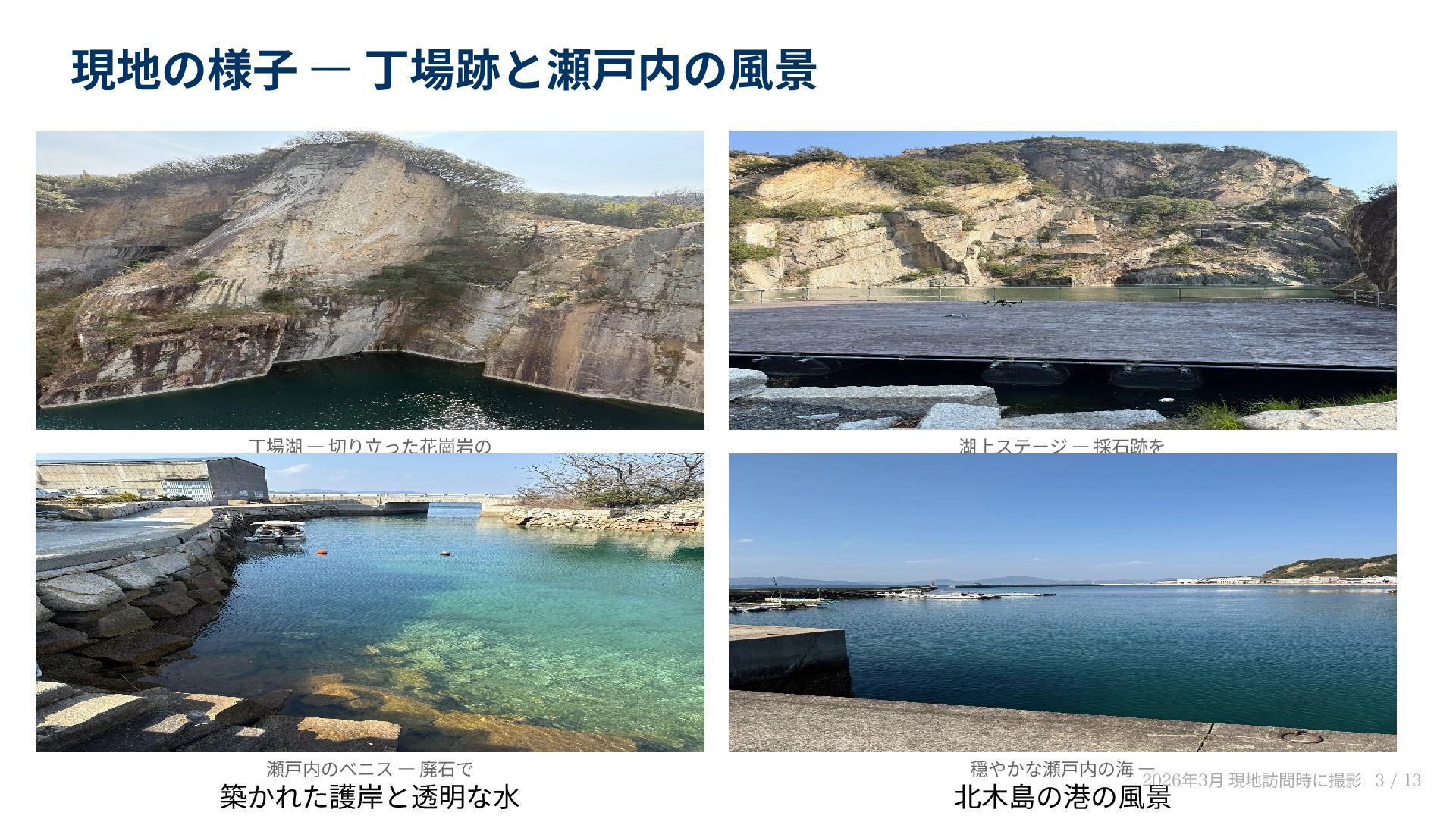 湖上ステージ — 採石跡を 活用したイベント会場 瀬戸内のベニス — 廃石で 築かれた護岸と透明な水 穏やかな瀬戸内の海 — 北木島の港の風景 2026年3月 現地訪問時に撮影