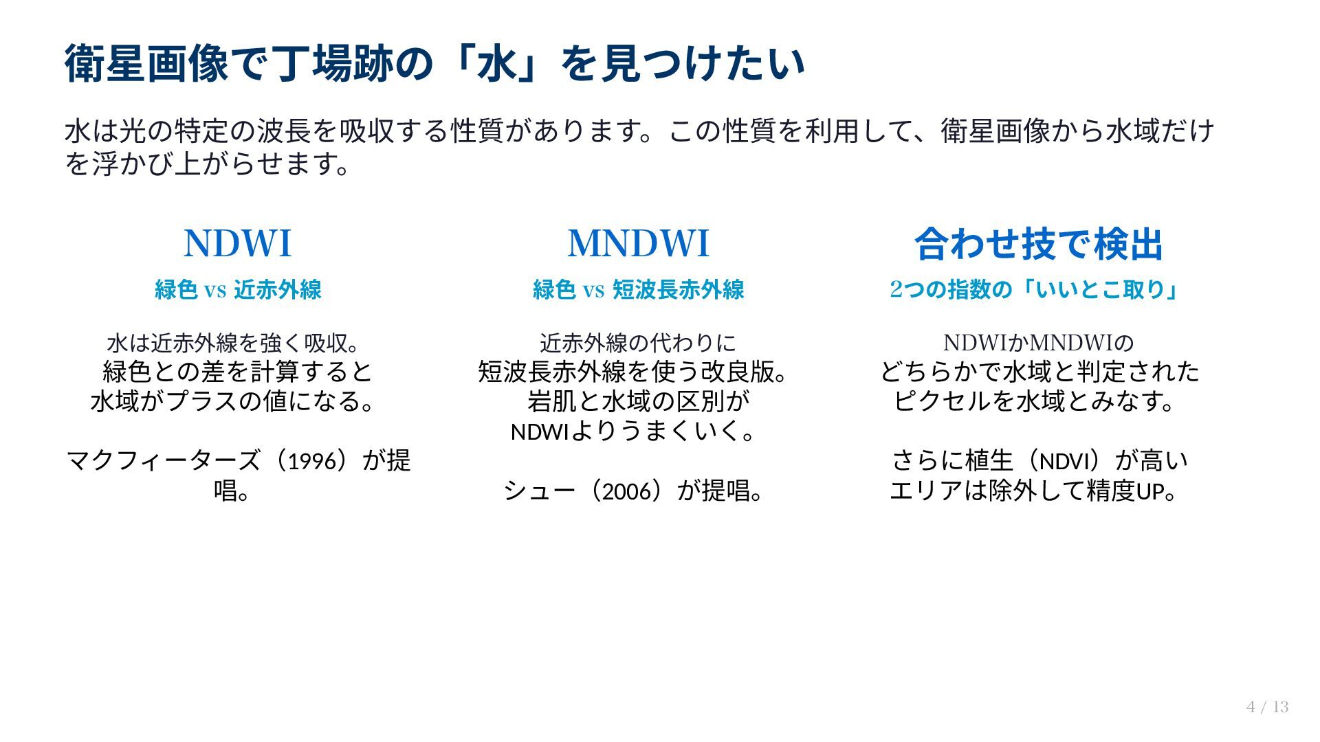水は近赤外線を強く吸収。 緑色との差を計算すると 水域がプラスの値になる。 マクフィーターズ(1996)が提 唱。 MNDWI 緑色 vs 短波長赤外線 近赤外線の代わりに 短波長赤外線を使う改良版。 岩肌と水域の区別が NDWIよりうまくいく。 シュー(2006)が提唱。 合わせ技で検出 2つの指数の「いいとこ取り」 NDWIかMNDWIの どちらかで水域と判定された ピクセルを水域とみなす。 さらに植生(NDVI)が高い エリアは除外して精度UP。